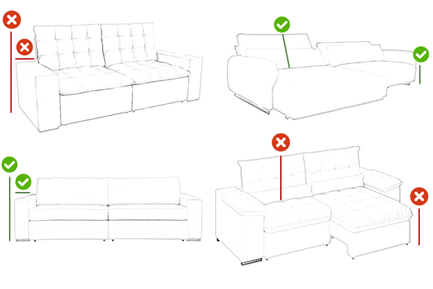 A altura e ângulo do encosto: quanto mais alto o encosto, mais o sofá vai passar a impressão de que é grande demais para o ambiente. Muitos retráteis têm encosto reclinável alto demais, com “sobra” de encosto mesmo para as pessoas mais altas encostarem a cabeça.