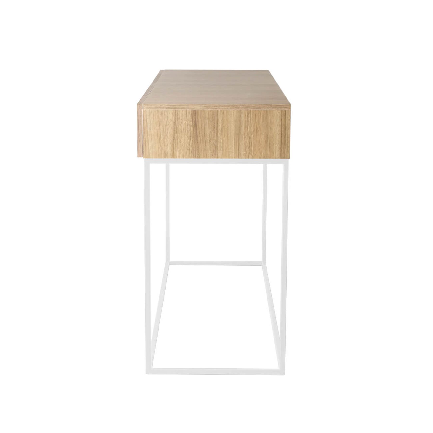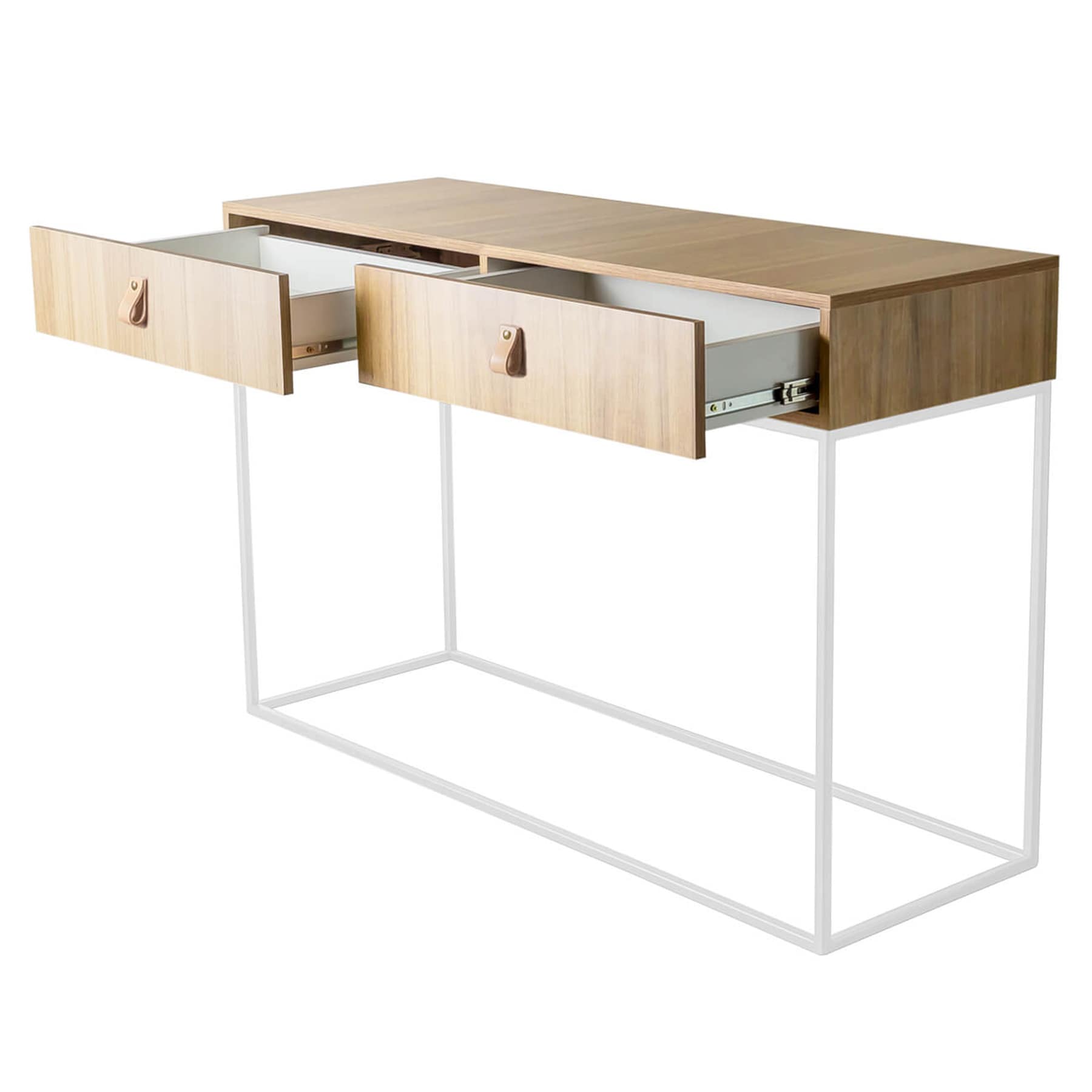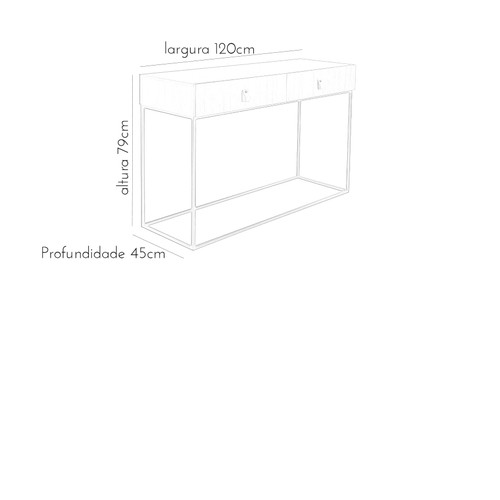 Base produzida em tubo de aço carbono de 15mm com pintura eletrostática na cor selecionada. Caixa produzida em MDF Duratex® com acabamento em melamina BP (com relevos da madeira). Gavetas com corrediças telescópicas. Puxadores em couro natural. *Produto entregue montado.