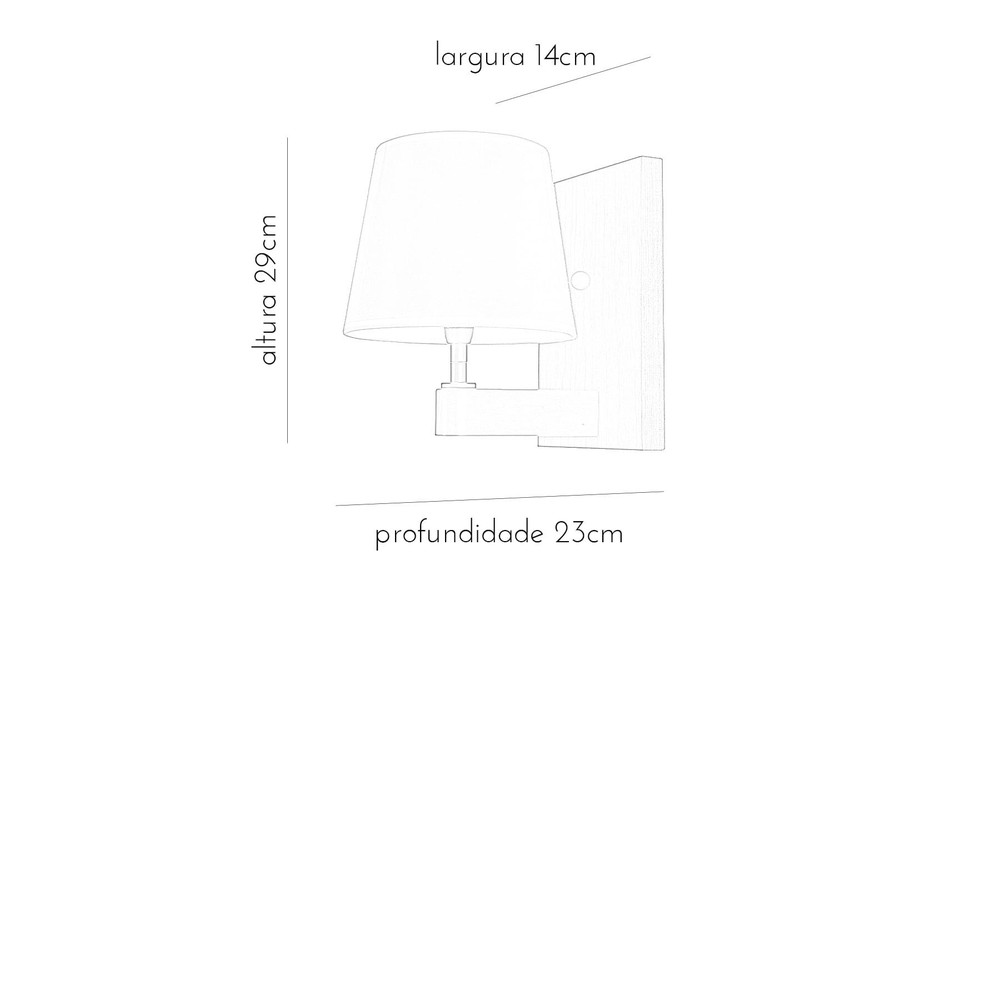 Base em madeira maciça, suporte da lâmpada em aço carbono com pintura epóxi preta e cúpula em 100% algodão. Fiação para fixação da parede, necessária instalação profissional em caixa de luz. Para lâmpada com soquete tipo E27. *A lâmpada não acompanha o produto.