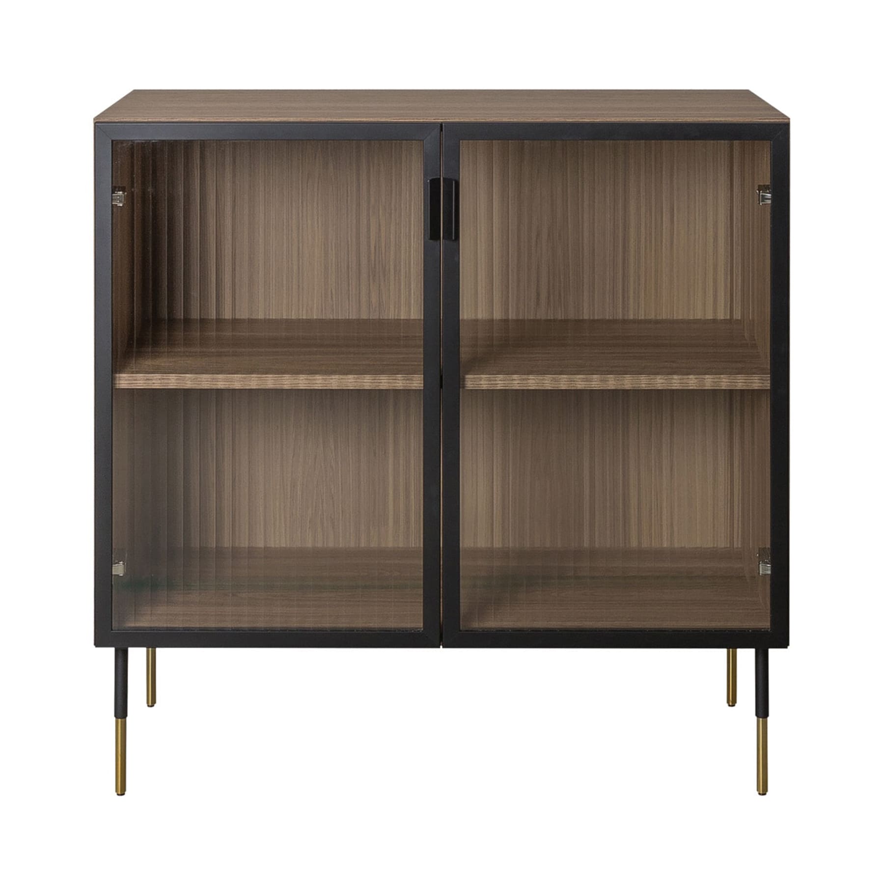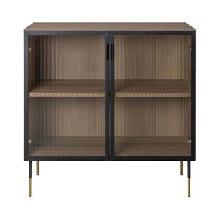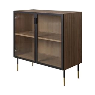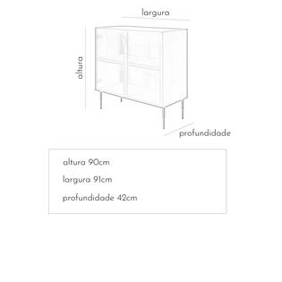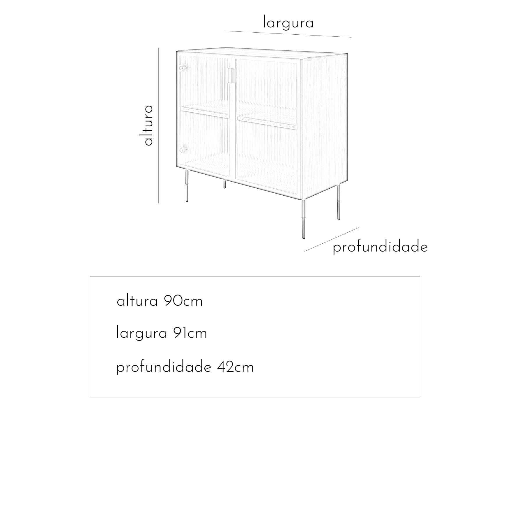 Caixa em MDF de 18mm com acabamento em melamina BP padrão louro freijó. Pés em aço carbono com pintura epóxi na parte preta e latão polido (dourado). Portas com estrutura e puxadores em alumínio com pintura eletrostática e vidro temperado canelado.*Produto entregue montado.