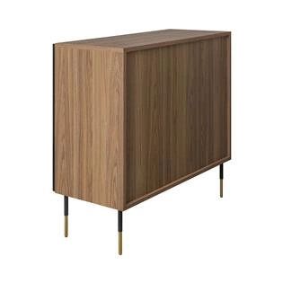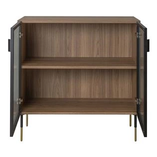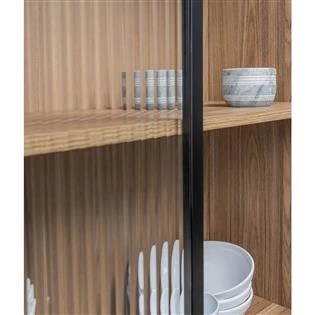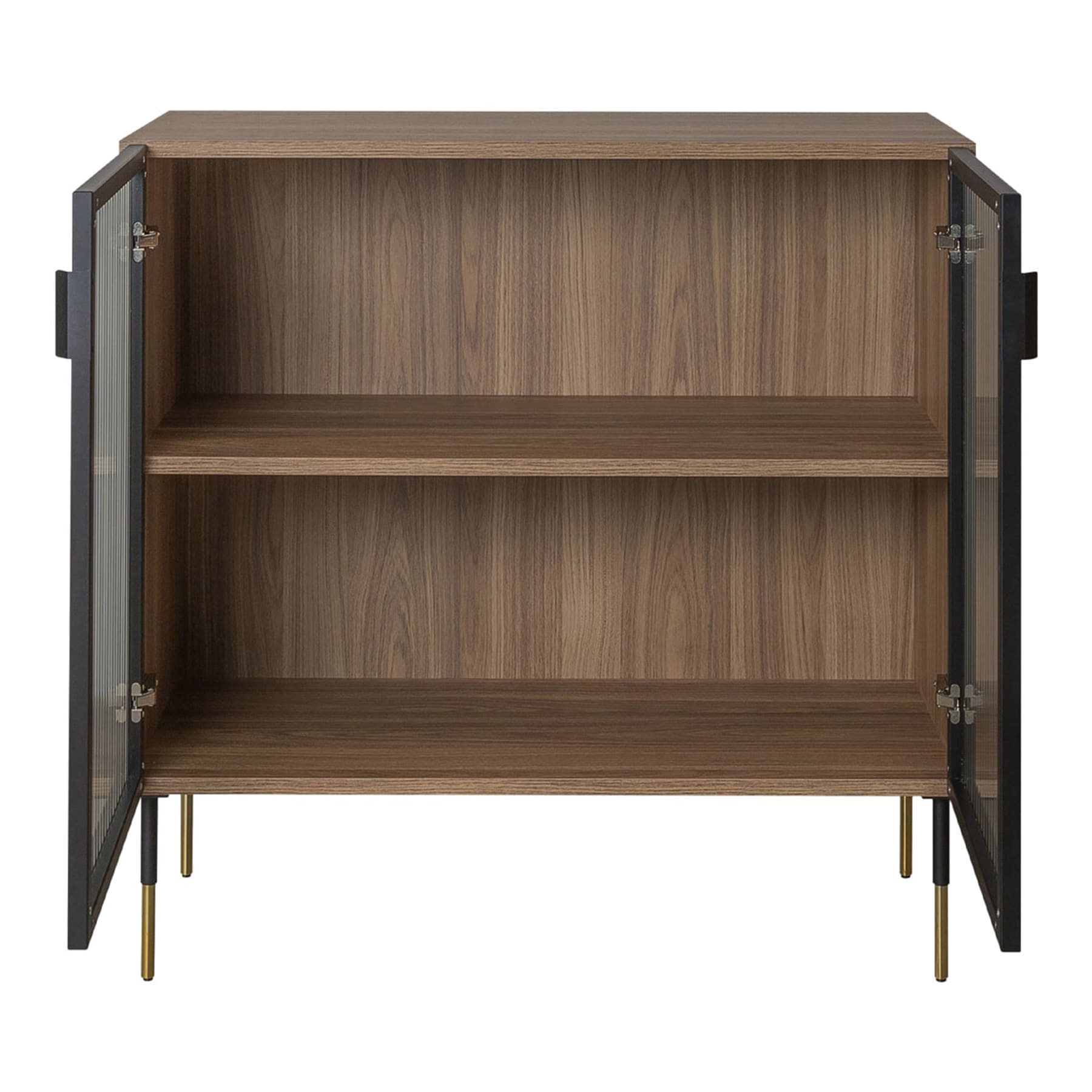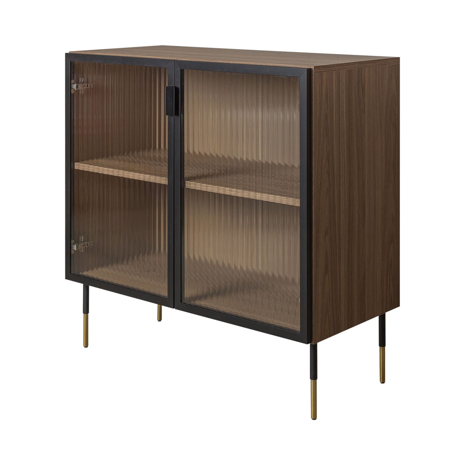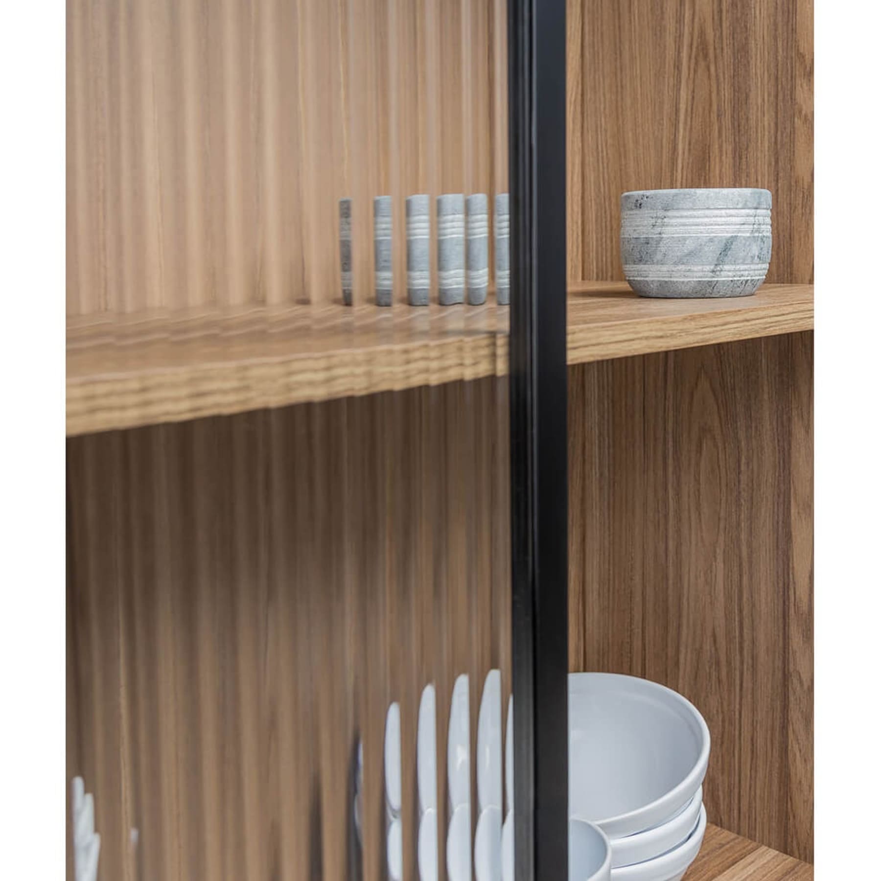 Caixa em MDF de 18mm com acabamento em melamina BP padrão louro freijó. Pés em aço carbono com pintura epóxi na parte preta e latão polido (dourado). Portas com estrutura e puxadores em alumínio com pintura eletrostática e vidro temperado canelado.*Produto entregue montado.