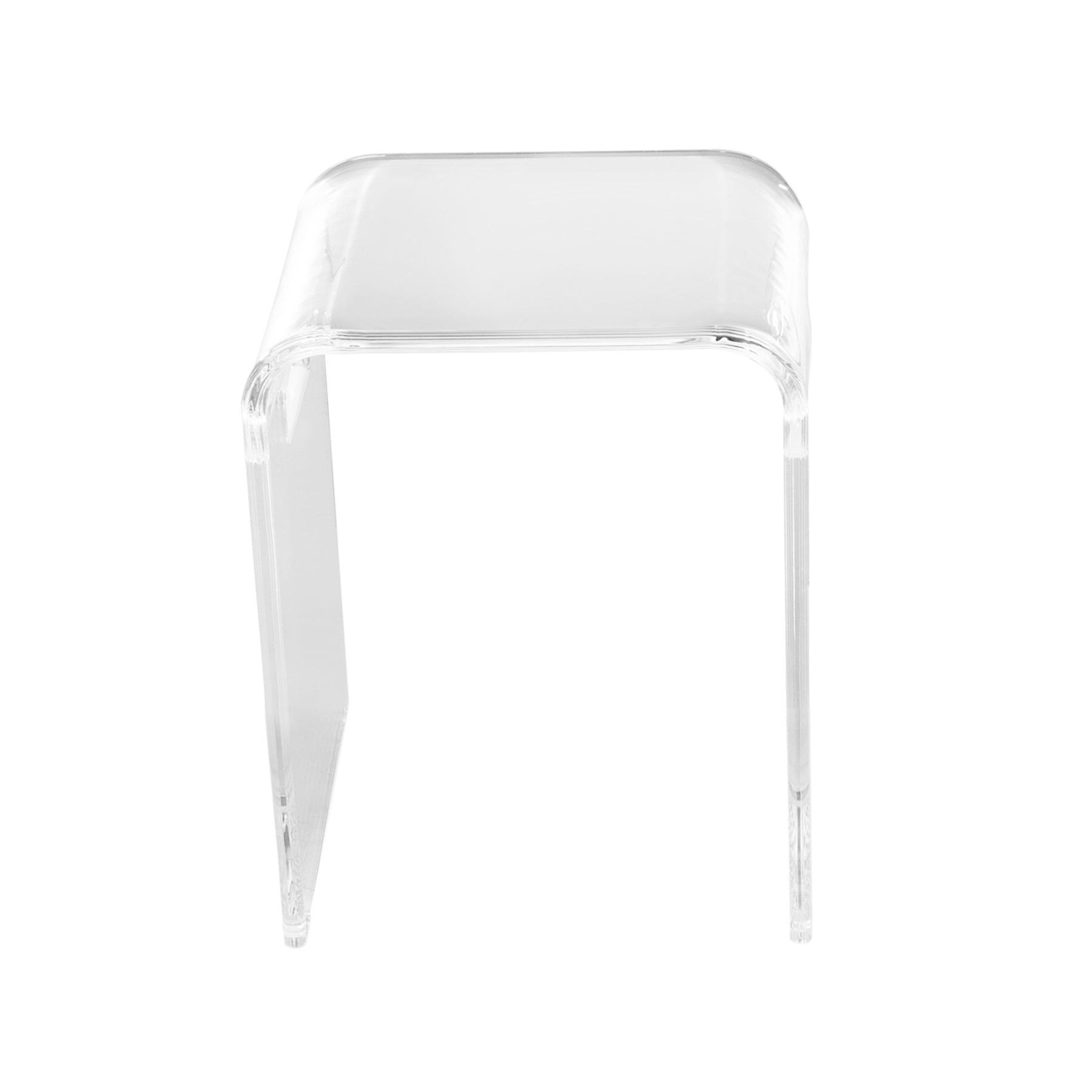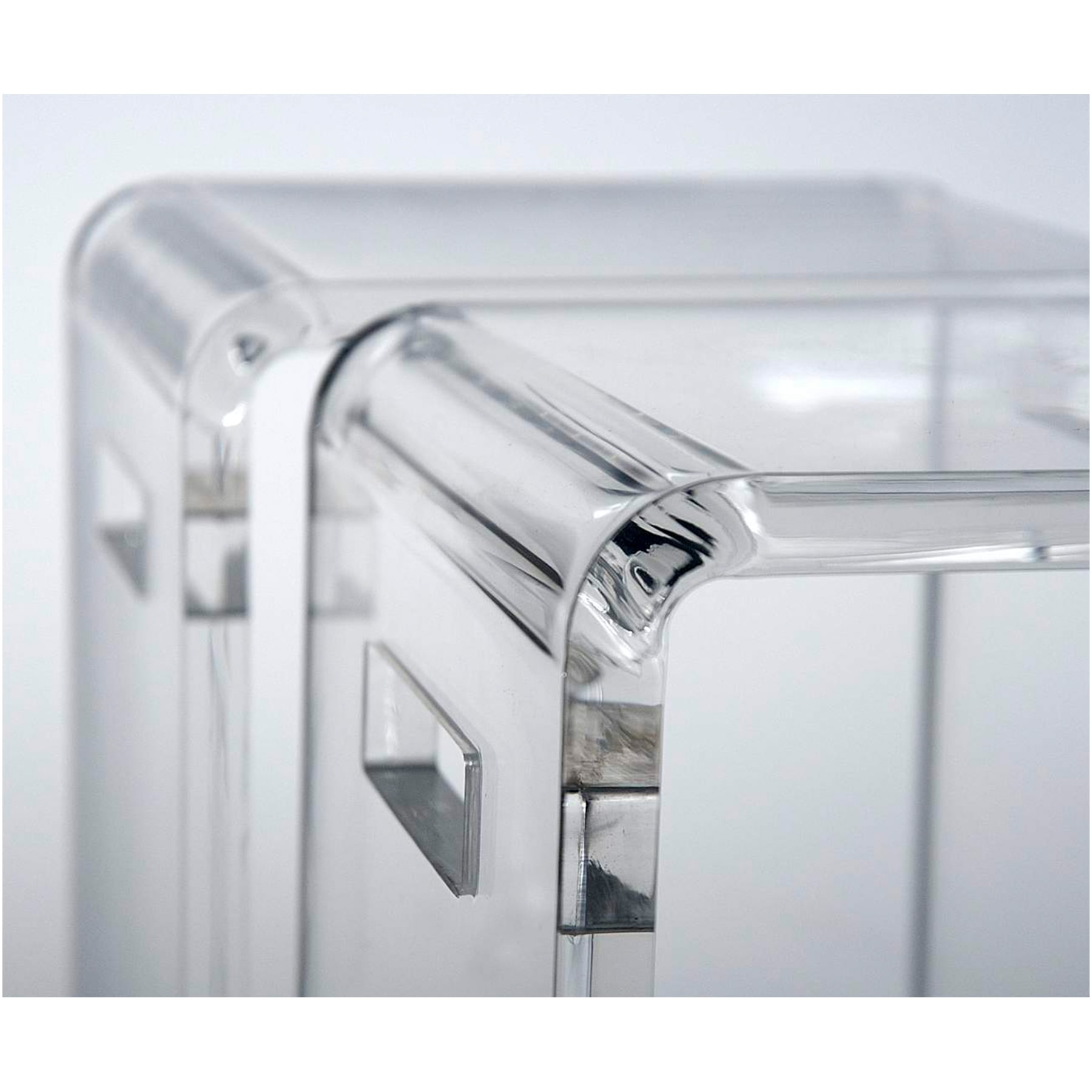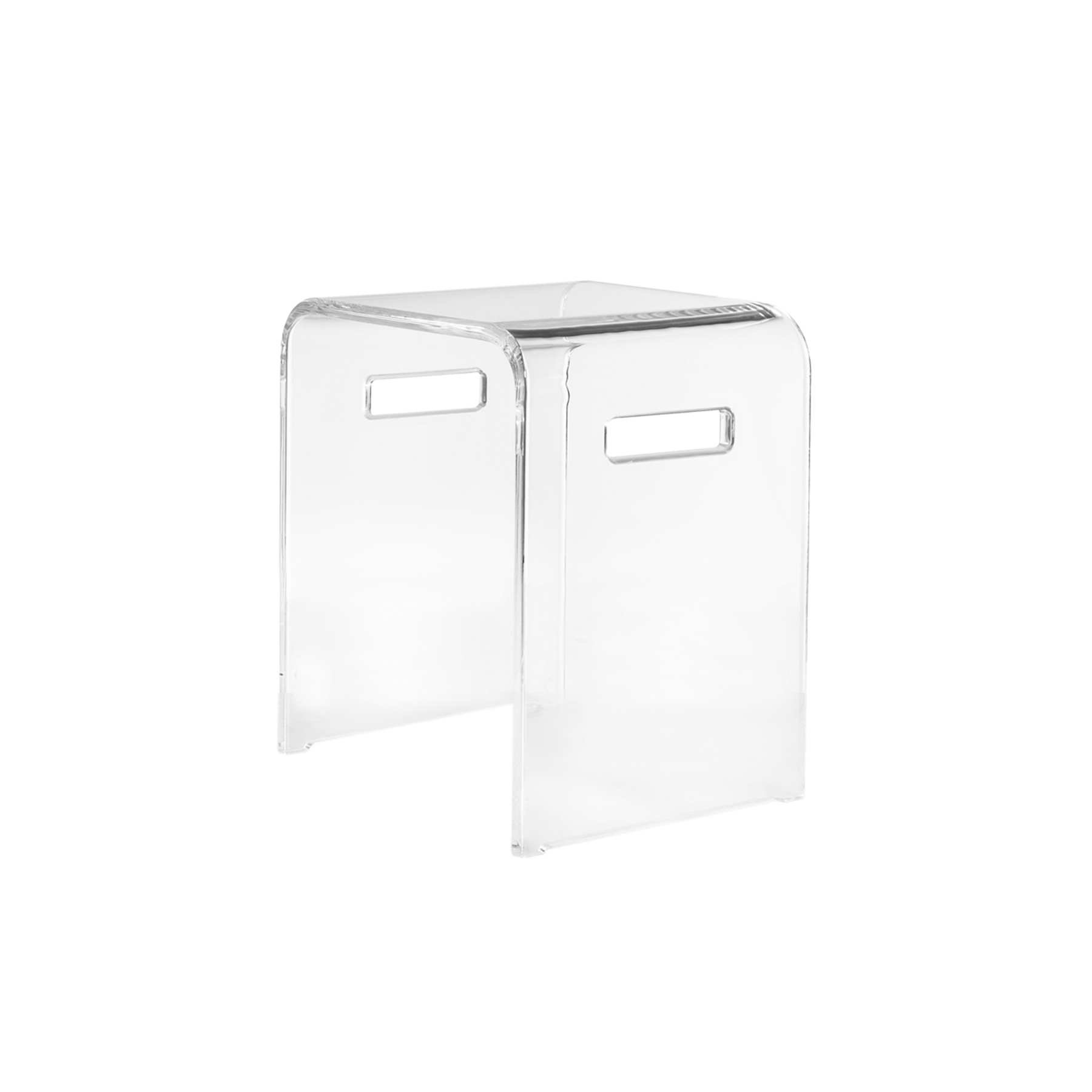 O acrílico é um clássico na decoração. Sempre moderno, se faz presente em ambientes modernos e sofisticados. O metacrilato de 15mm permite um acabamento impecável e de altíssima qualidade às peças. O banco clean também pode ser usado como mesa lateral.