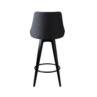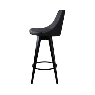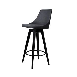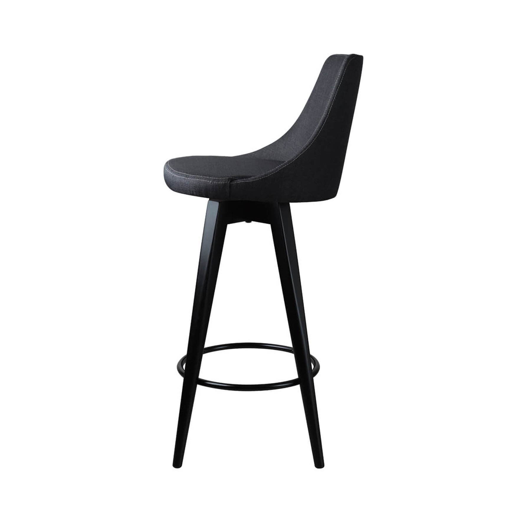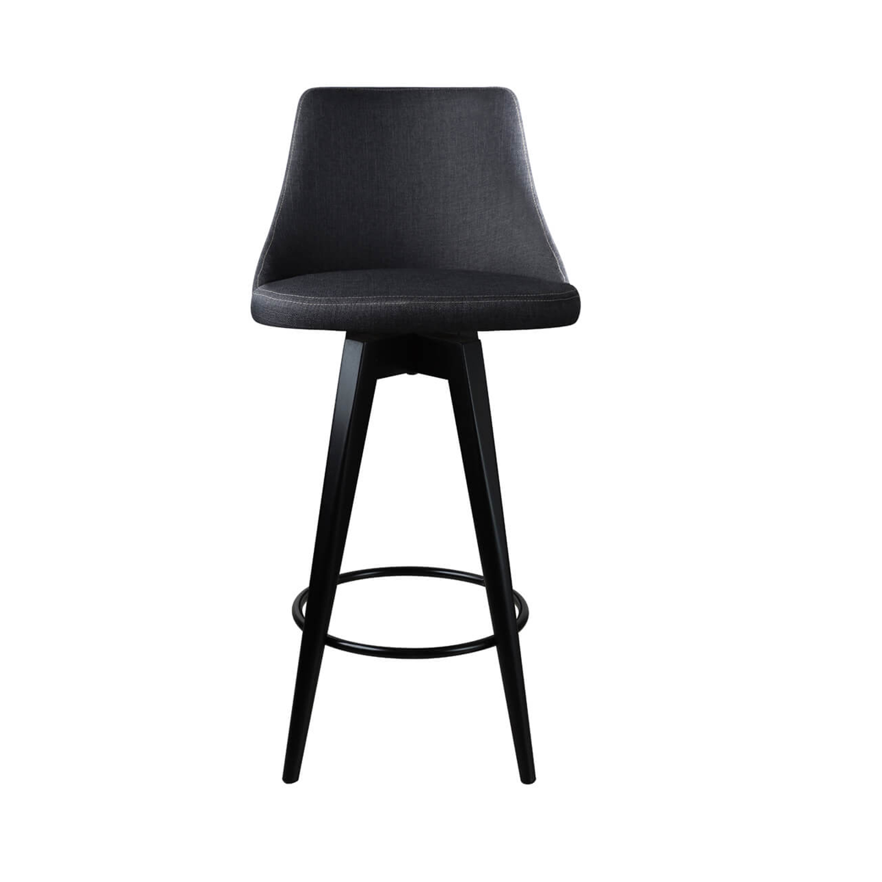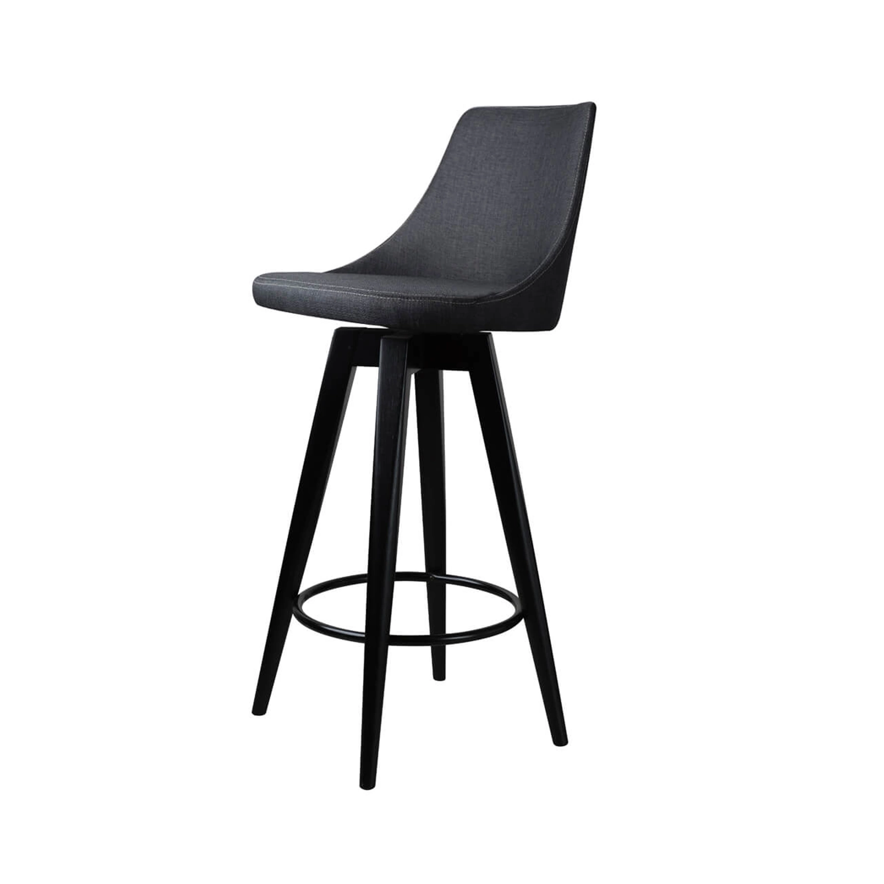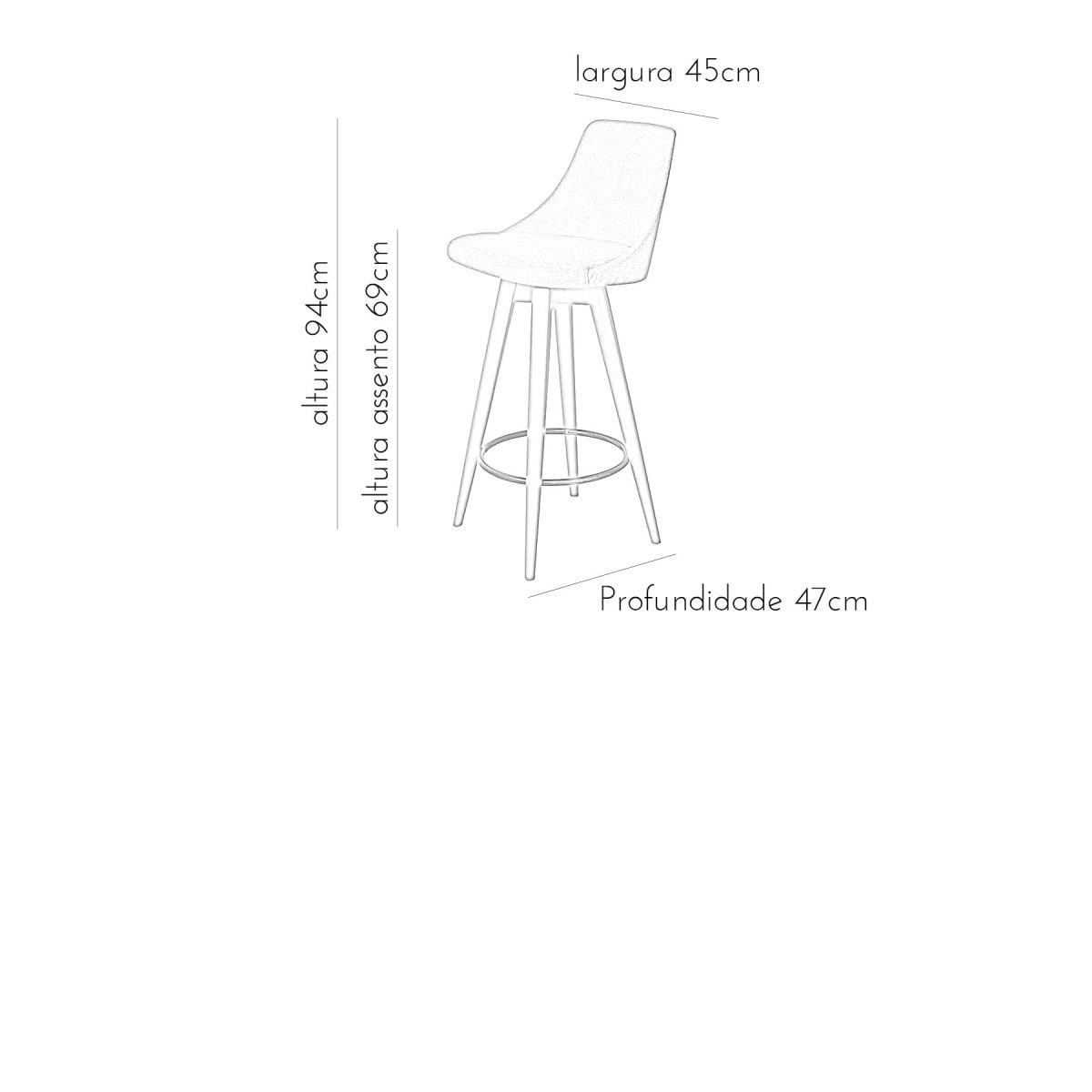 Base em madeira maciça tingida com apoio dos pés em metal com acabamento em pintura epóxi preta. Mecanismo giratório em aço. Concha em MDF estofado em espuma D30 e D26 e tecido. *Produto entregue montado.