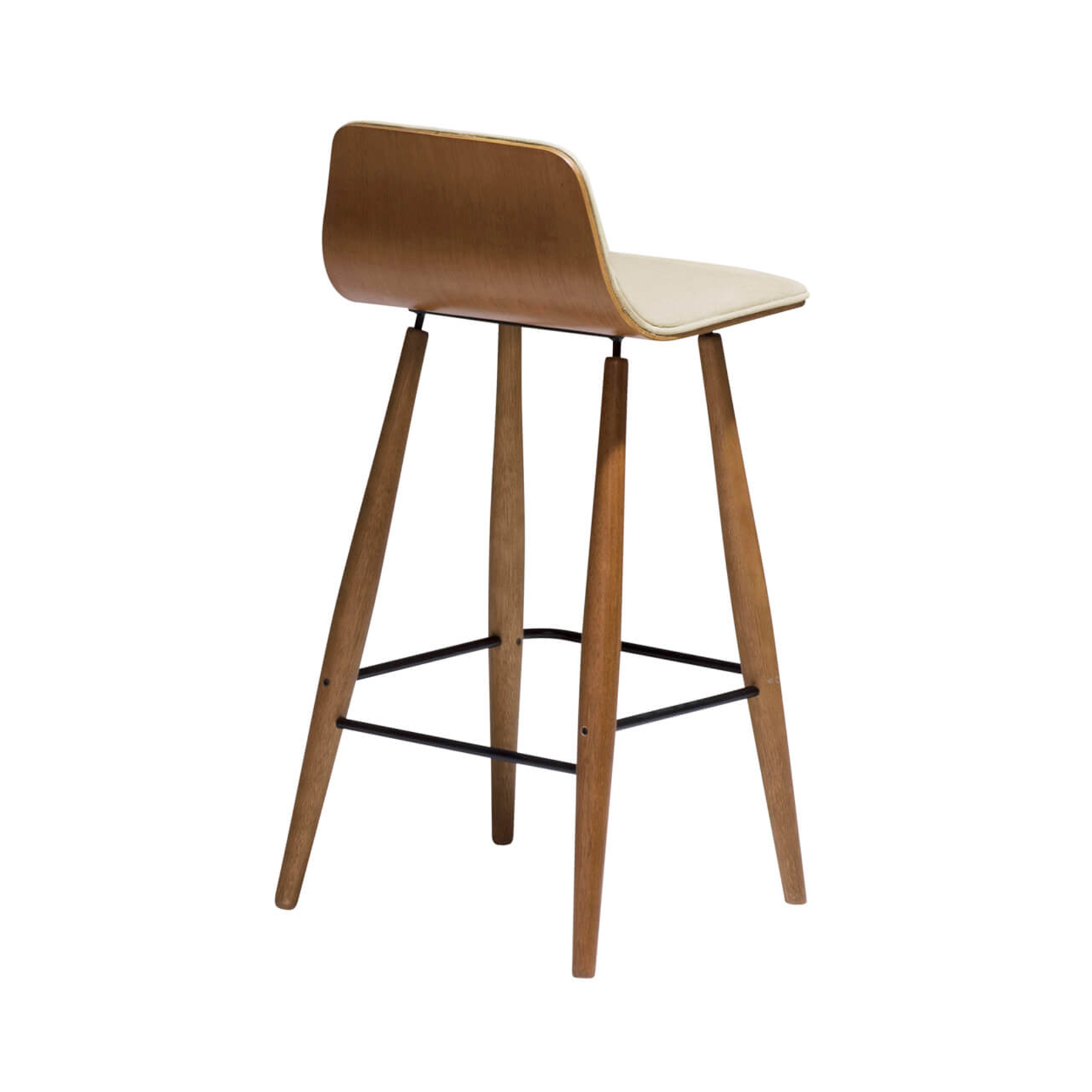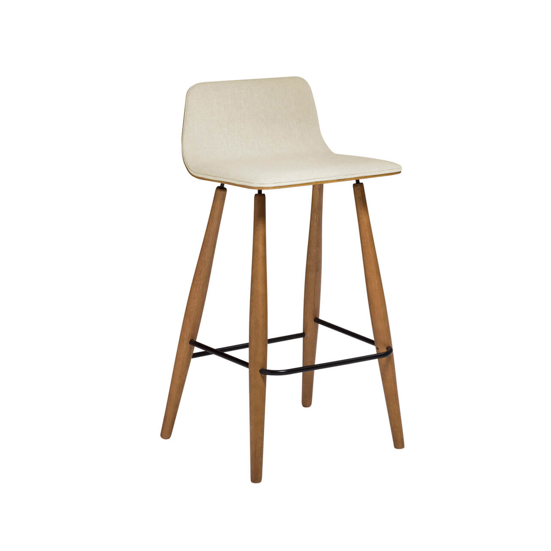 Com linhas contemporâneas e joviais, a banqueta logo complementa ambientes com a sofisticação e o ar natural da madeira. O assento estofado e o apoio para os pés oferecem conforto.