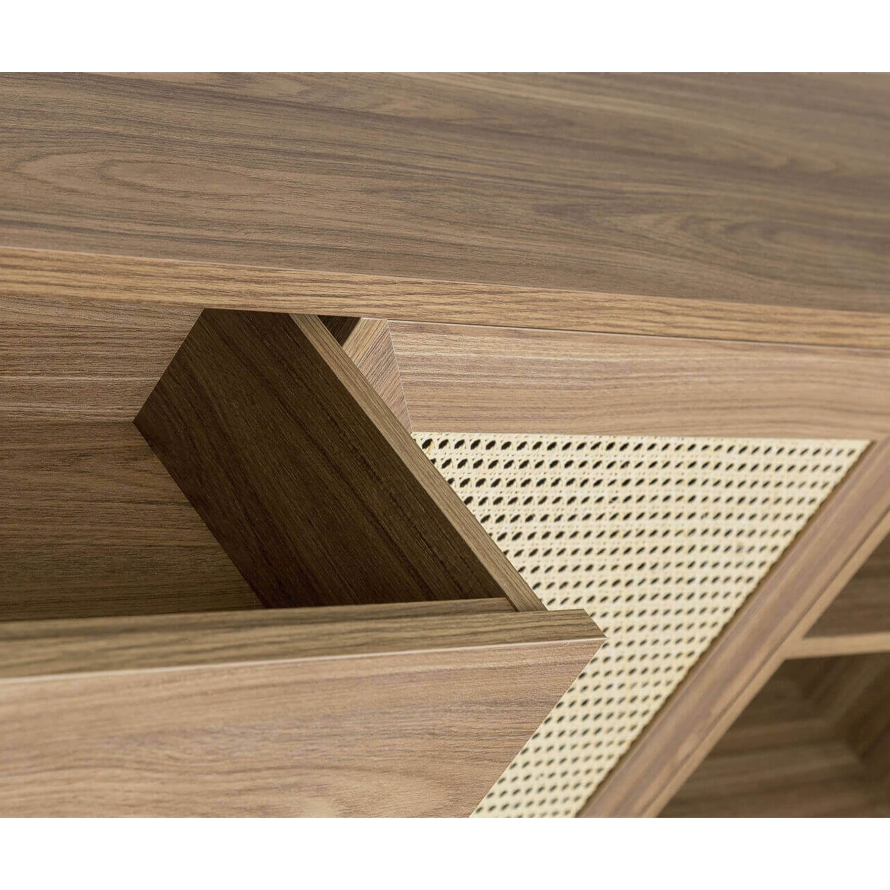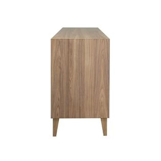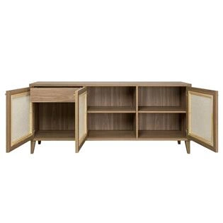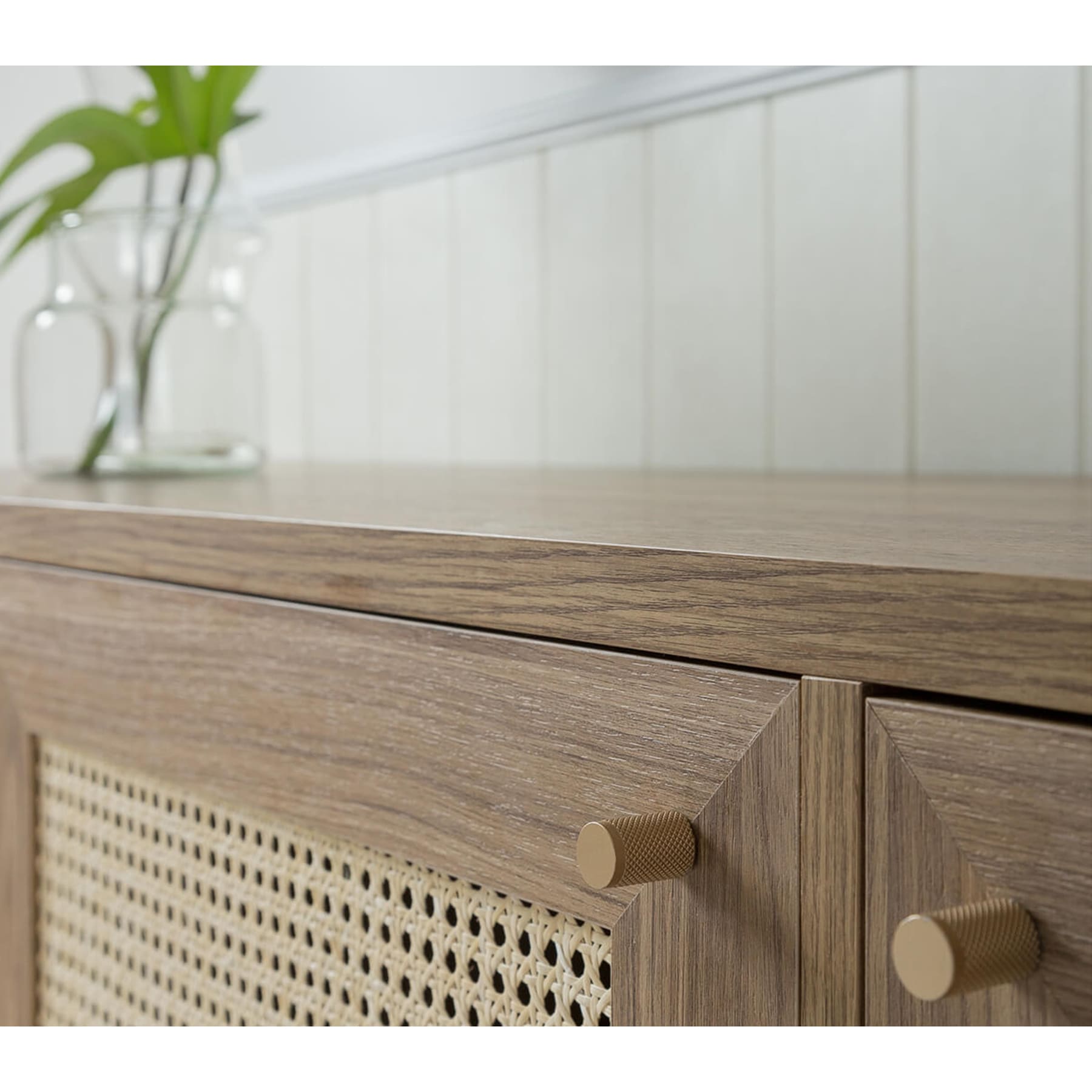 Corpo, pés e frente das portas produzidos em MDF de 25mm com acabamento em melamina BP padrão louro freijó. Puxadores em latão. Detalhes em palha de fibra natural de celulose. Ferragem da gaveta em corrediça telescópica. *Produto entregue com puxadores desmontados. Montagem fácil. Não necessita montagem profissional.