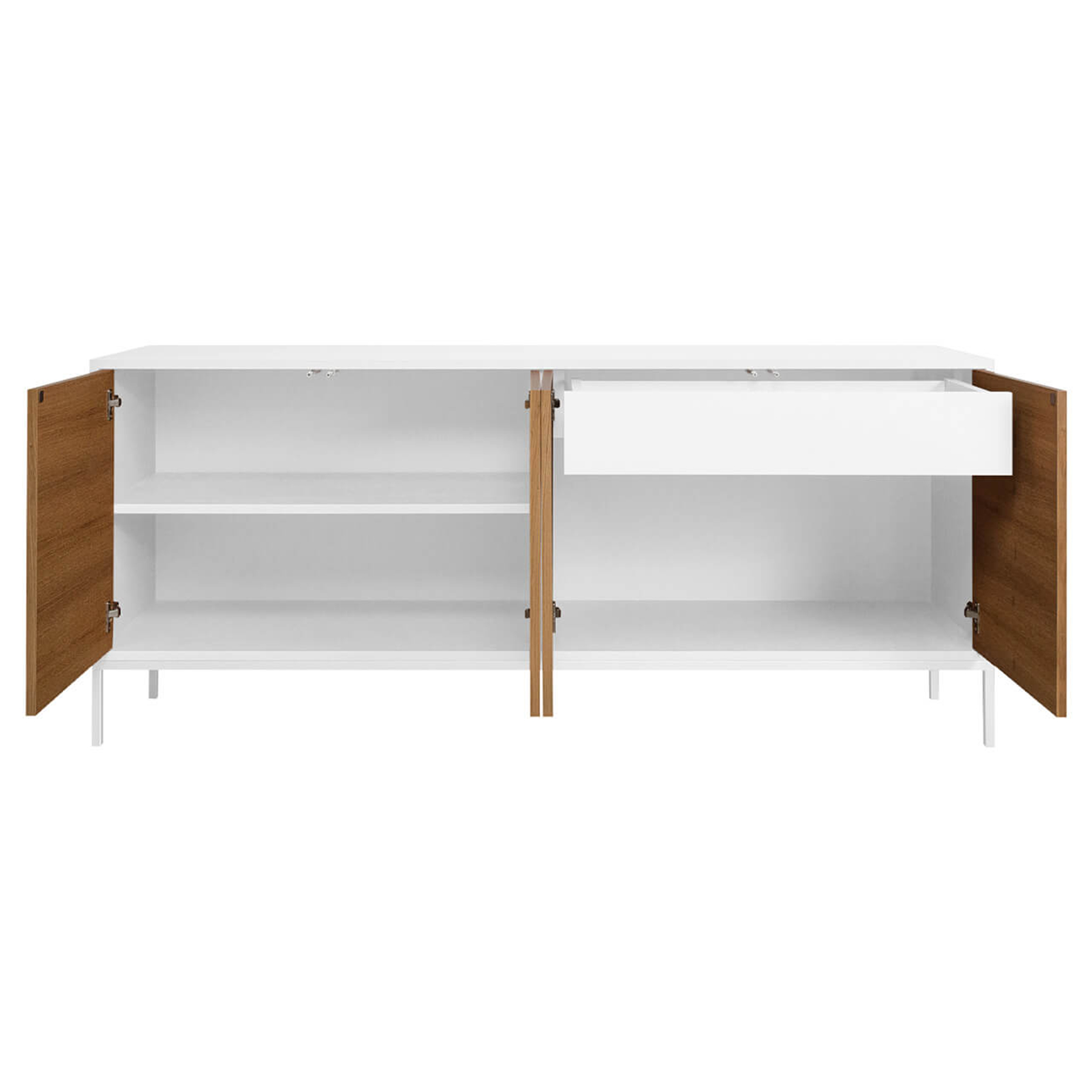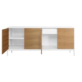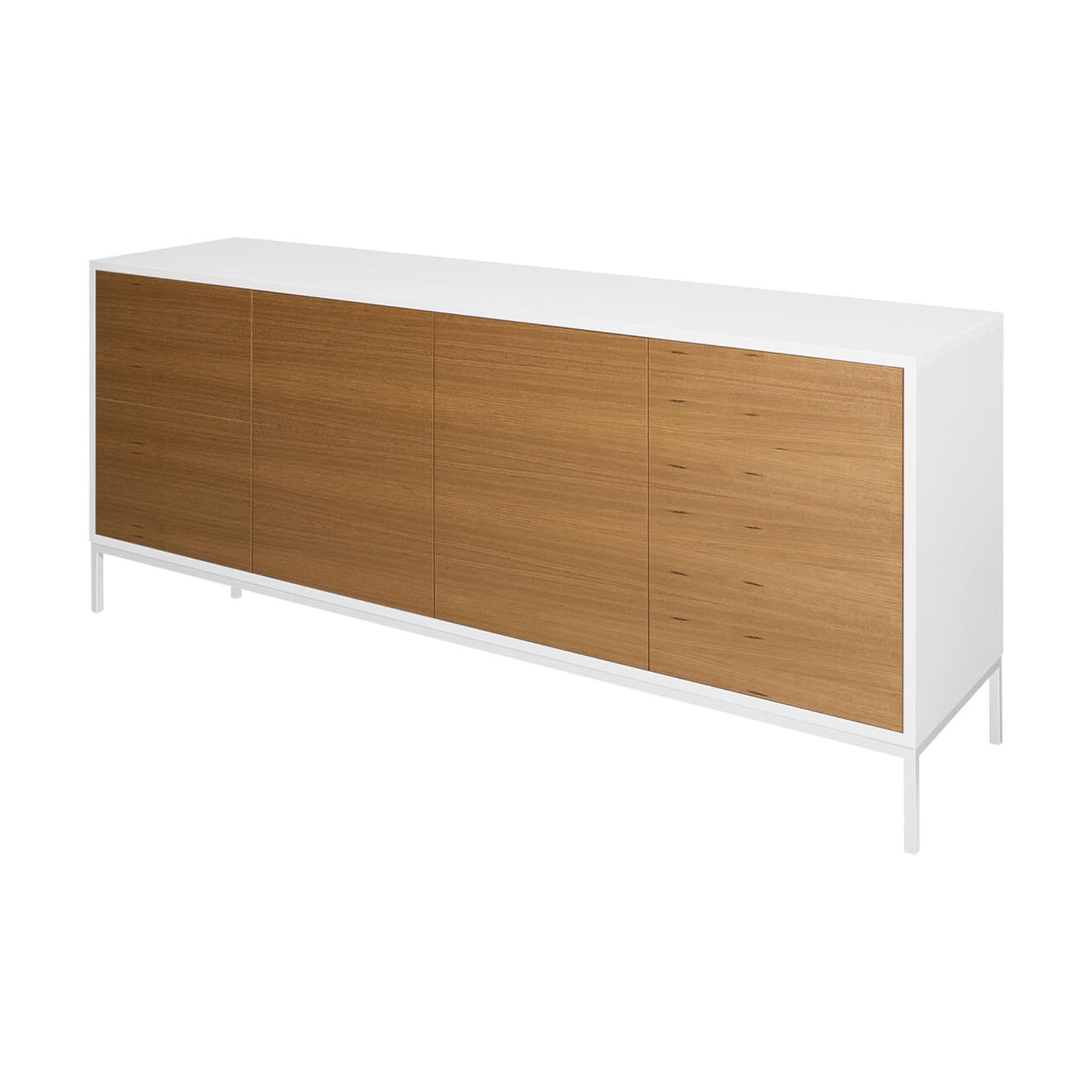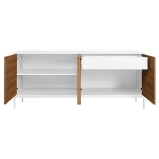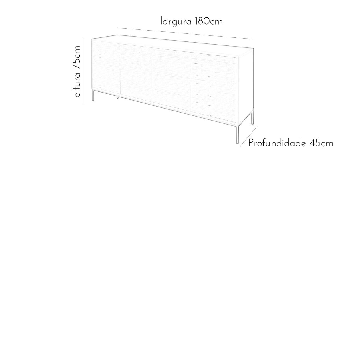 Base de tubo de aço carbono de 20mm com acabamento em pintura automotiva fosca na cor selecionada. Corpo em MDF com acabamento melamina BP da marca Berneck mate padrão super white na opção branco, chumbo na opção cinza e ceramik para a cor terracota. Portas em MDF revestido com lâmina de madeira natural louro freijó com ferragens de toque. *Produto entregue semi montado. Base desmontada. Nível de dificuldade de montagem: Fácil. Não requer montagem profissional.