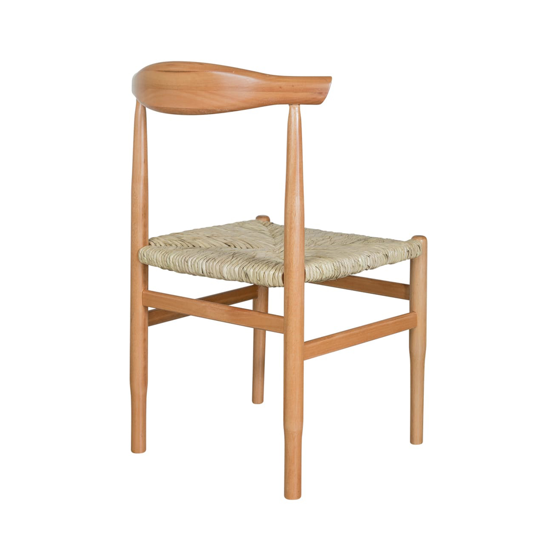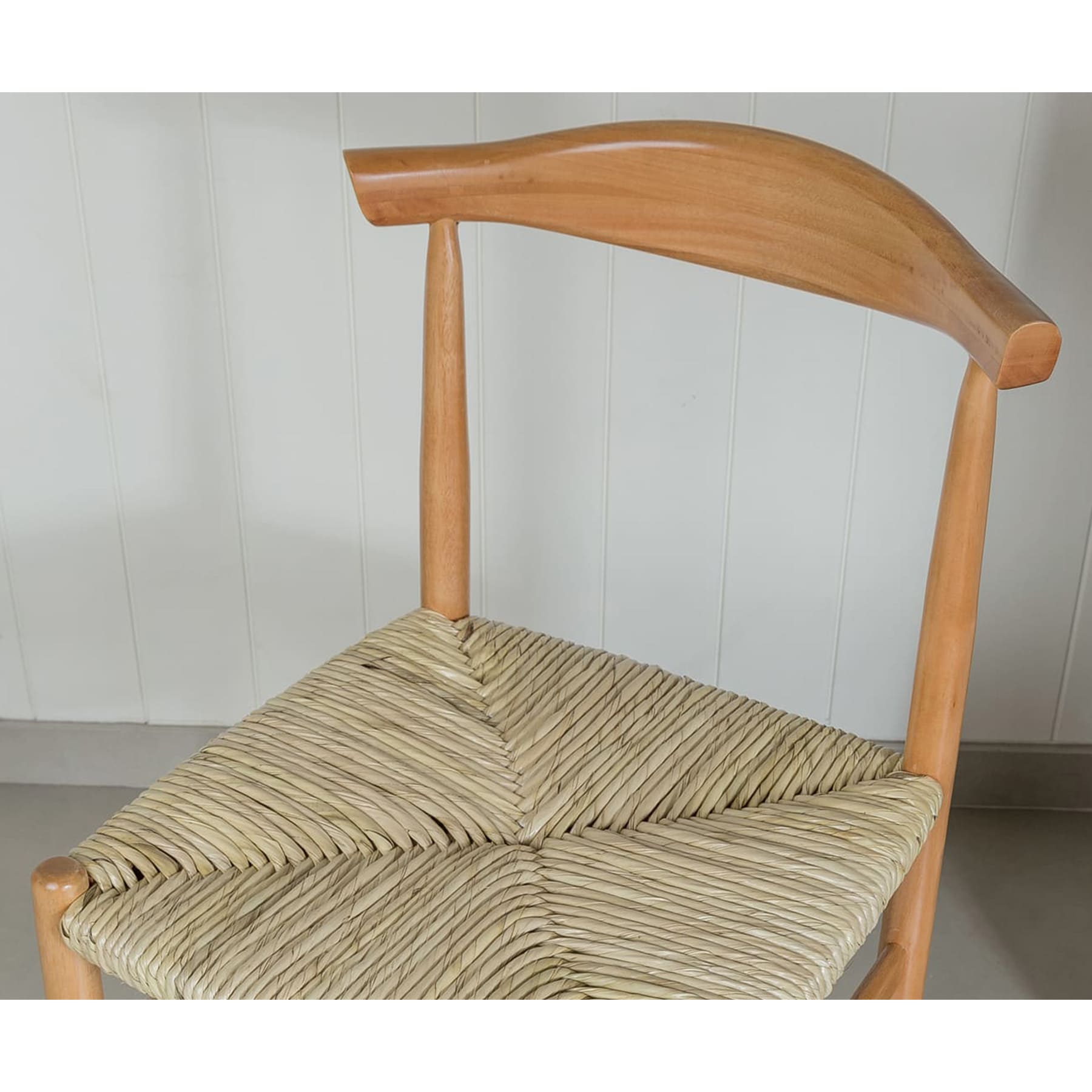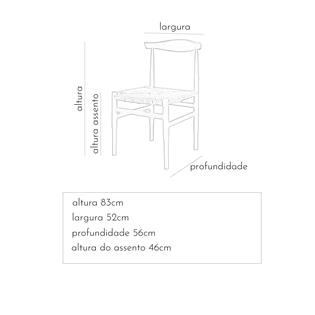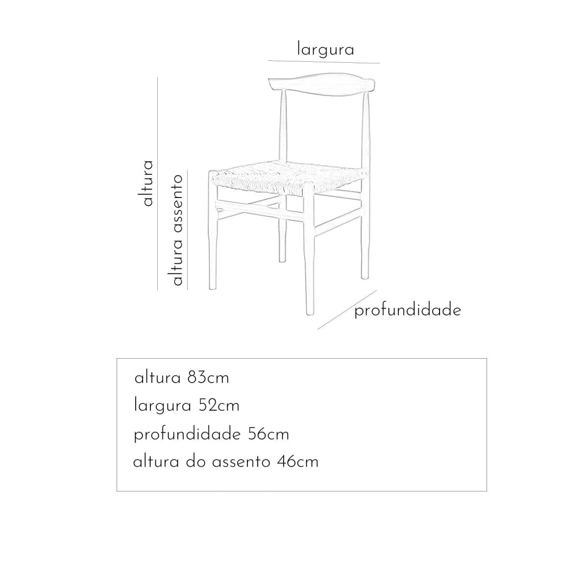 Estrutura em madeira maciça de eucalipto tingida com verniz fosco. Assento e encosto em palha natural de fibra de coqueiro e palmeira, cozidas e secas em estufa, trançadas a mão (as folhas são extraídas uma a uma das plantas para crescerem novamente). *Produto entregue montado.