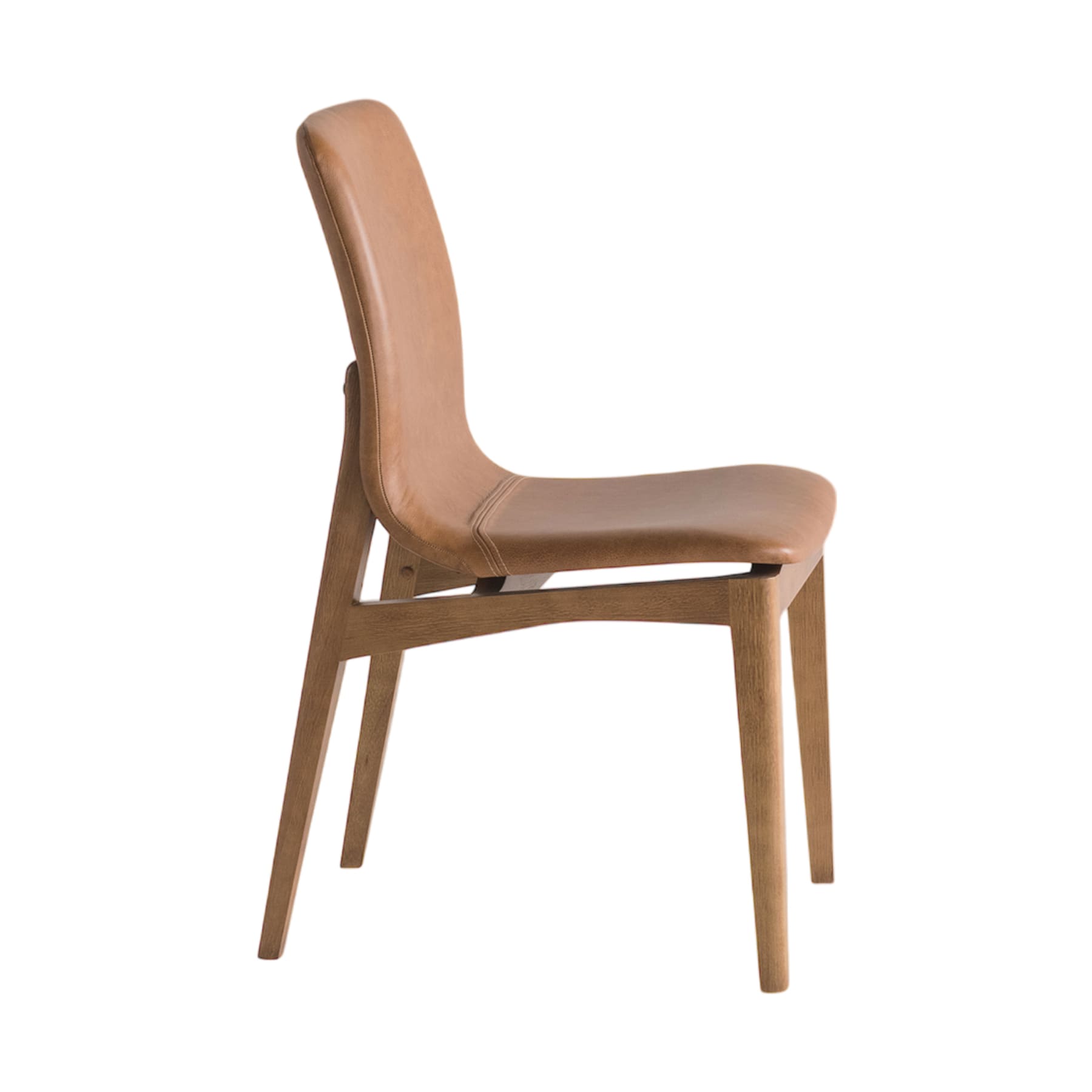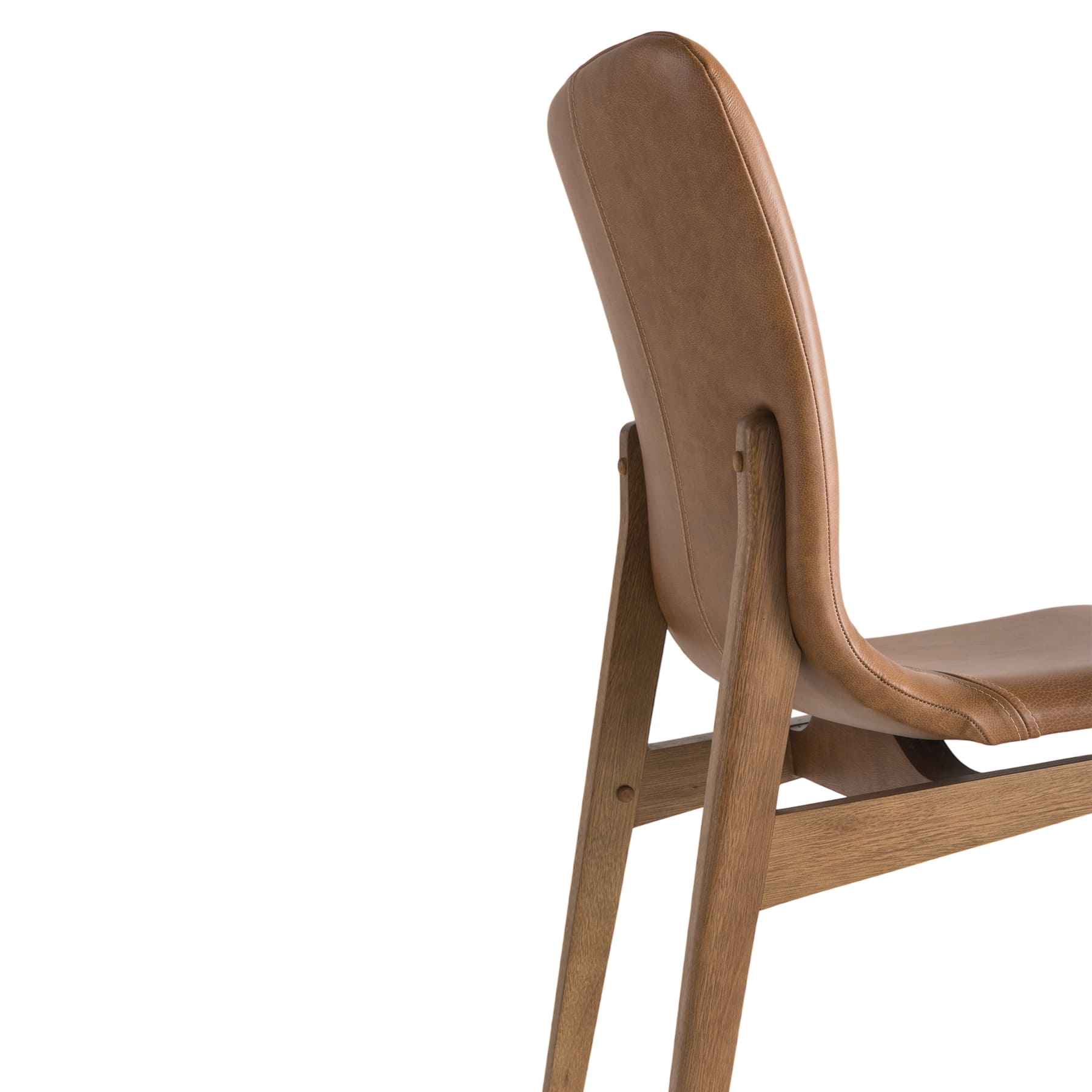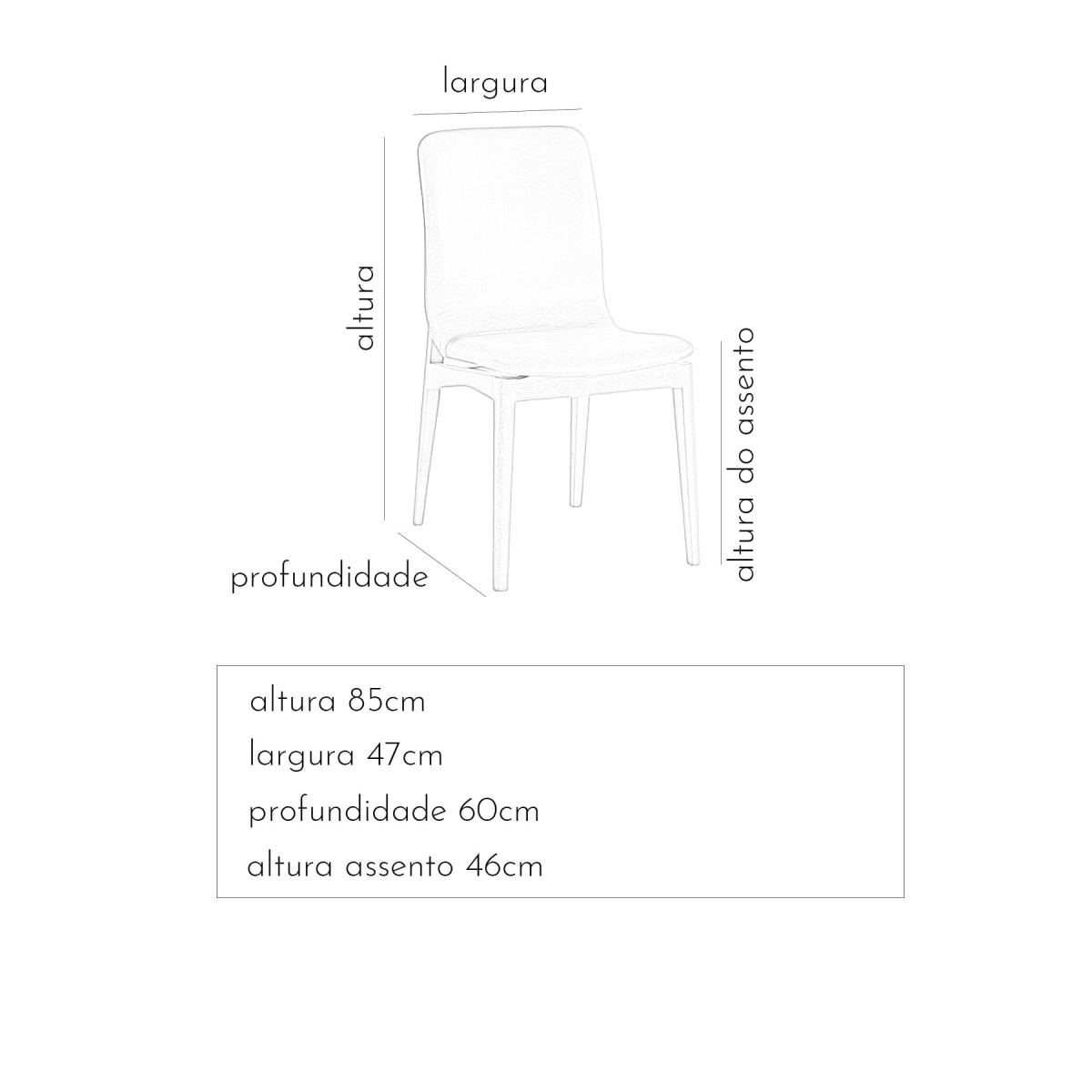 Estrutura em madeira maciça. Assento e encosto em madeira multilaminada curva anatômica, estofados com espuma D28 e couro natural (100% couro).