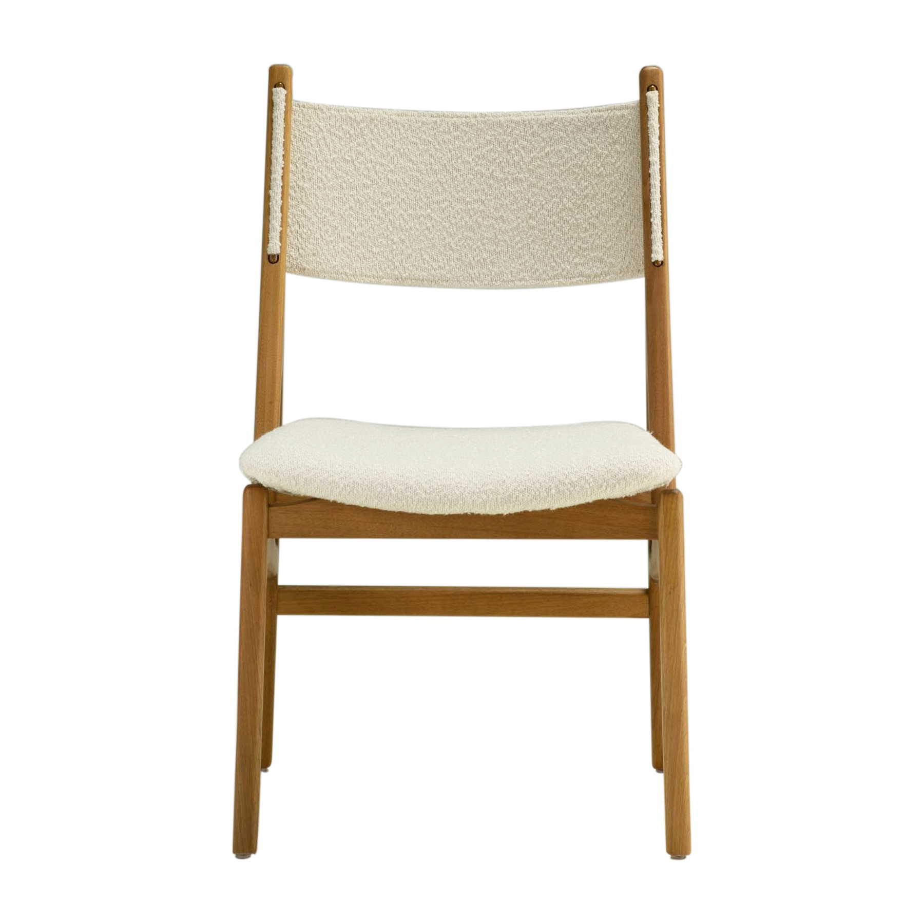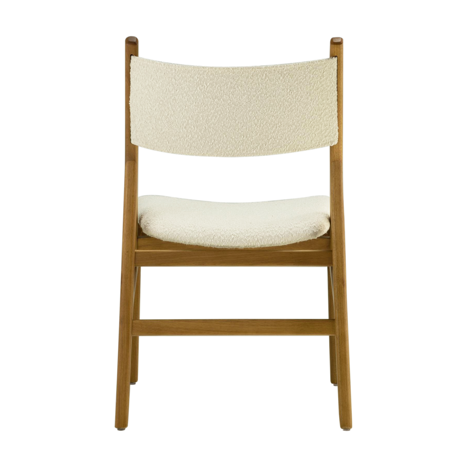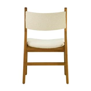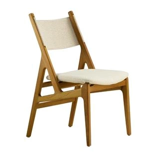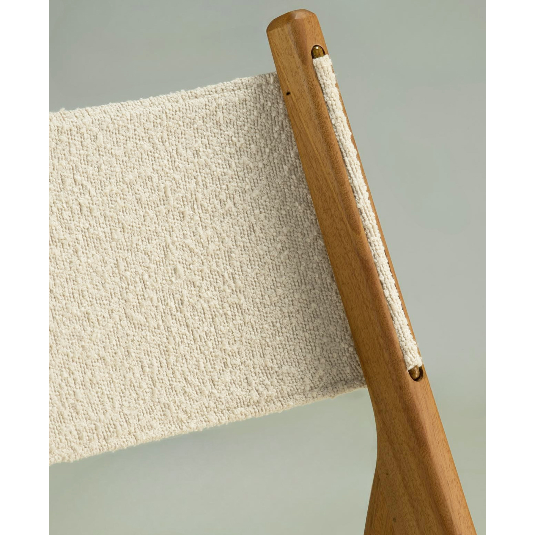 Estrutura em madeira maciça jequitibá. Assento estofado com espuma D28 e tecido bouclê 100% poliéster. Encosto em tecido com reforço interno em entre tela. *Produto entregue montado.
