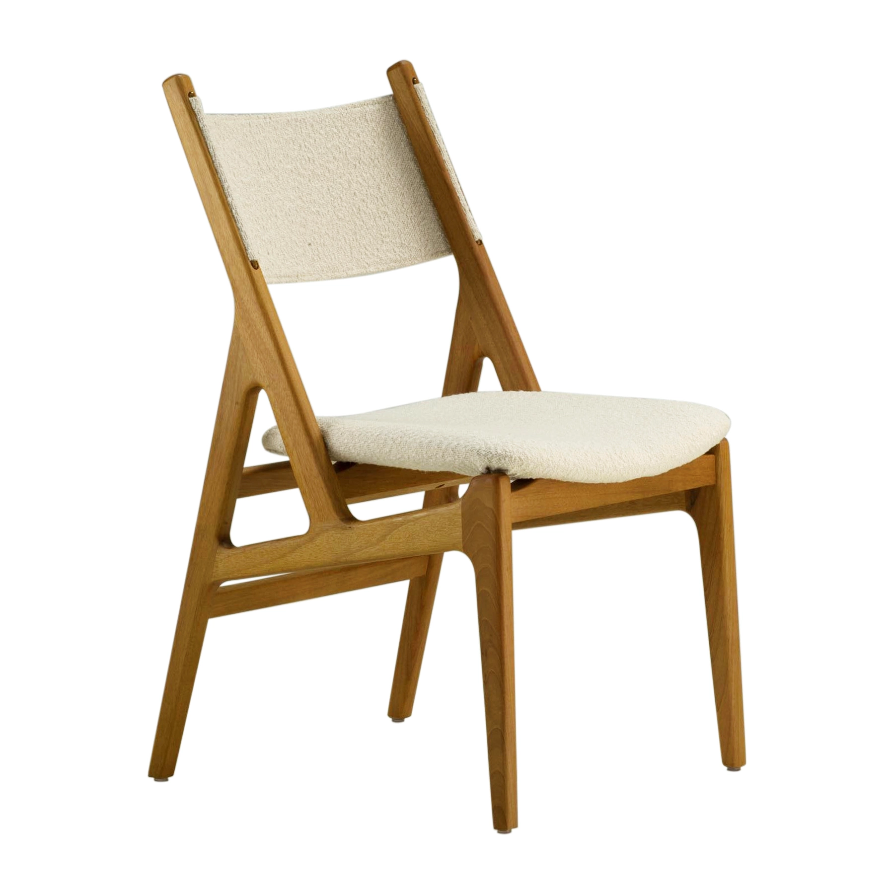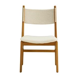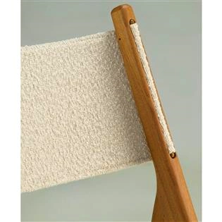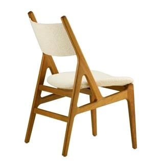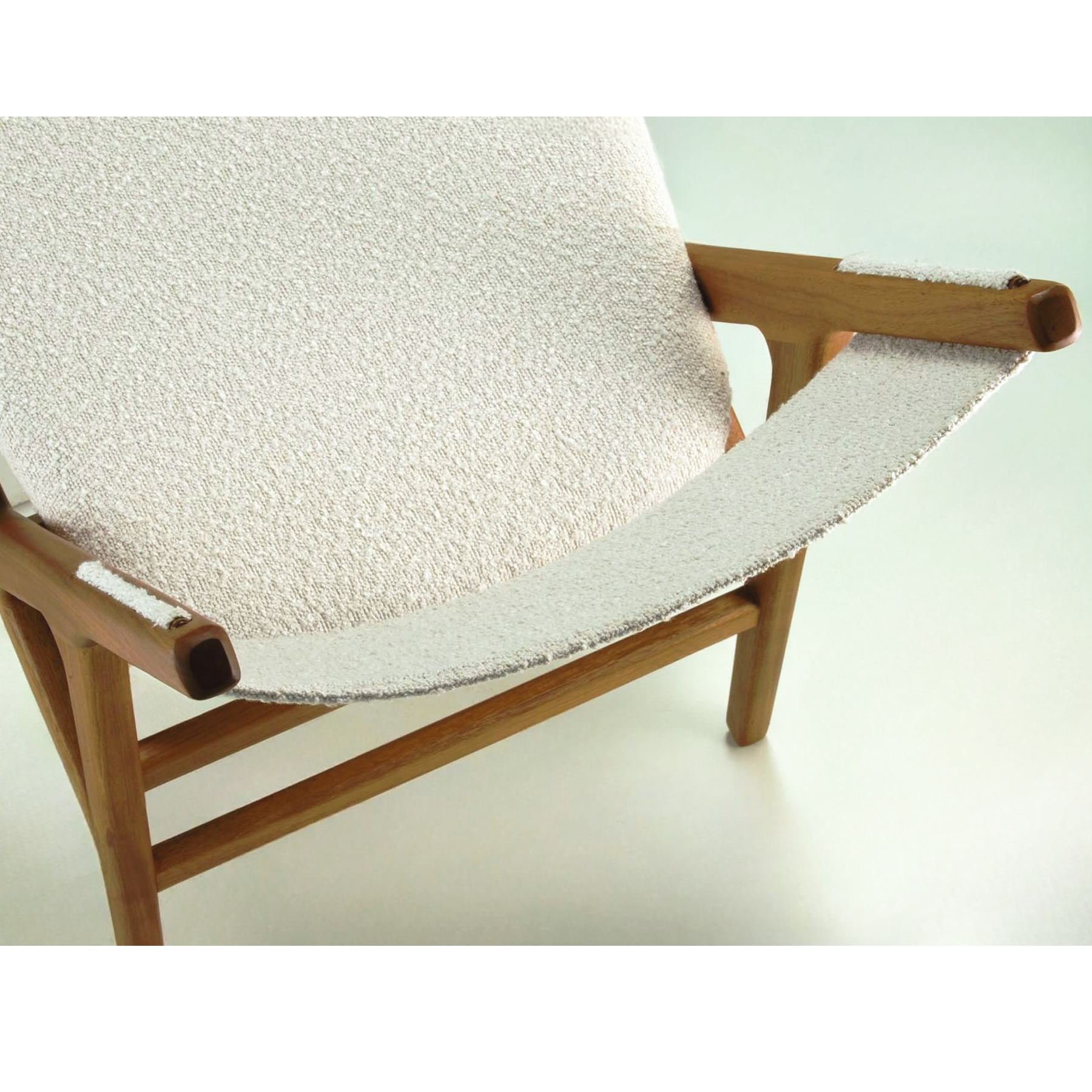 Estrutura em madeira maciça jequitibá. Assento estofado com espuma D28 e tecido bouclê 100% poliéster. Encosto em tecido com reforço interno em entre tela. *Produto entregue montado.