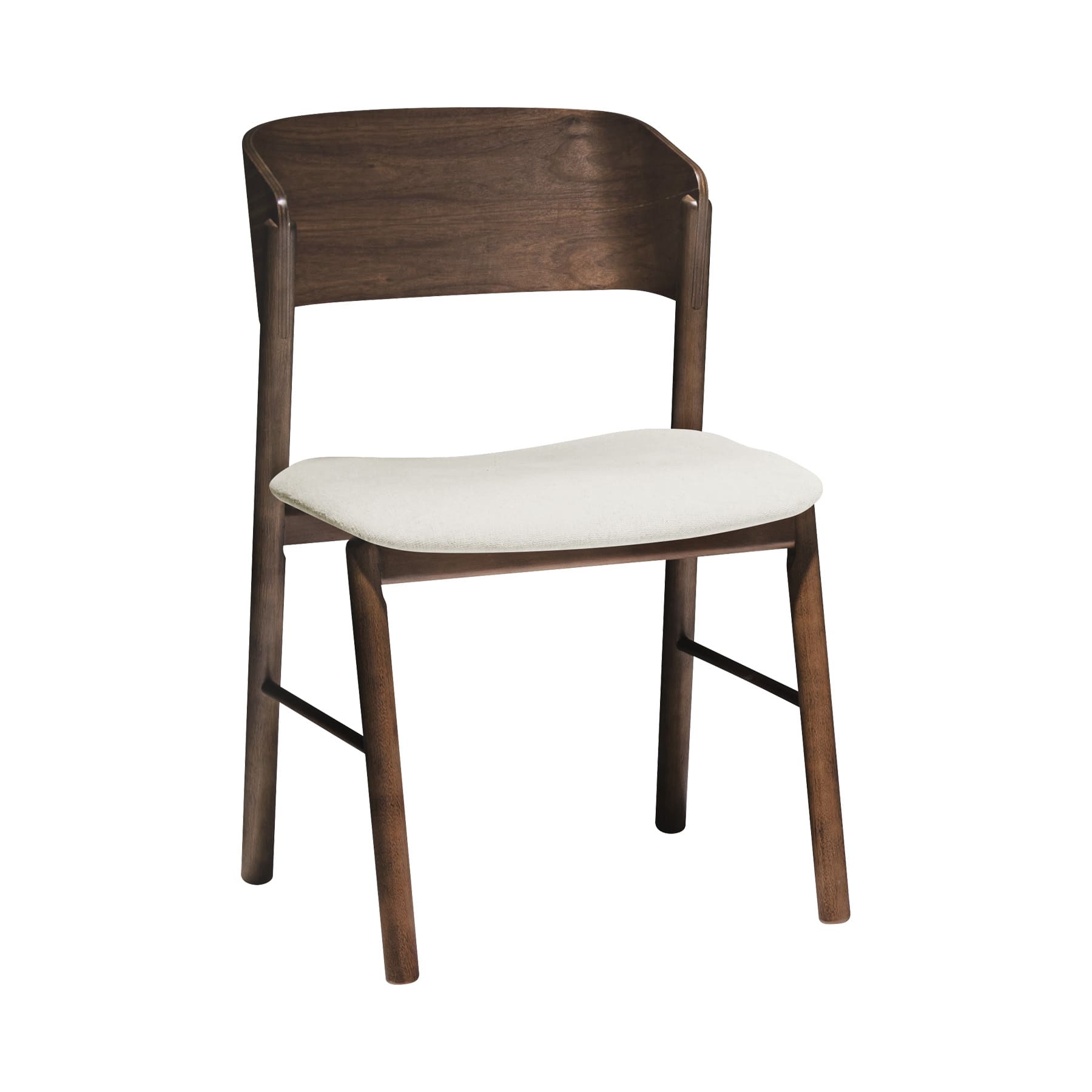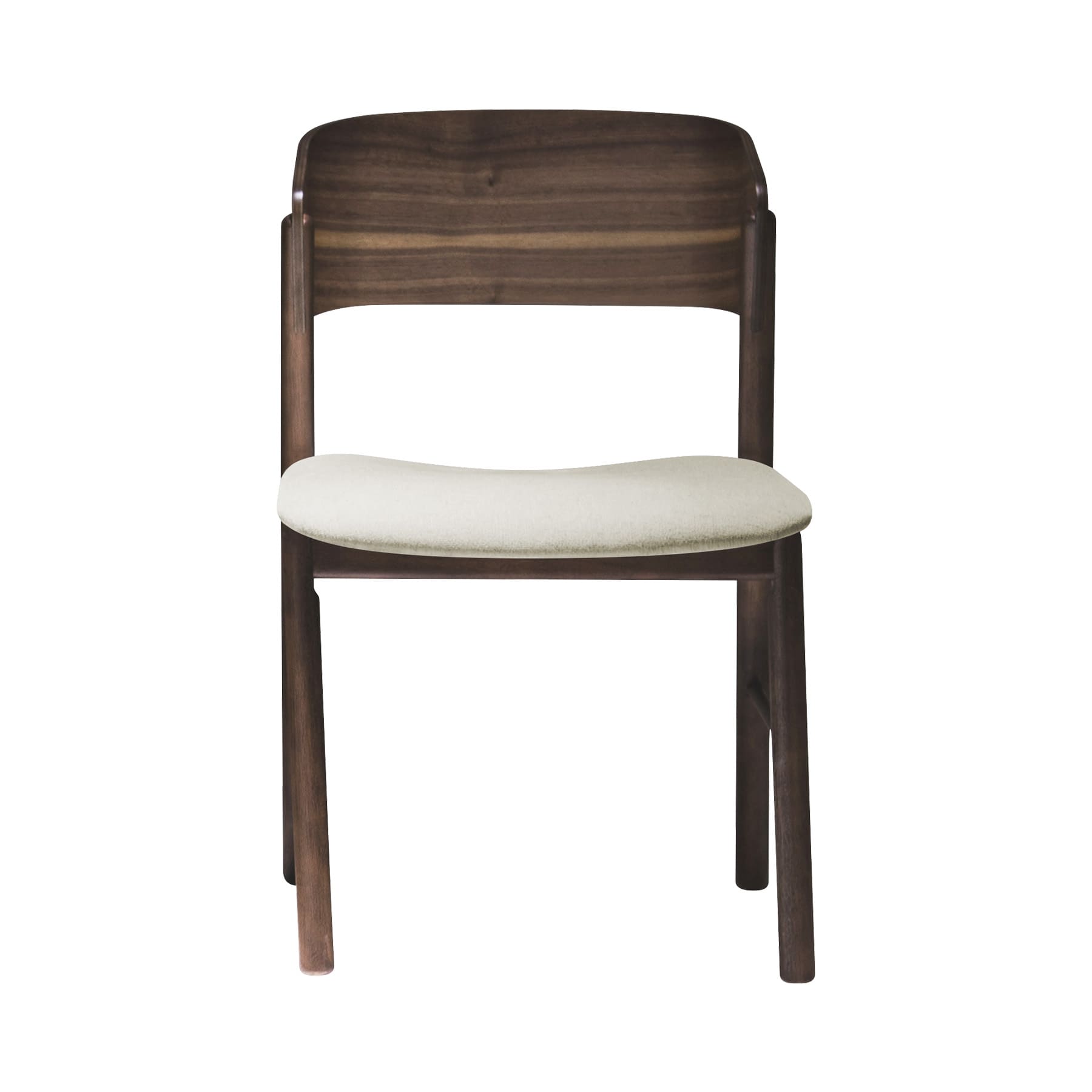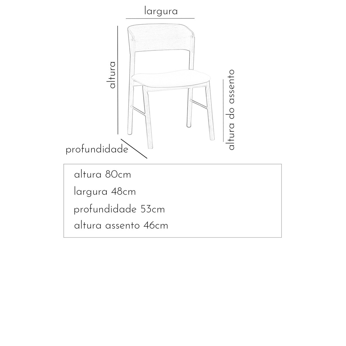 Estrutura em madeira maciça. Encosto em madeira multilaminada curva com acabamento em lâmina de madeira natural cedro. Assento estofado com espuma D28 e tecido. *Produto entregue montado.