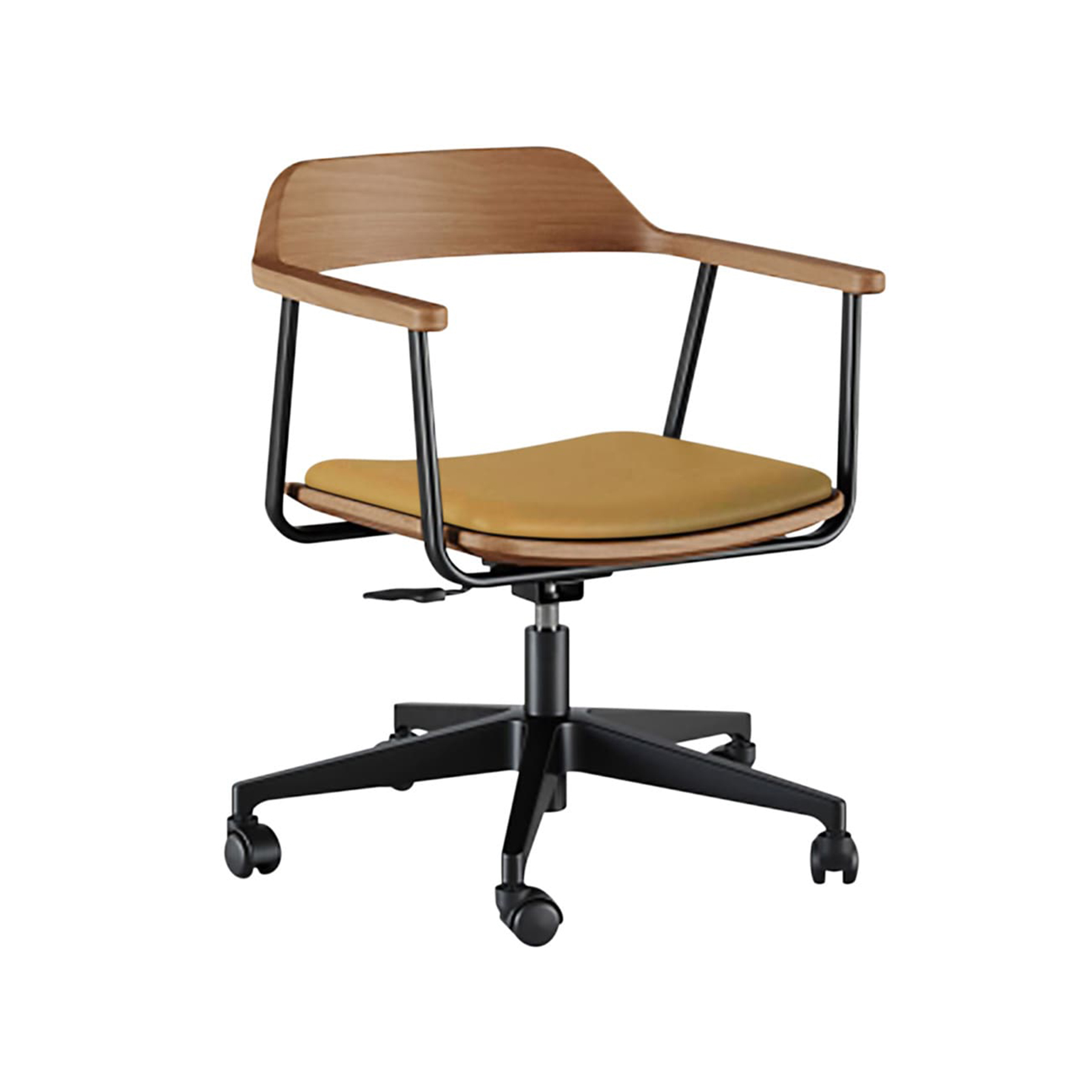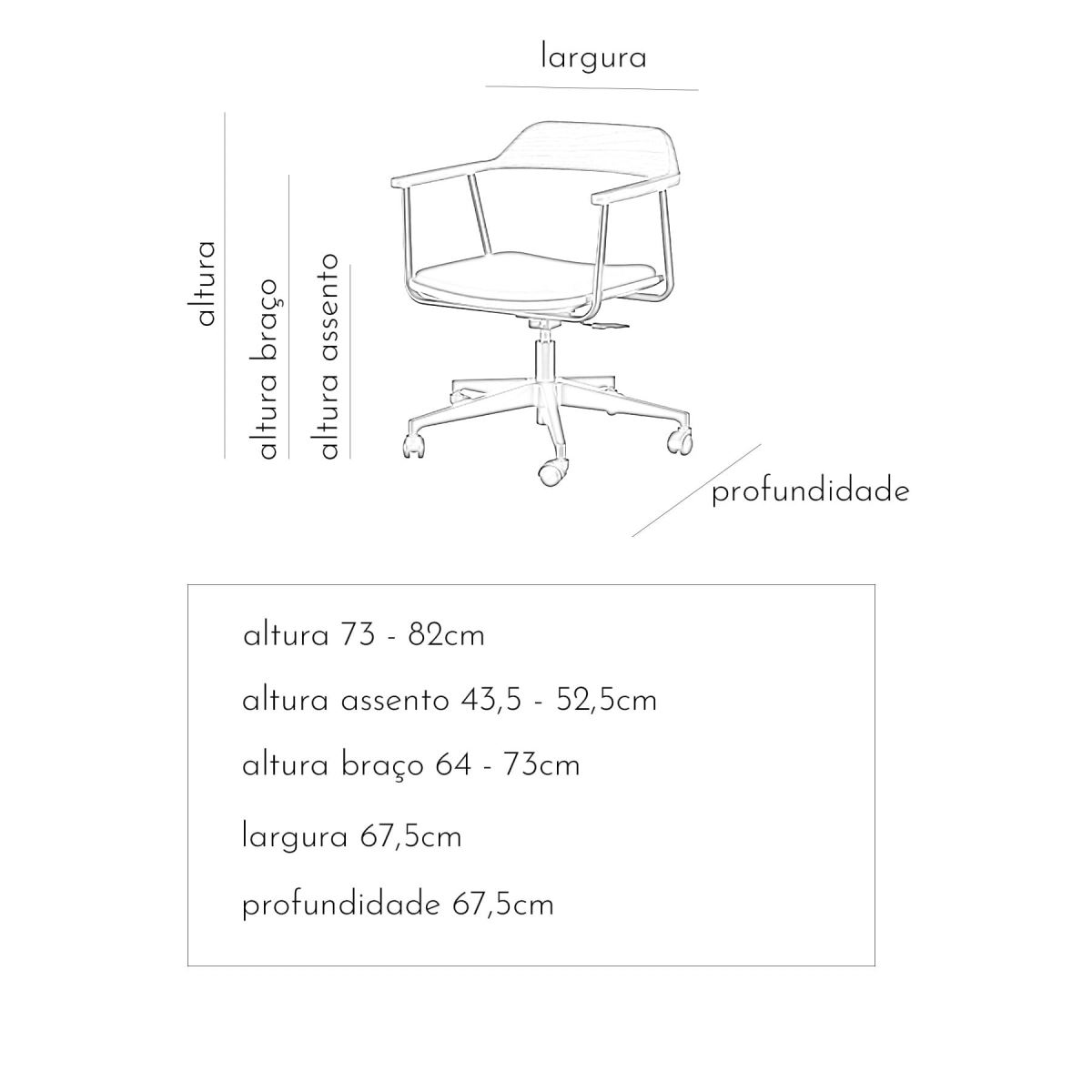 Base em alumínio com pintura epóxi preta fosca, rodízios em nylon e regulagem de altura com pistão a gás. Encosto em madeira maciça. Estrutura do assento em madeira maciça com estofado em espuma e tecido. Estrutura dos braços em tubo de aço carbono com acabamento em epóxi.
