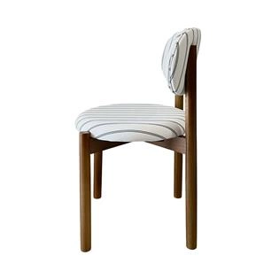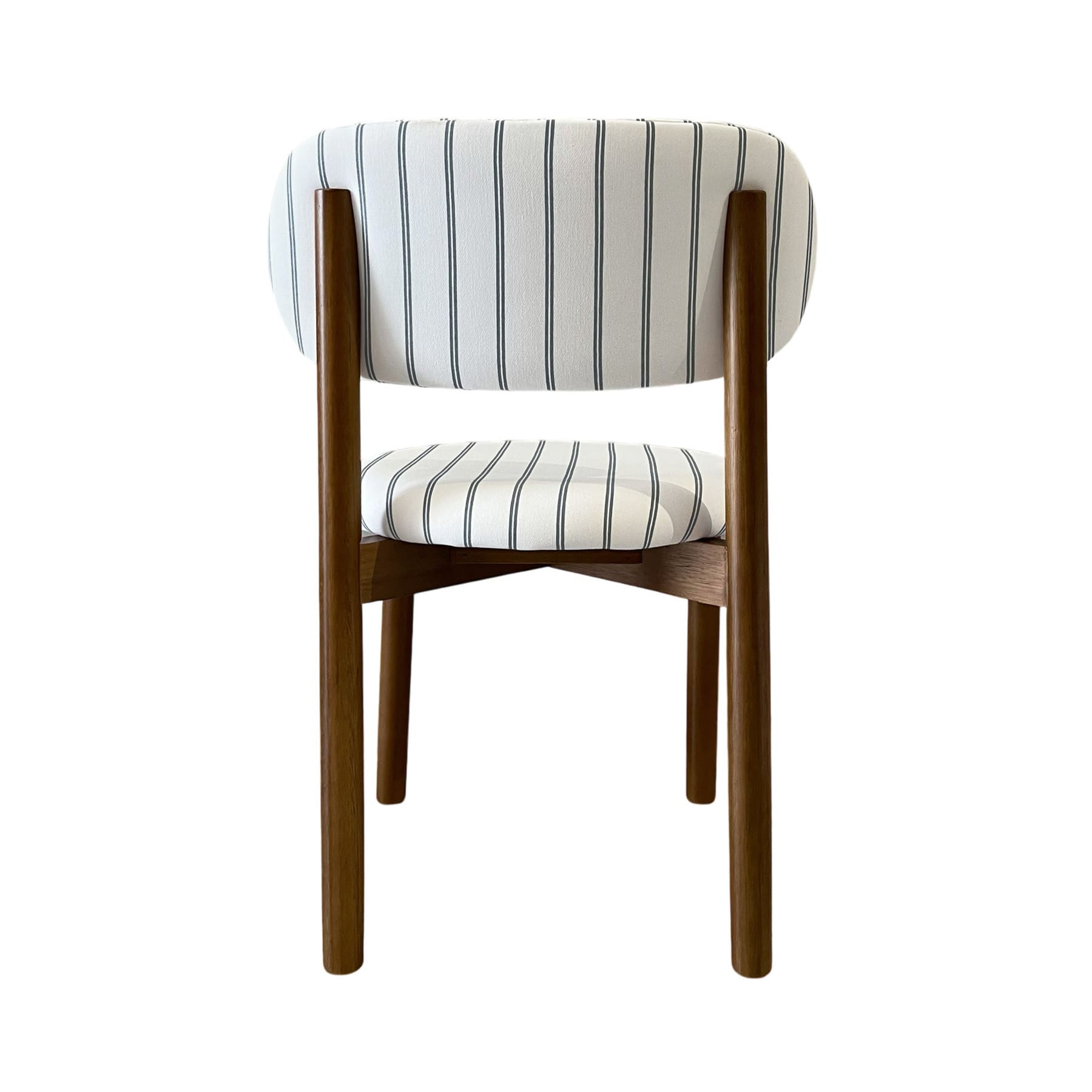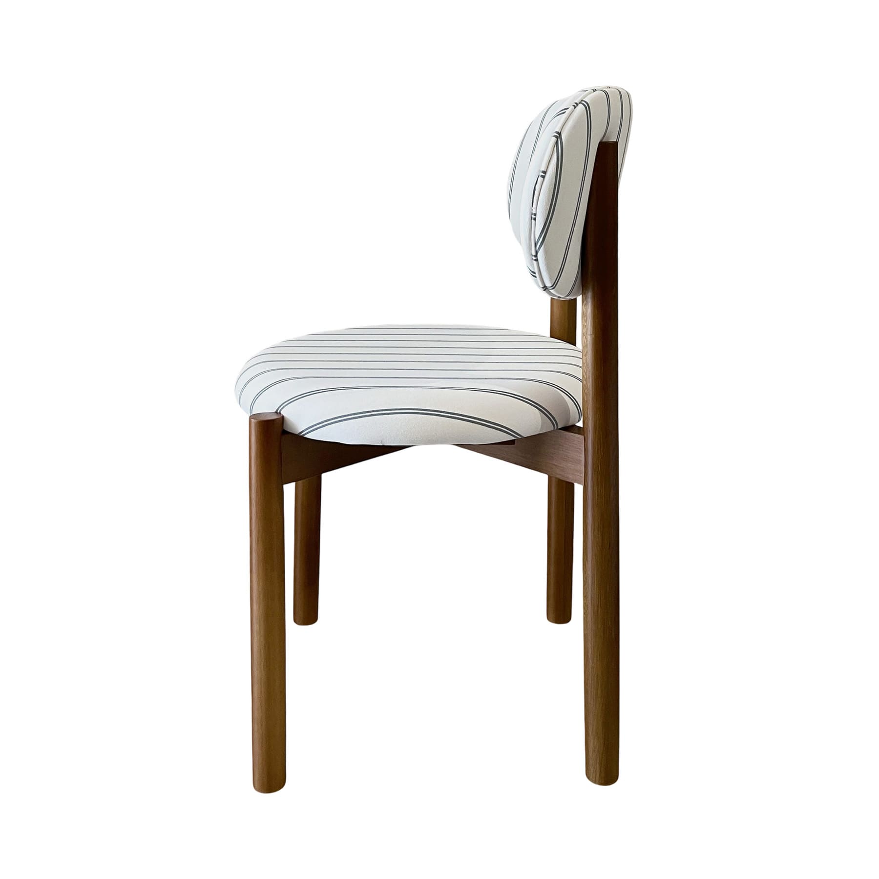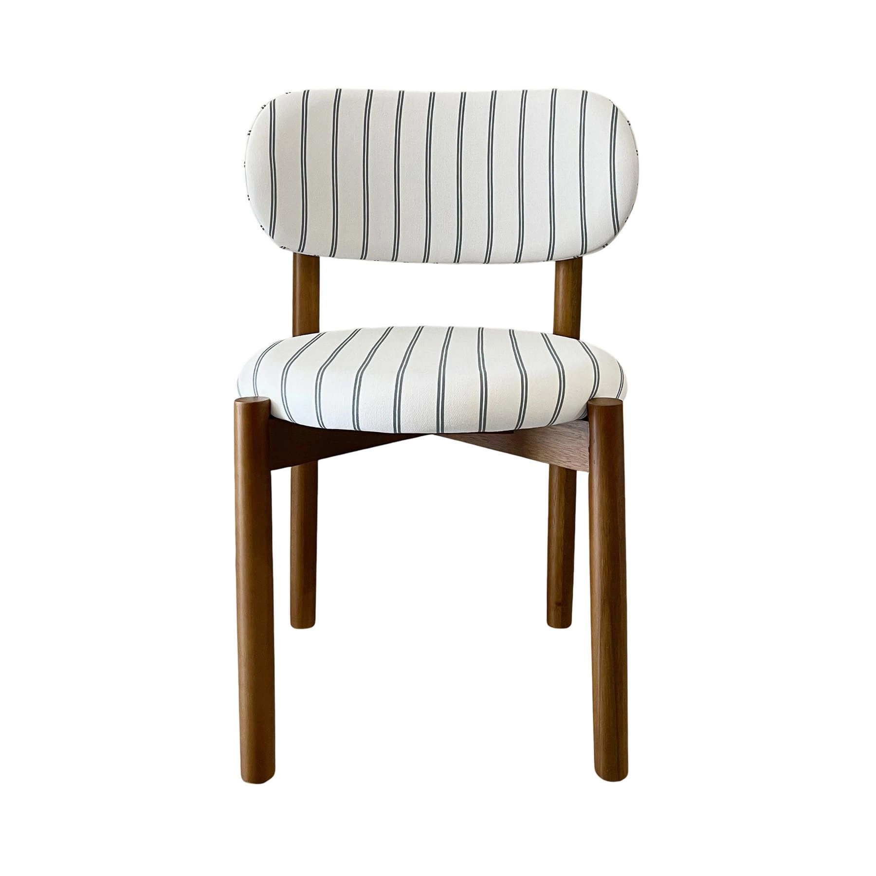 Estrutura em madeira maciça lyptus. Assento e encosto em MDF estofado com espuma D28 e tecido listrado 100% algodão.