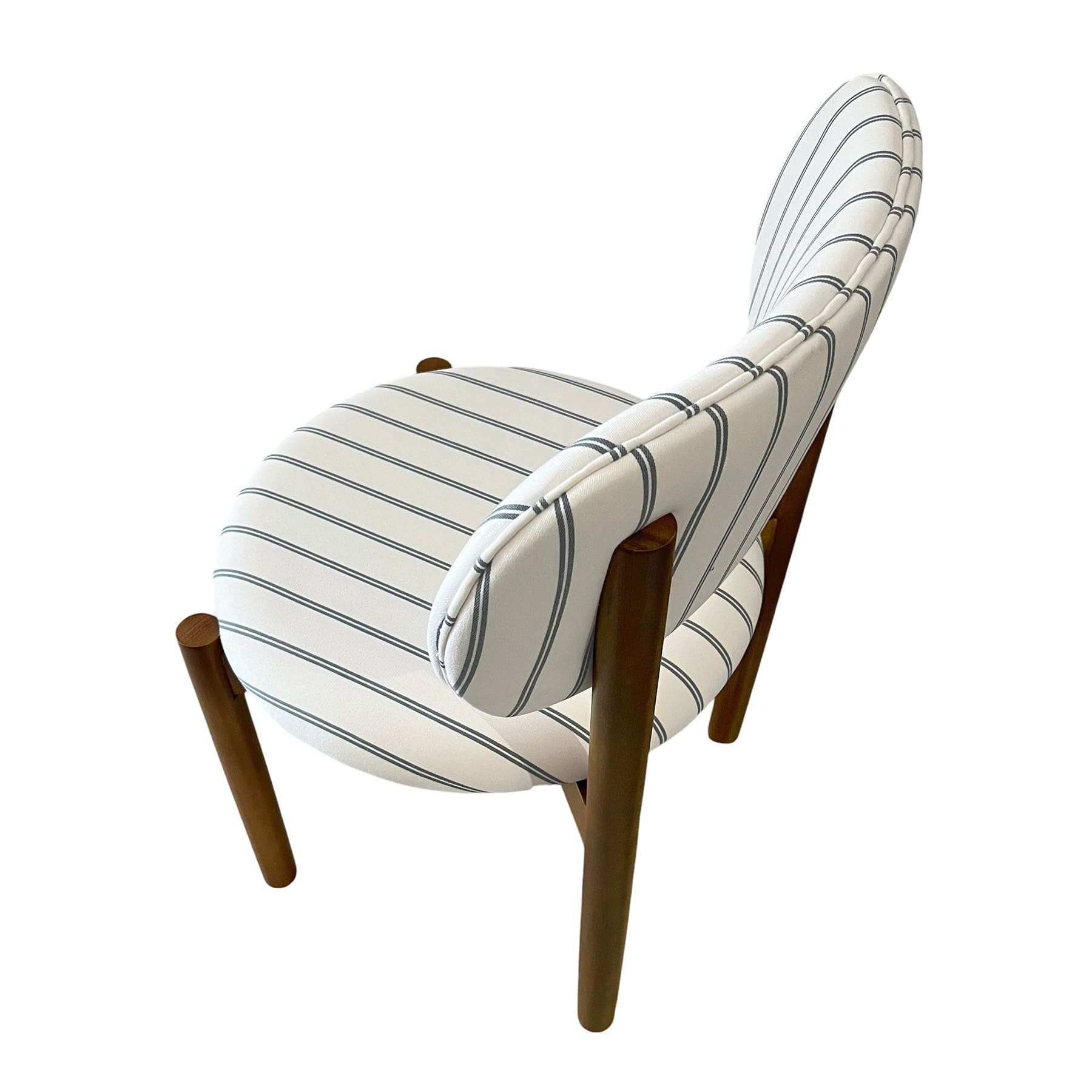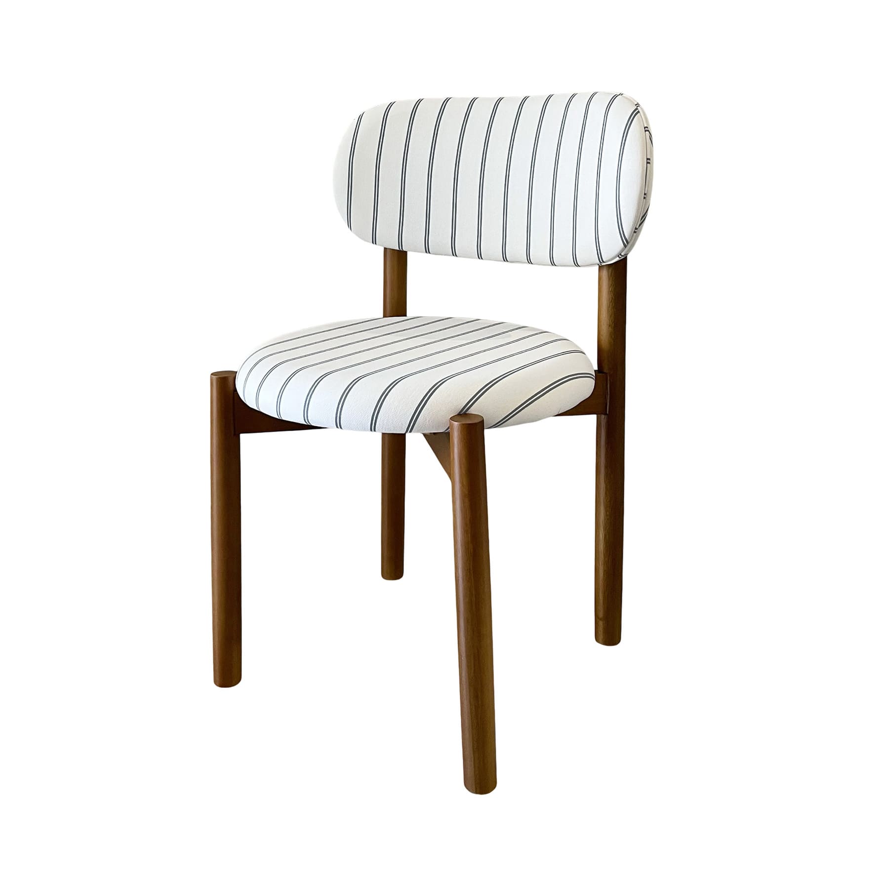 A cadeira toco tem desenho contemporâneo, simples e robusto. As formas redondas remetem ao natural e o tecido listrado faz dela a escolha perfeita para ambientes descontraídos e modernos.