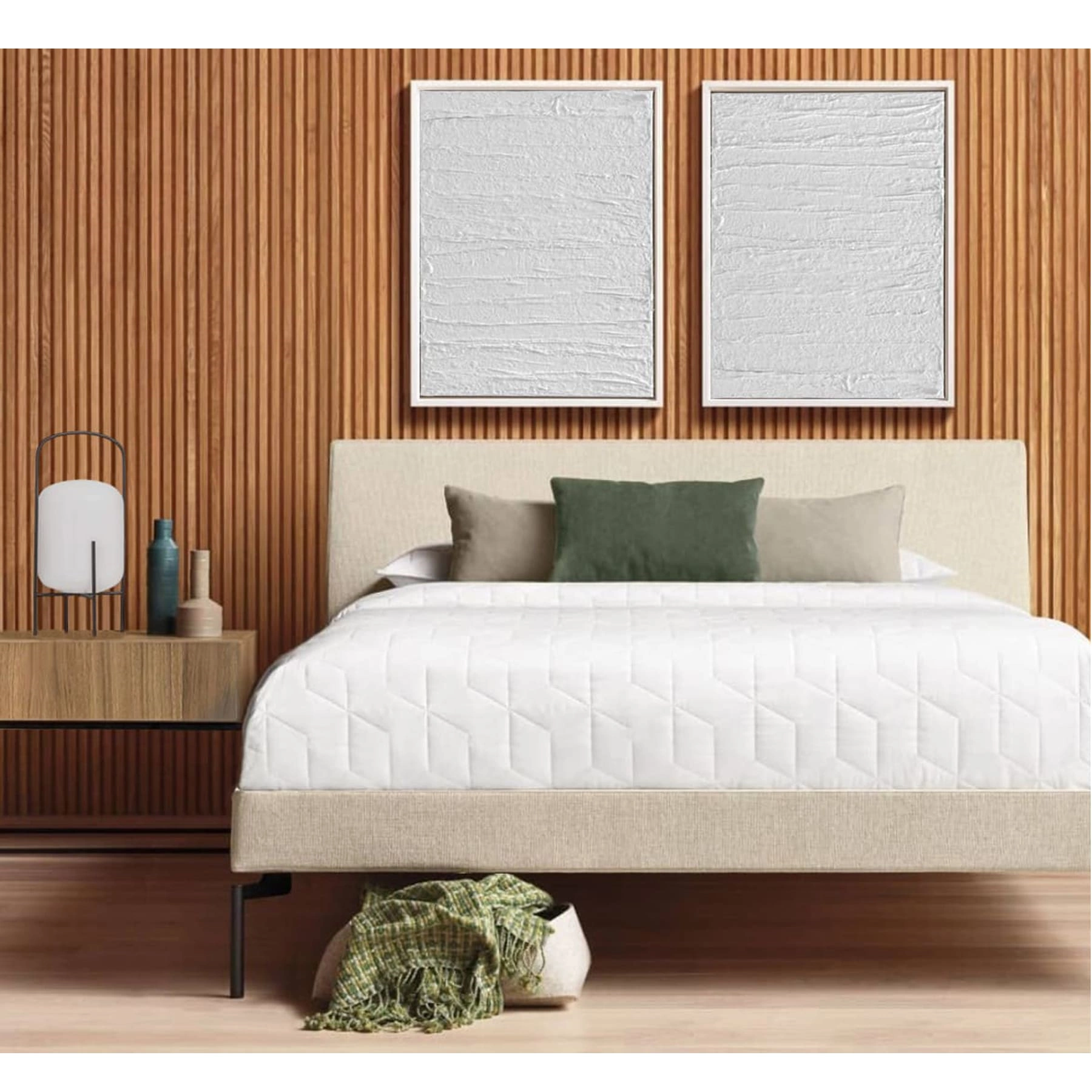 Estrutura em madeira maciça de 25mm e MDF de 28mm, estofada com espuma D18 e tecido. Pés em tubo de aço carbono de 25mm de largura com acabamento em pintura epóxi. *ATENÇÃO: a cama é entregue semi montada (cabeceira, box e pés separados), sendo que o box é entregue montado. Nossa entrega não inclui montagem, subida por escadas e/ou içamento. Verifique a medida de portas e elevadores para possibilitar a entrega. Nível de dificuldade de montagem: médio. Recomendada montagem profissional.