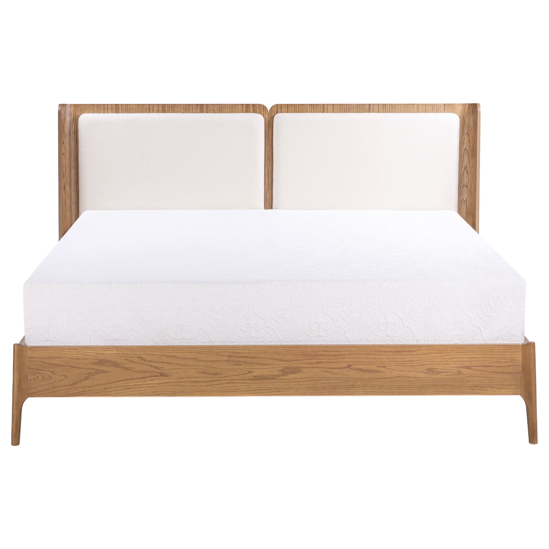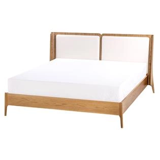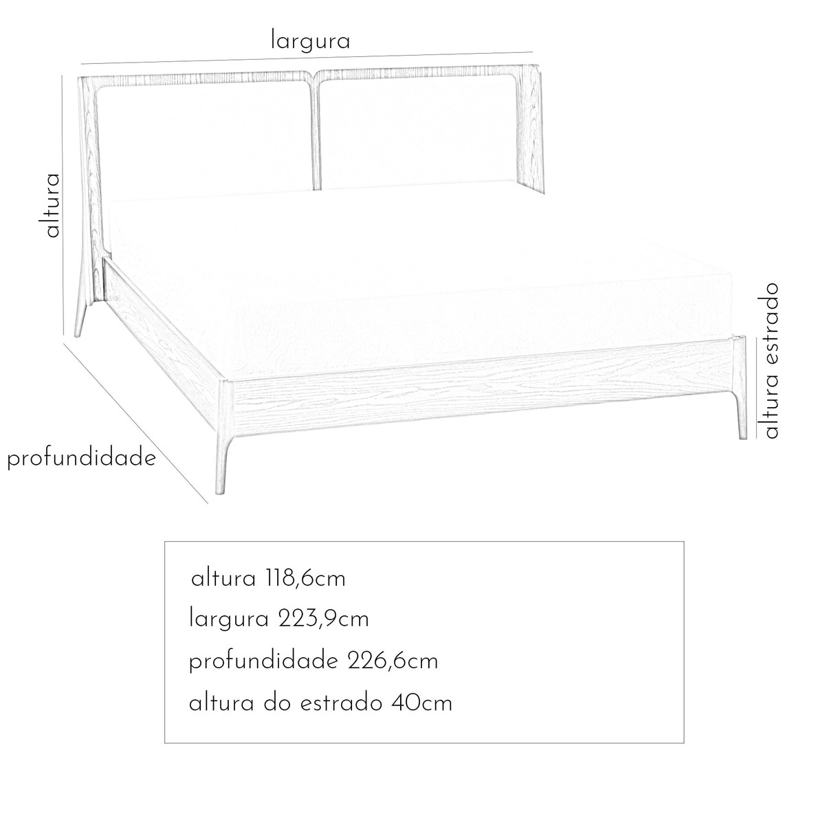 Pés, detalhe traseiro e estrado do colchão em madeira tauari maciço. Encosto e laterais em MDF com acabamento em lâmina de madeira natural carvalho, com estofamento em espuma D28 e tecido tipo linho com composição 60% algodão 40% poliéster. *Produto entregue desmontado. Nível de dificuldade de montagem: difícil. Necessária montagem profissional.