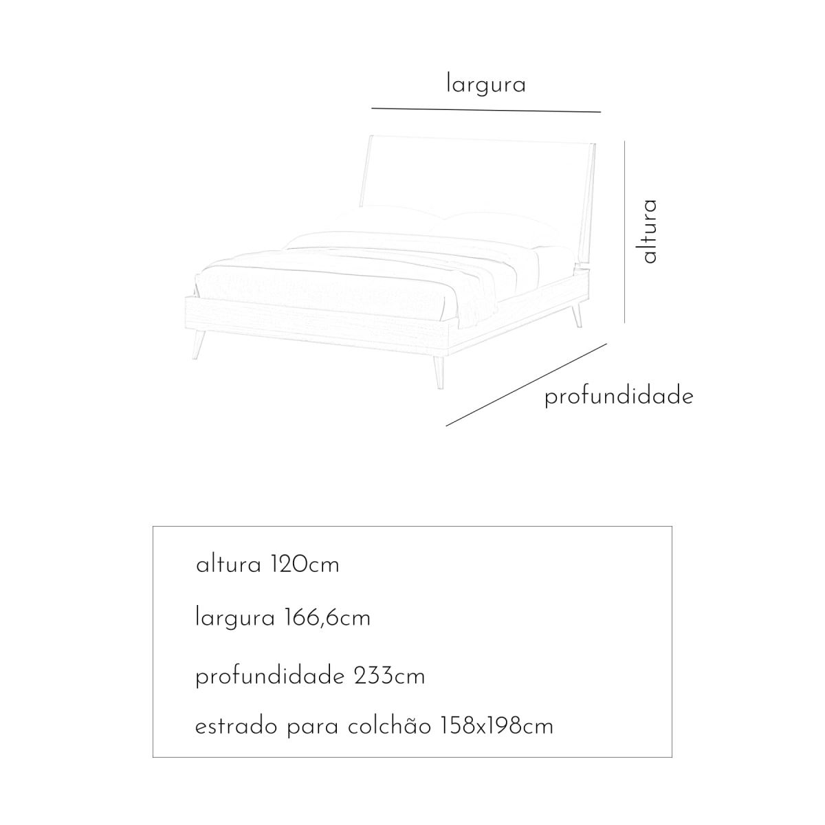 Produzida em madeira maciça lyptus. Cabeceira estofada em espuma D26 e tecido. Estrado duplo com pé central. *Produto entregue desmontado. Nível de dificuldade de montagem: difícil. Necessária montagem profissional.