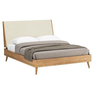 Produzida em madeira maciça lyptus. Cabeceira estofada em espuma D26 e tecido. Estrado duplo com pé central. *Produto entregue desmontado. Nível de dificuldade de montagem: difícil. Necessária montagem profissional.