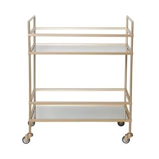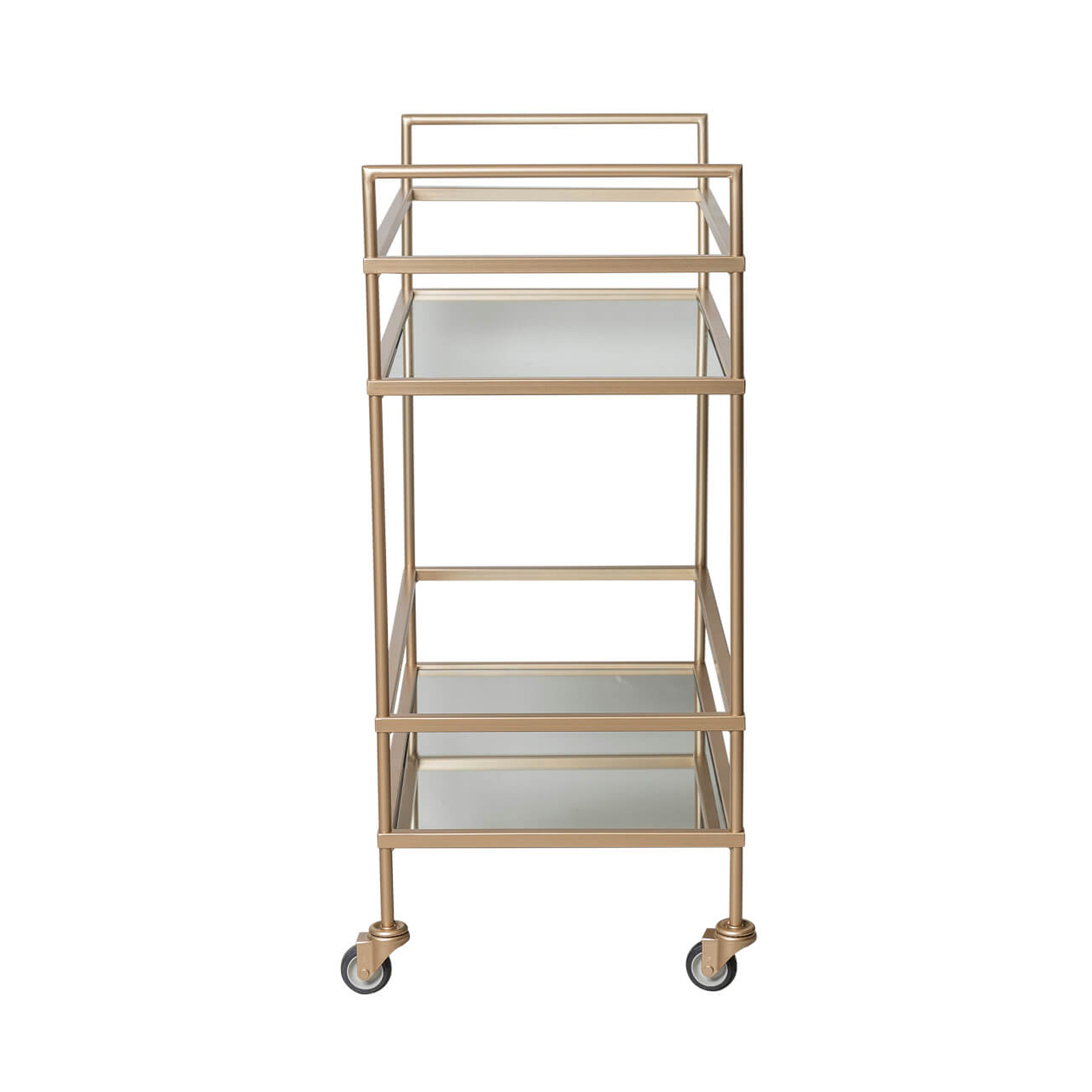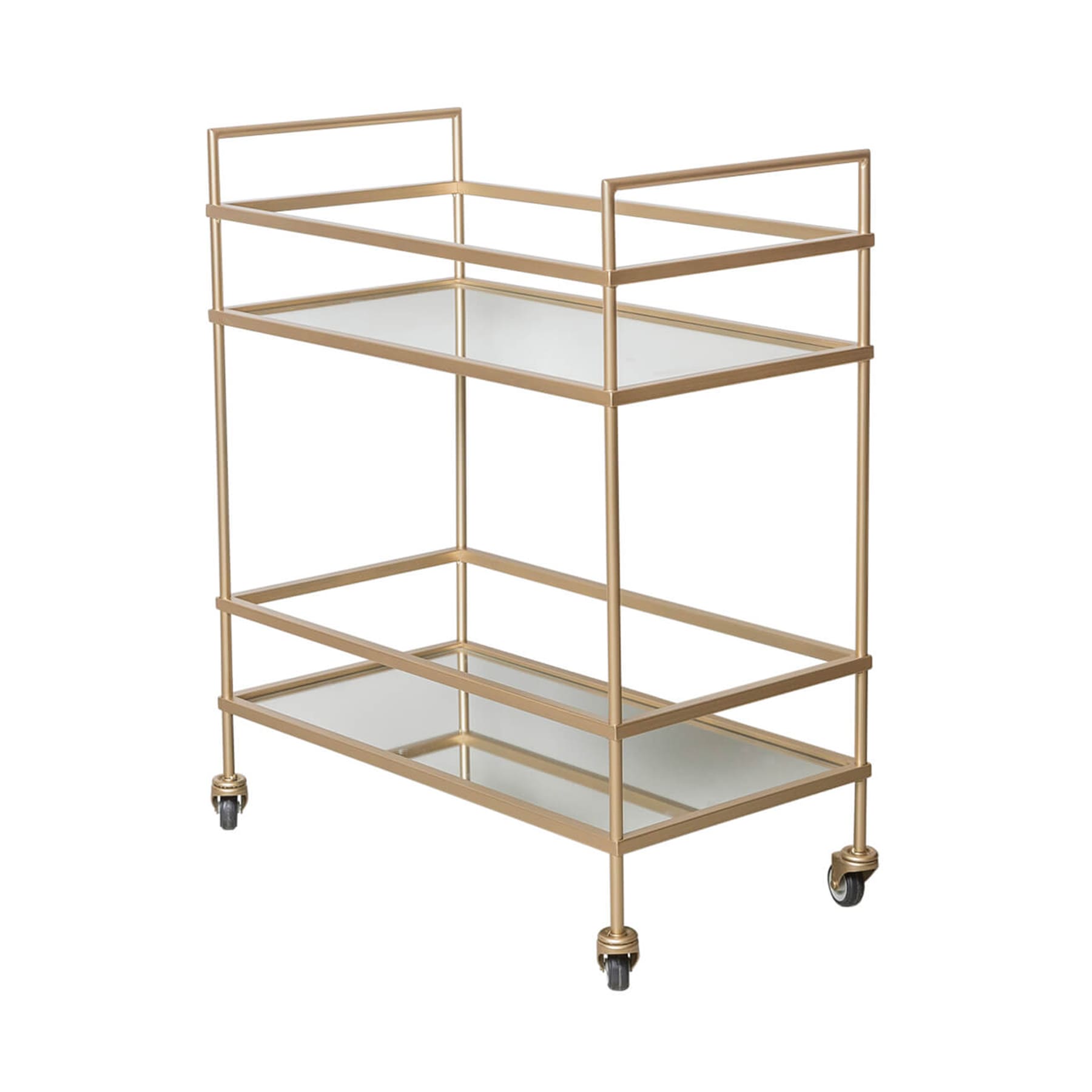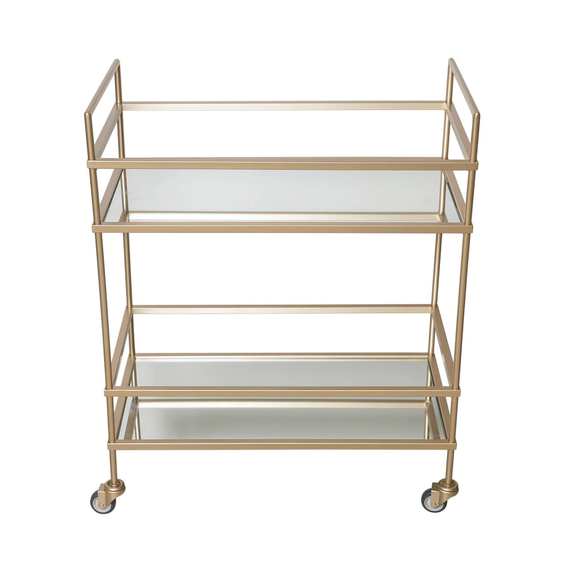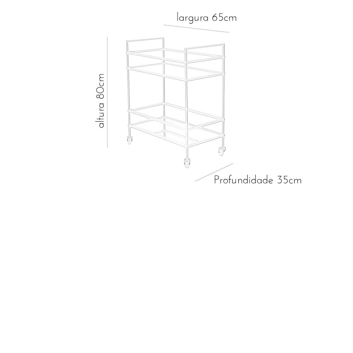 Produzido em aço carbono com pintura especial de alta resistência dourada. Rodinhas em metal e silicone. Tampos em espelho 4mm. *Produto entregue montado.