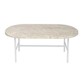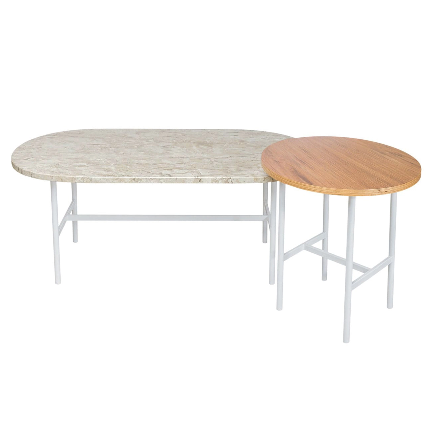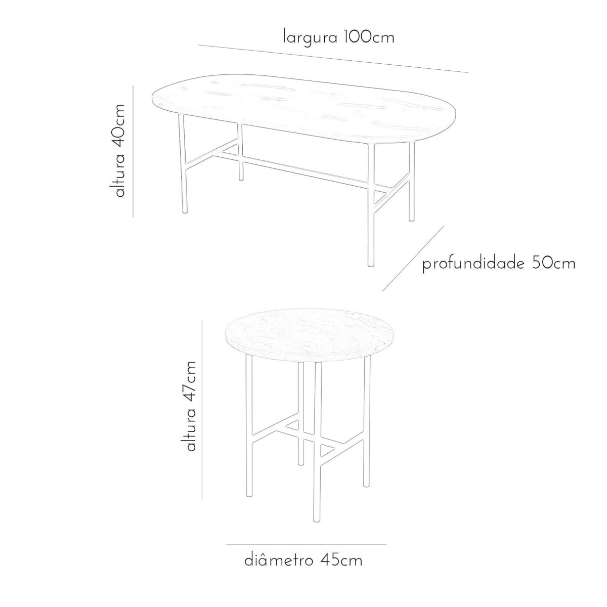 Bases produzidas em tubo de aço carbono com acabmento em pintura epóxi preta ou branca fosca. Tampo oval em mármore travertino nacional (bege bahia) e tampo redondo em MDF de 18mm com acabamento em lâmina natural de madeira louro freijó. *Atenção: o mámore é um material natural o que não permite a produção de duas peças iguais, assim o produto apresenta variações de desenho no tampo. *Produtos entrtegues montados.