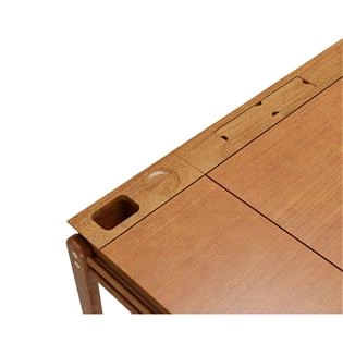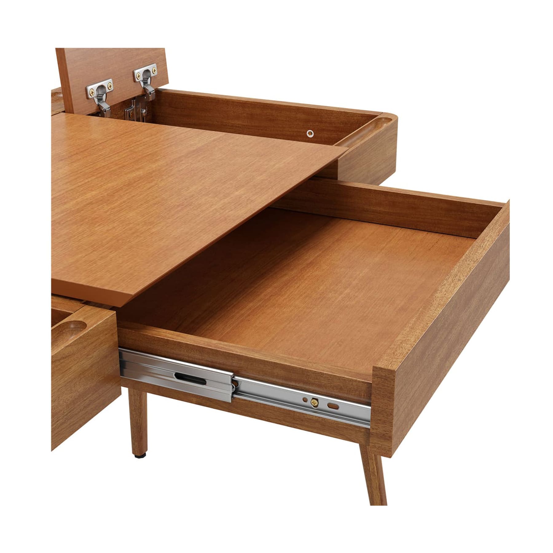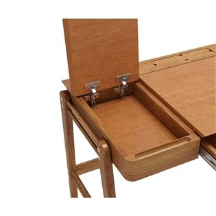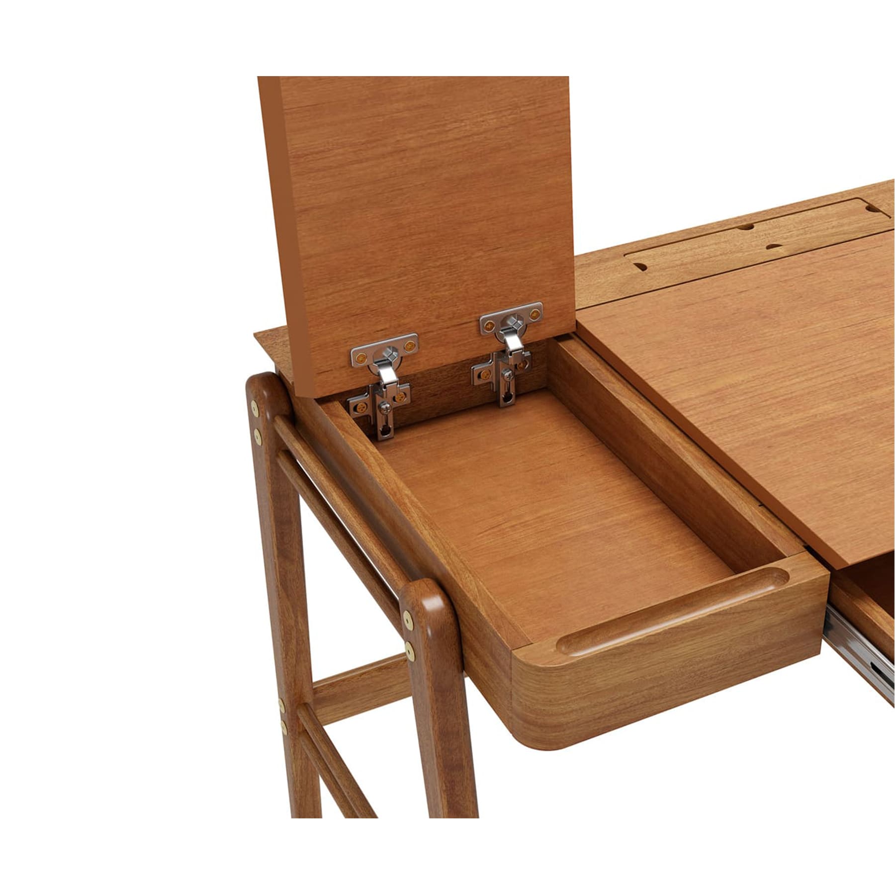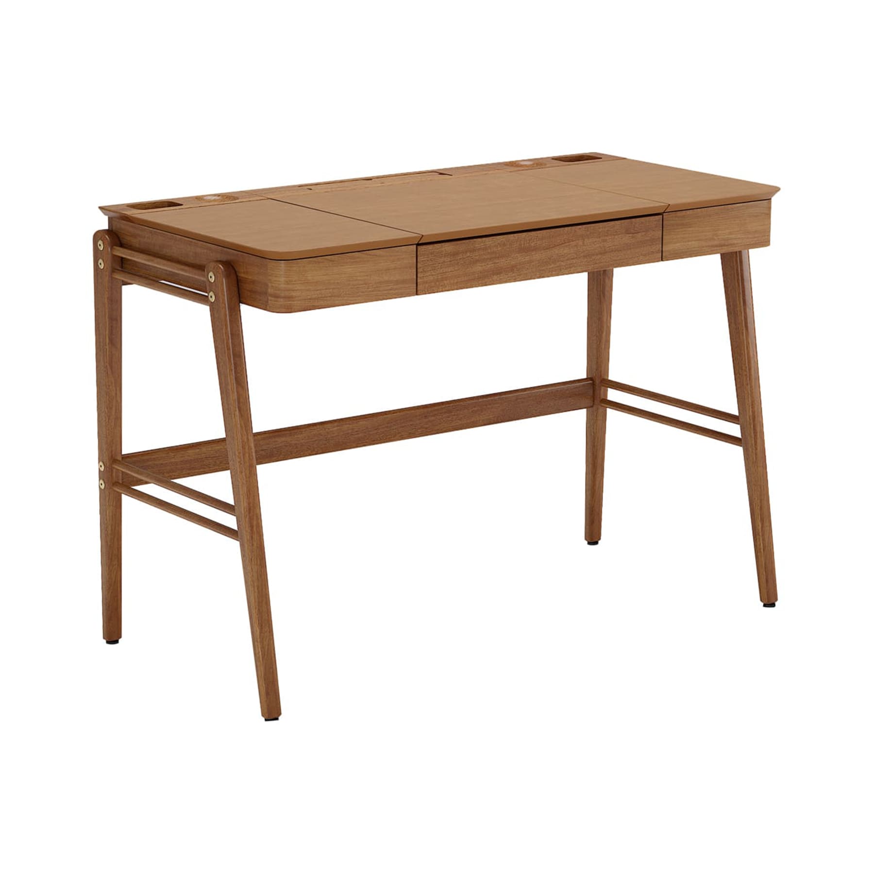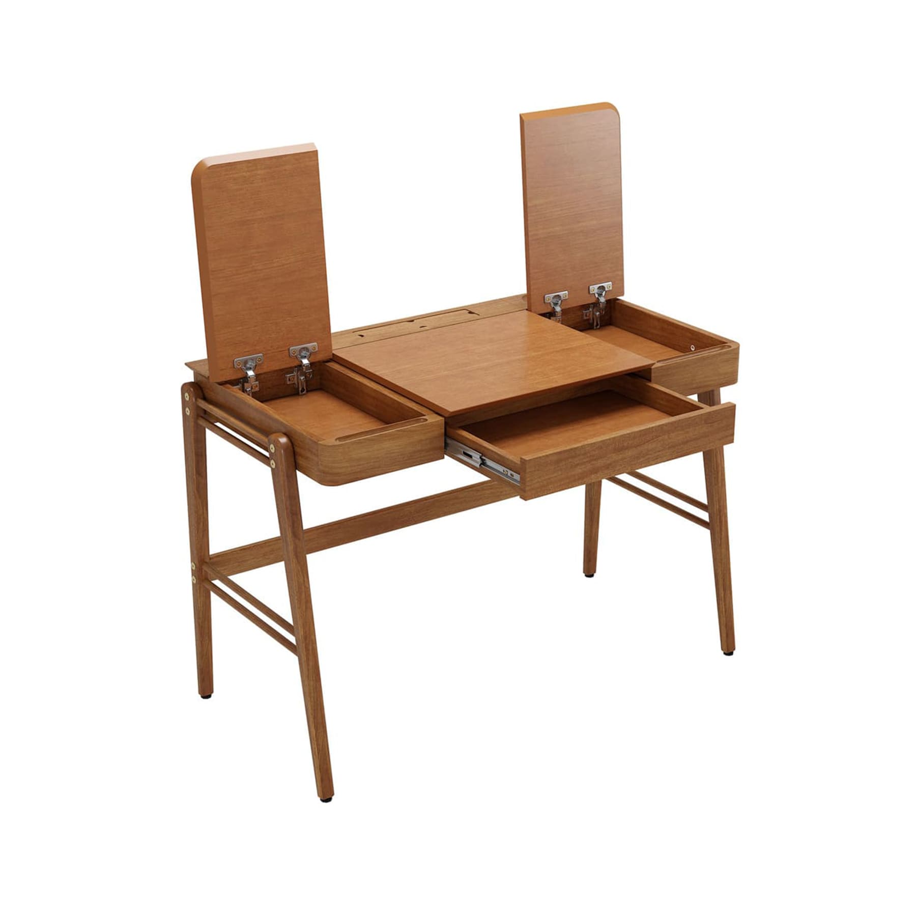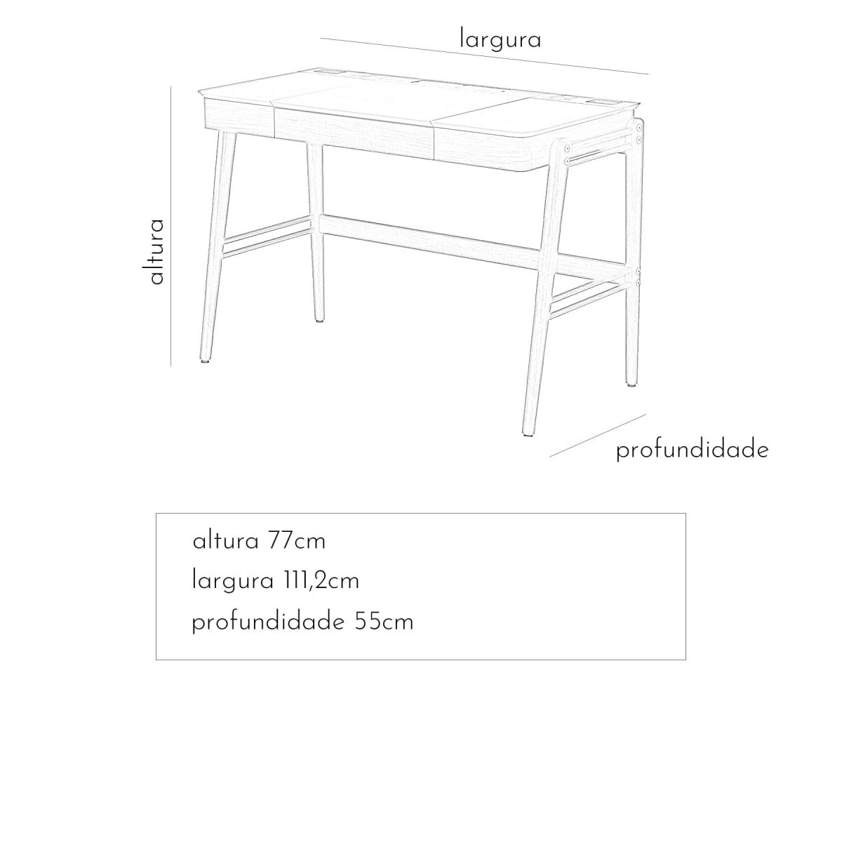 Toda em madeira natural, a escrivaninha moki é cheia de espaços para objetos, o que faz dela uma peça perfeita para ser usada também como penteadeira. O desenho é sofisticado e cheio de detalhes contemporâneos.
