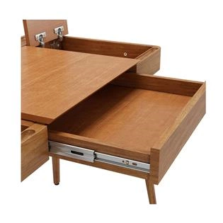 Pés em madeira maciça. Tampo em MDF revestido em lâmina de madeira natural jequitibá tingida. Gaveta com trilho telescópico. *Produto entregue semi montado. Nível de dificuldade de montagem: médio. Recomendada montagem profissional.