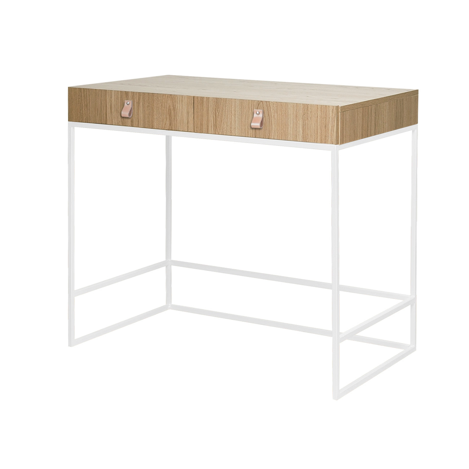 Base produzida em aço carbono com pintura eletrostática na opção preto e automotiva na opção dourada. Caixa produzida em MDF com revestimento em melamina BP branca ou Carvalho Hanôver da Duratex®. Gavetas com ferragens telescópicas e puxadores em couro natural tipo sola. *Produto entregue montado.