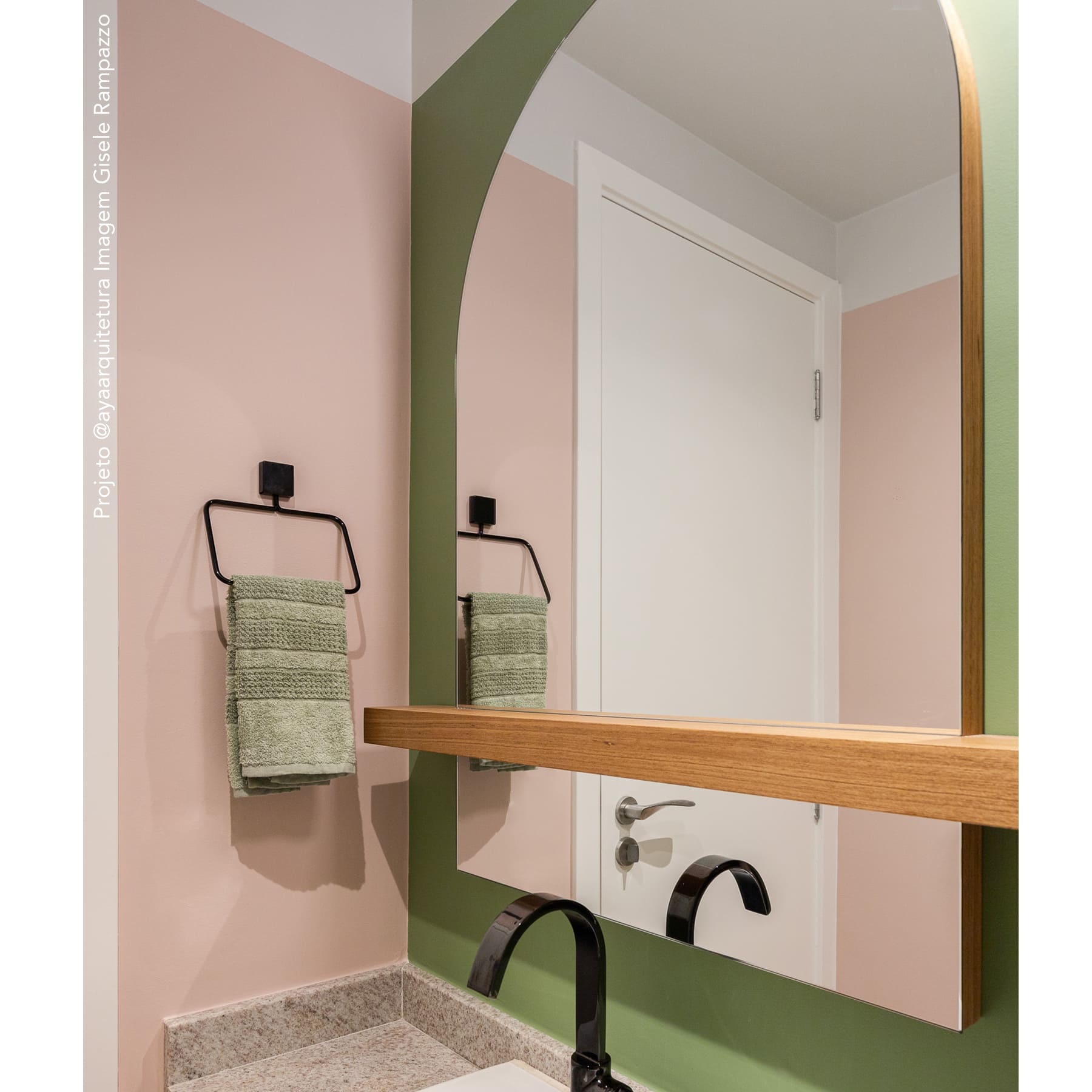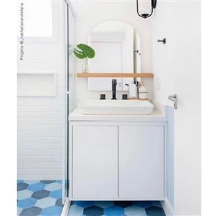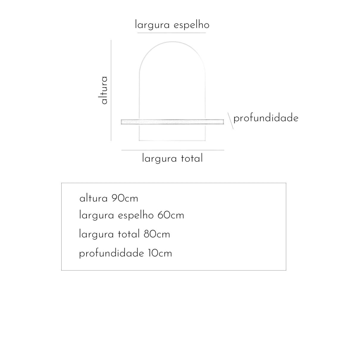 Base e prateleira em MDF com acabamento em lâmina de madeira louro freijó. Espelho cristal prata de 4mm. Acompanham ferragens para fixação. *Produto entregue montado.