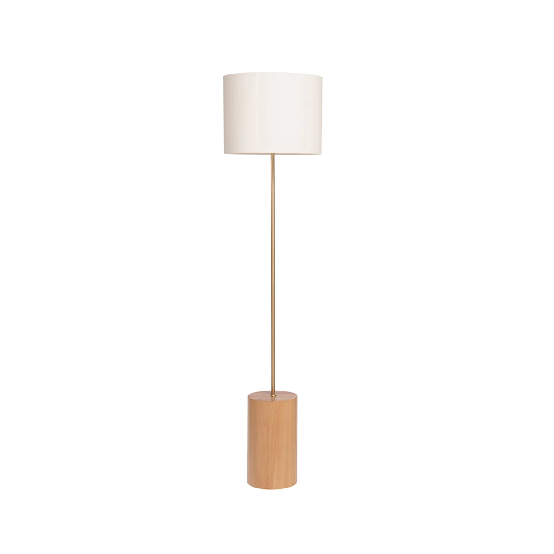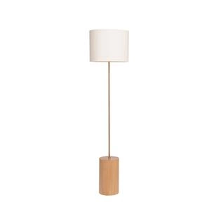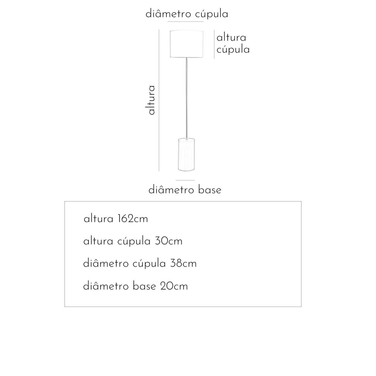 Base em madeira maciça, tubo em aço carbono com pintura automotiva metalizada dourada e cúpula em 100% algodão. Fio interno com interruptor de piso. Para lâmpada com soquete tipo E27. *A lâmpada não acompanha o produto.