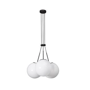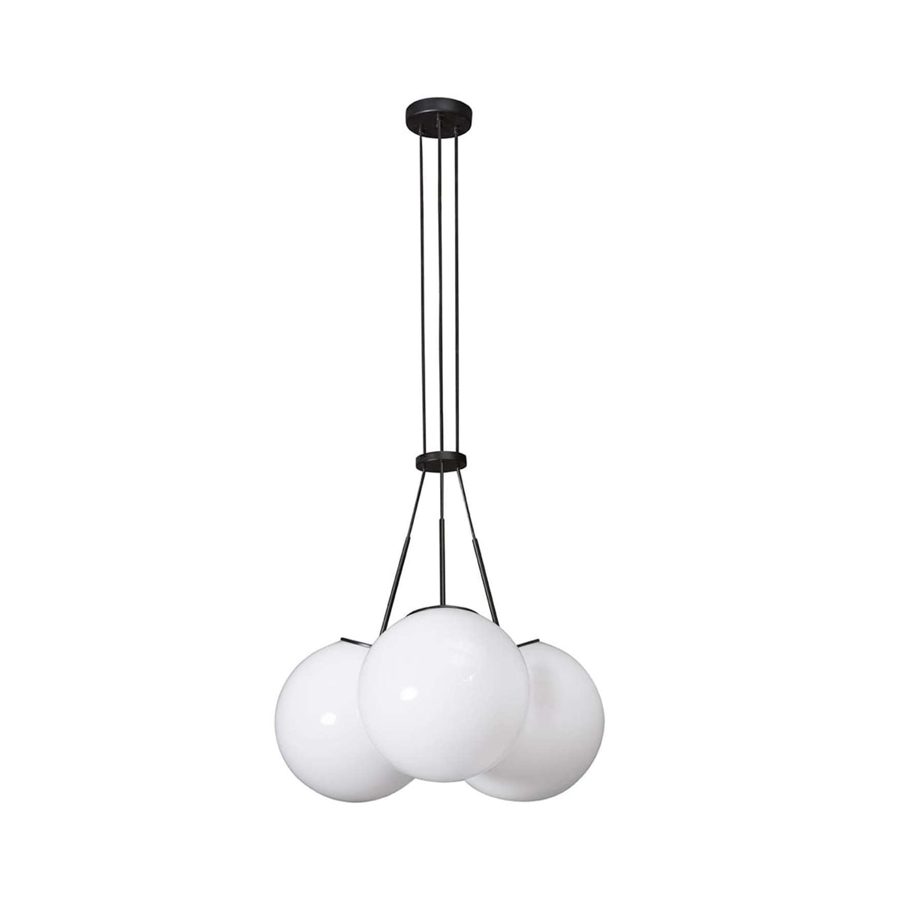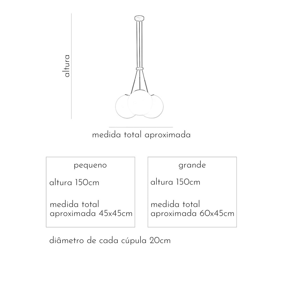 Cúpulas em vidro leitoso produzido artesanalmente em 3 camadas, com coloração do vidro (não por jateamento). Canoplas em madeira natural ebanizada. Detalhes de acabamento dos fios em metal com pintura epoxi preta. Soquete para lâmpada E27.