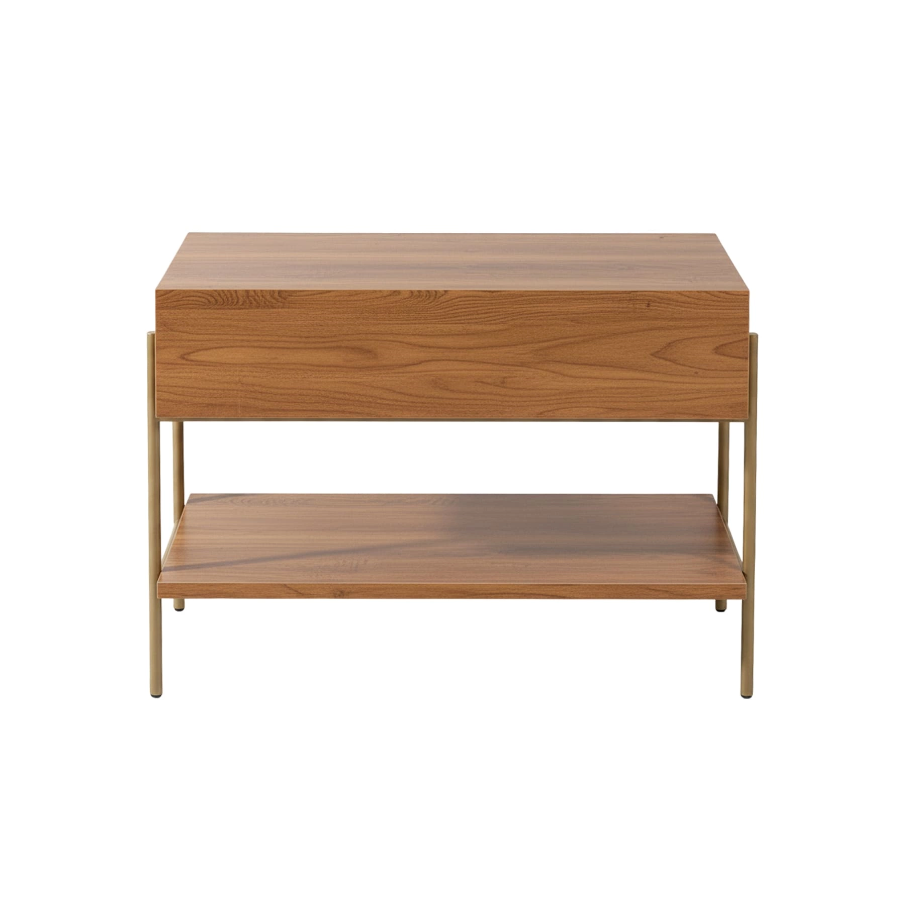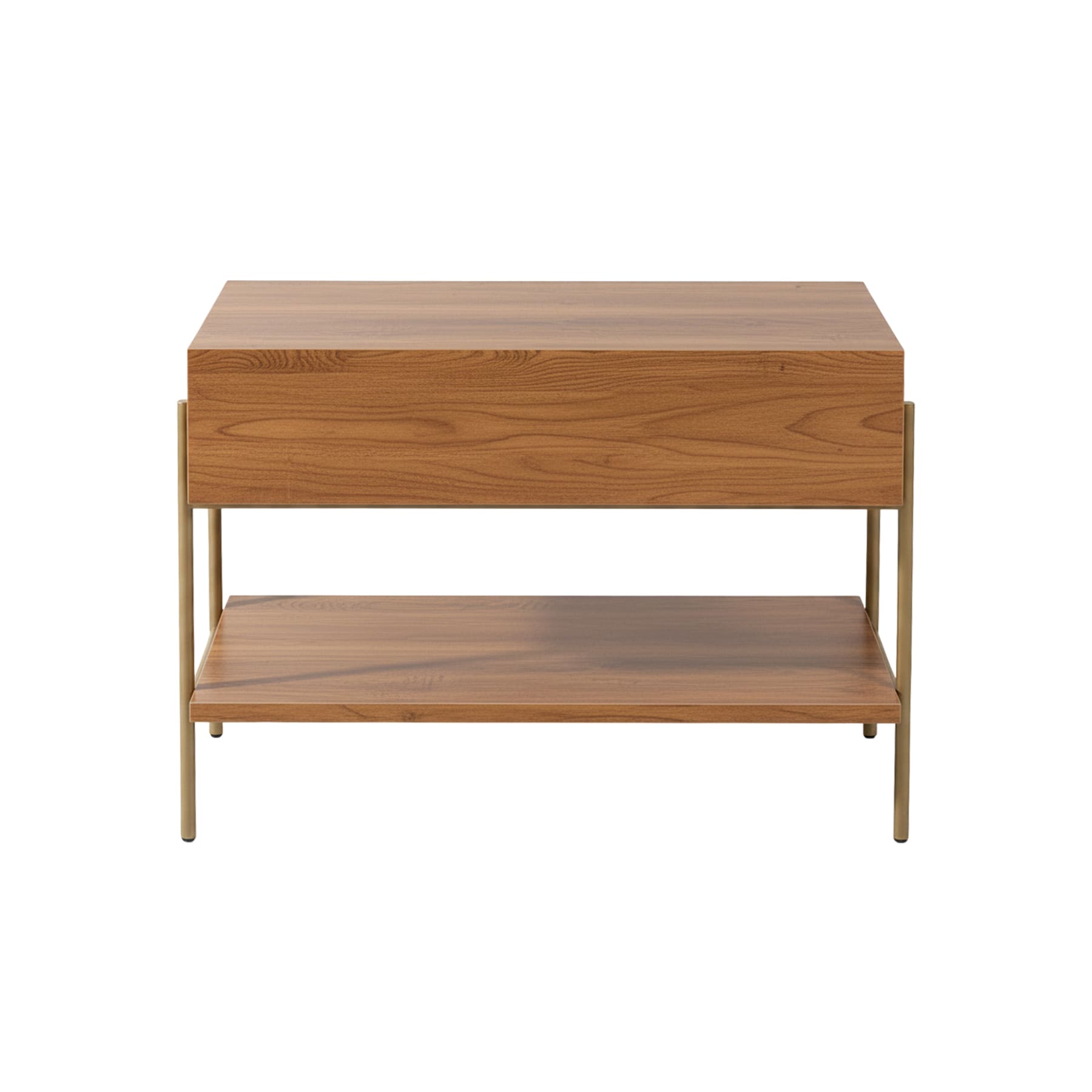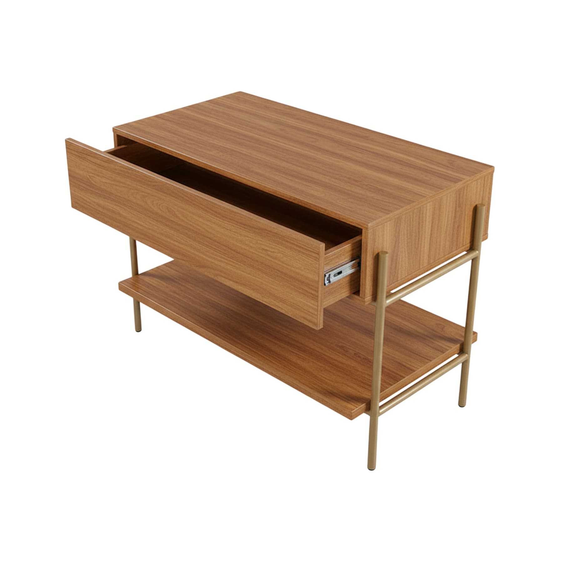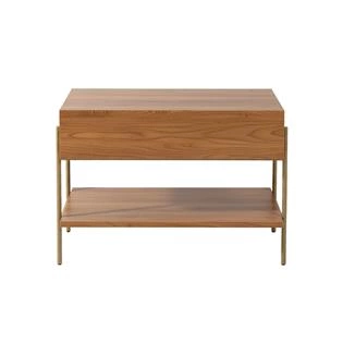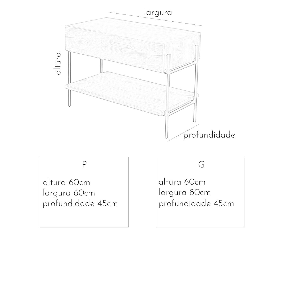 Estrutura em aço corten com pintura epóxi em dourado fosco ou preto. Caixa e prateleira produzidas em MDF com acabamento em lâmina natural de madeira cinamomo. *Esta peça pode ser produzida em outras opções de acabamento. Para informações sobre personalização, entre em contato através de qualquer canal de atendimento. *Produto entregue montado.