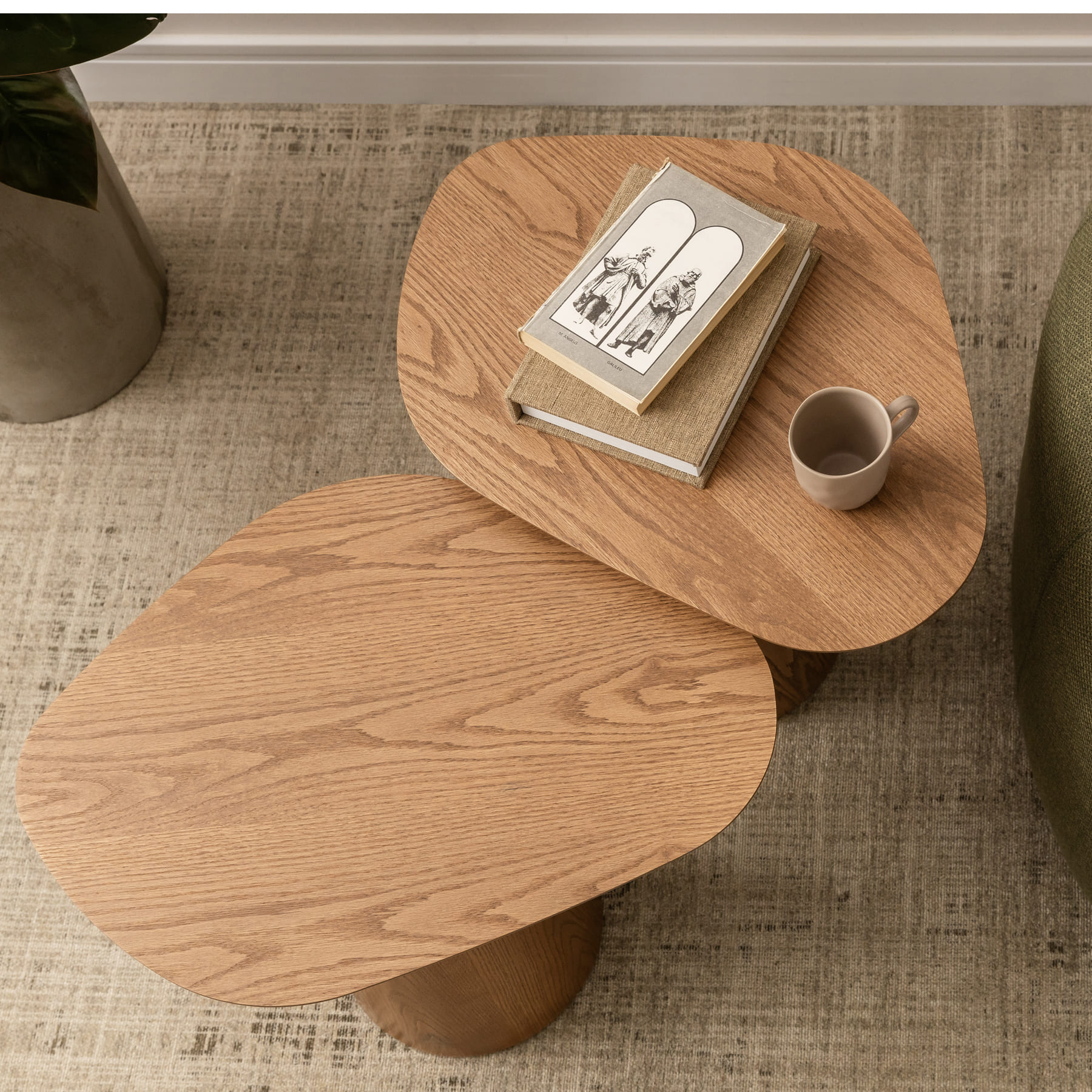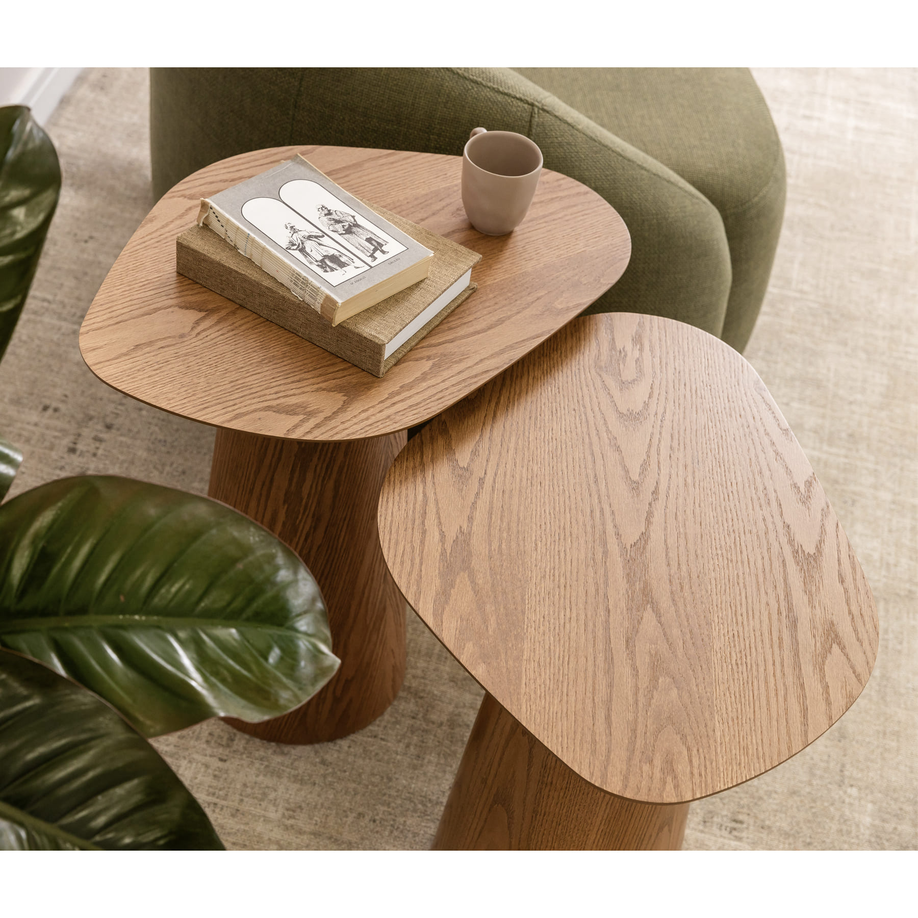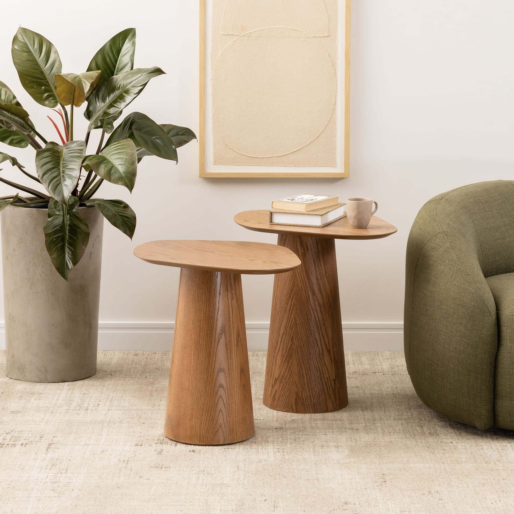 Com design escultural e orgânico, a mesa lateral amana em madeira carvalho se torna um destaque na decoração. Visualmente impactante e funcional. A textura rica do carvalho e o formato fluido trazem uma conexão direta com a natureza.