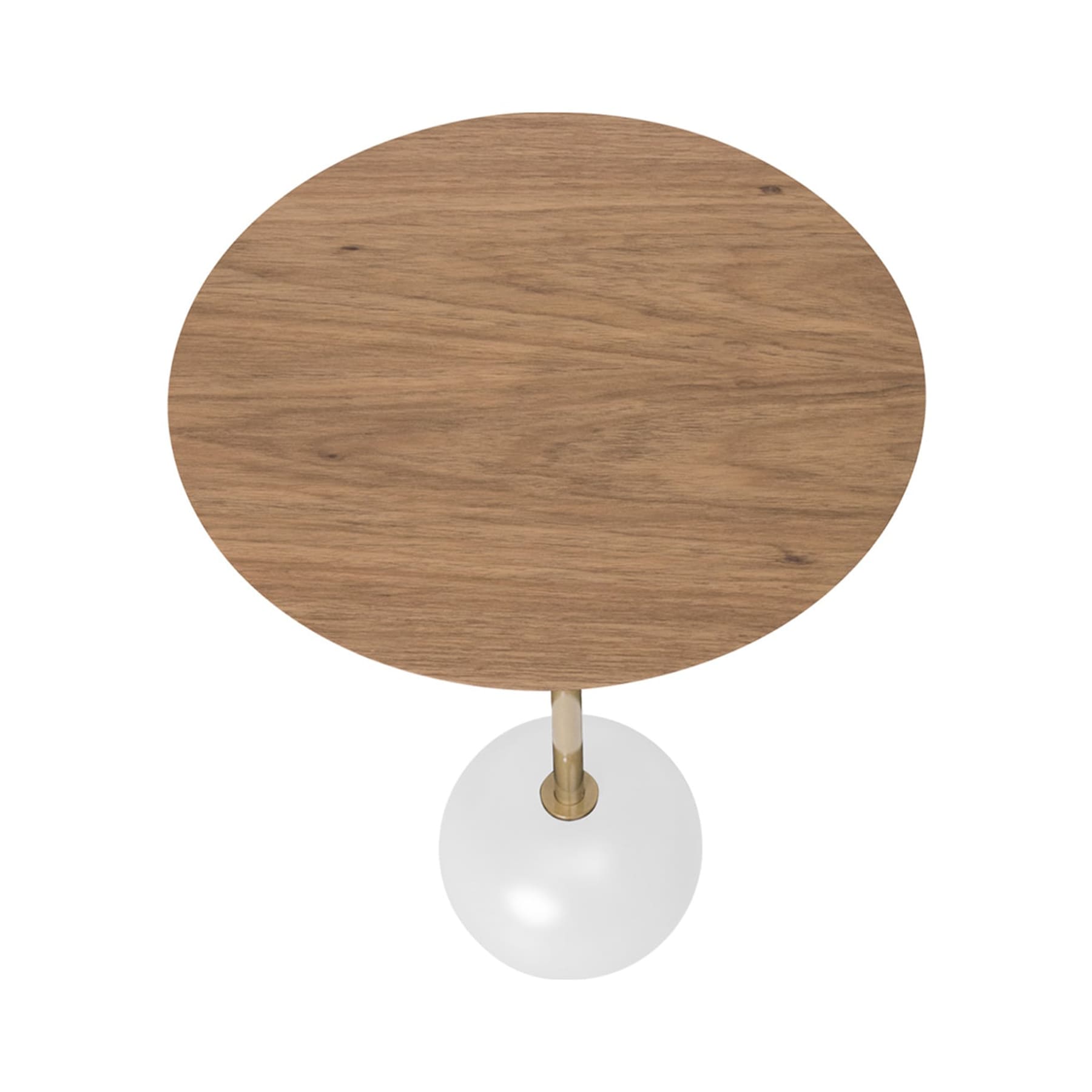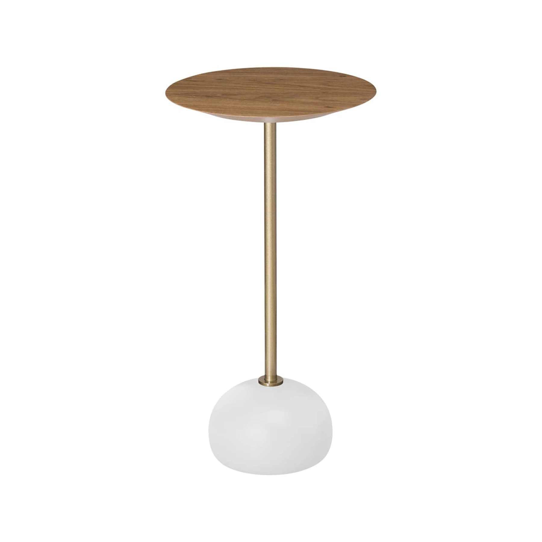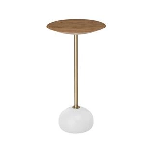 Tampo produzido em MDF com acabamento em lâmina de madeira natural (carvalho para madeira clara e nogueira na madeira escura). Tubo produzido em alumínio com acabamento em pintura automotiva dourada metálica. Base produzida em madeira com acabamento em laca acetinada na cor selecionada.*Produto entregue montado.