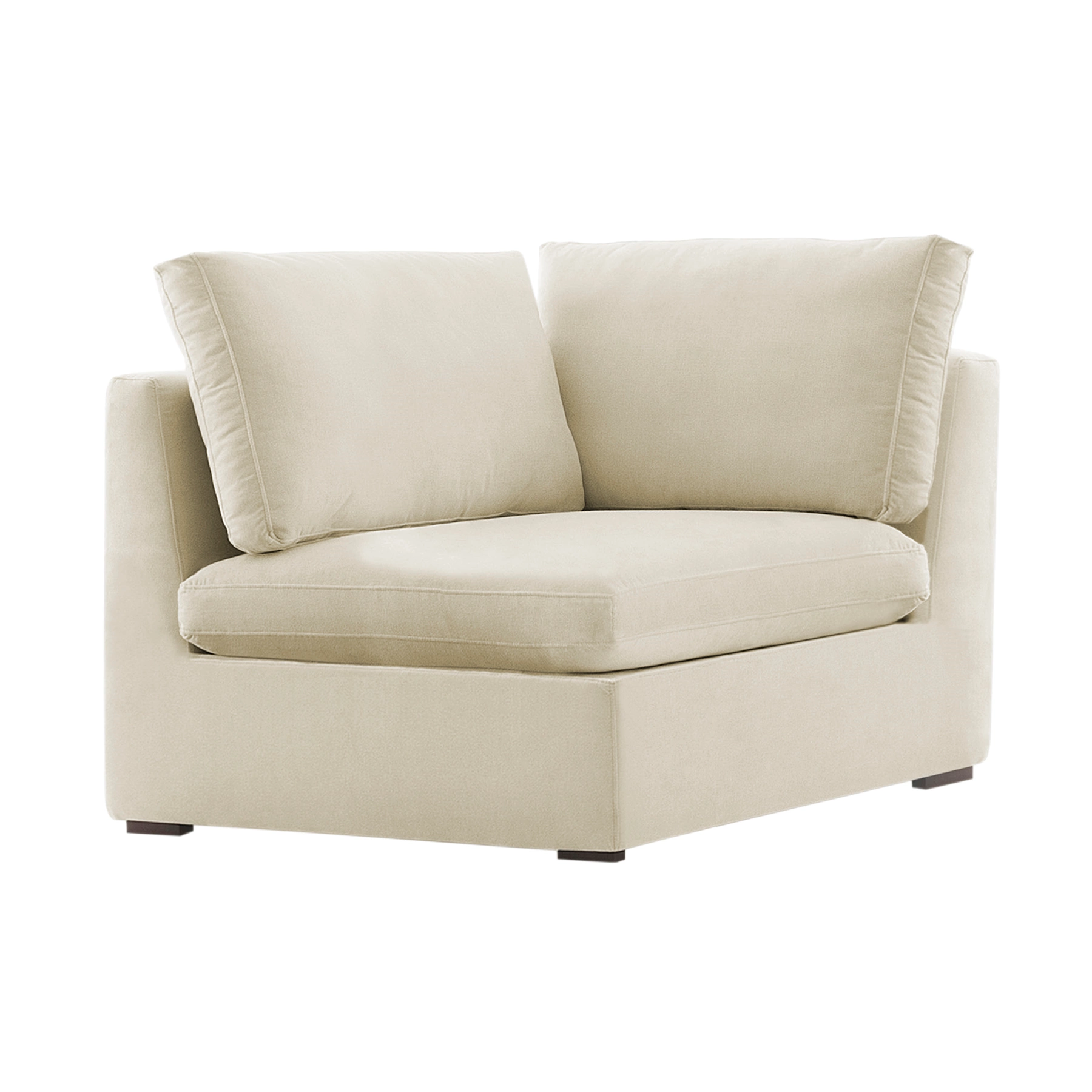 Estrutura em madeira tratada para estofaria. Almofadas de encosto soltas em fibra siliconada plumada e espuma D28. Assento com estrutura em percintas italianas e almofadas fixas em espuma D28 soft e fibra plumada. Pés ocultos em madeira maciça. Ferragens de fixação dos módulos removíveis na parte inferior do sofá.