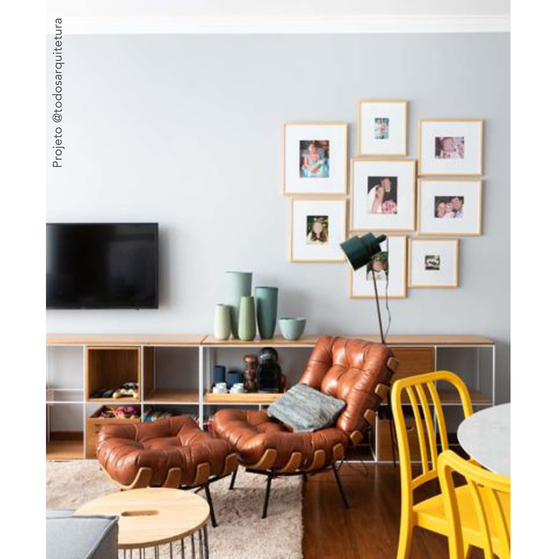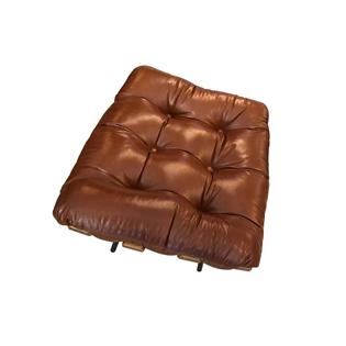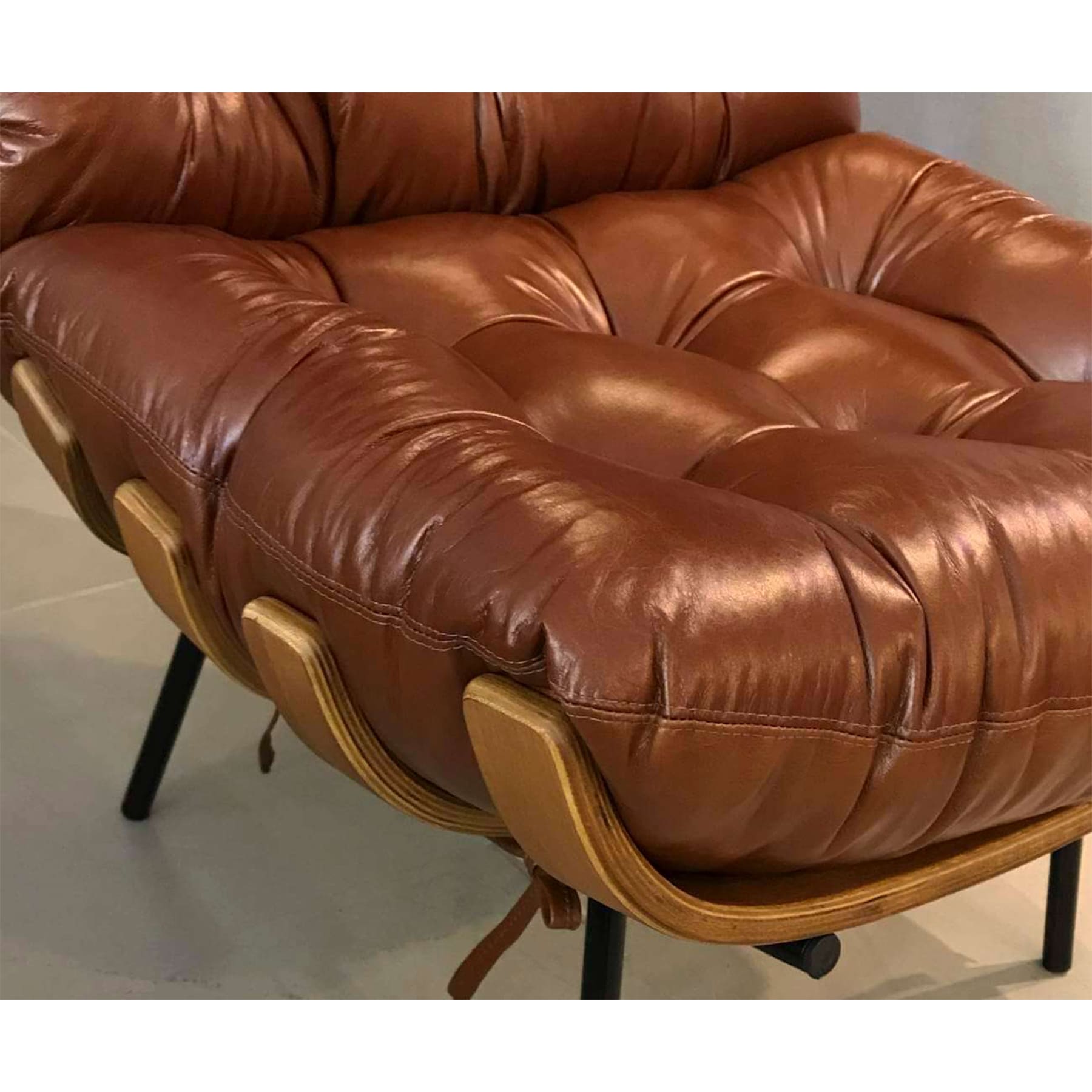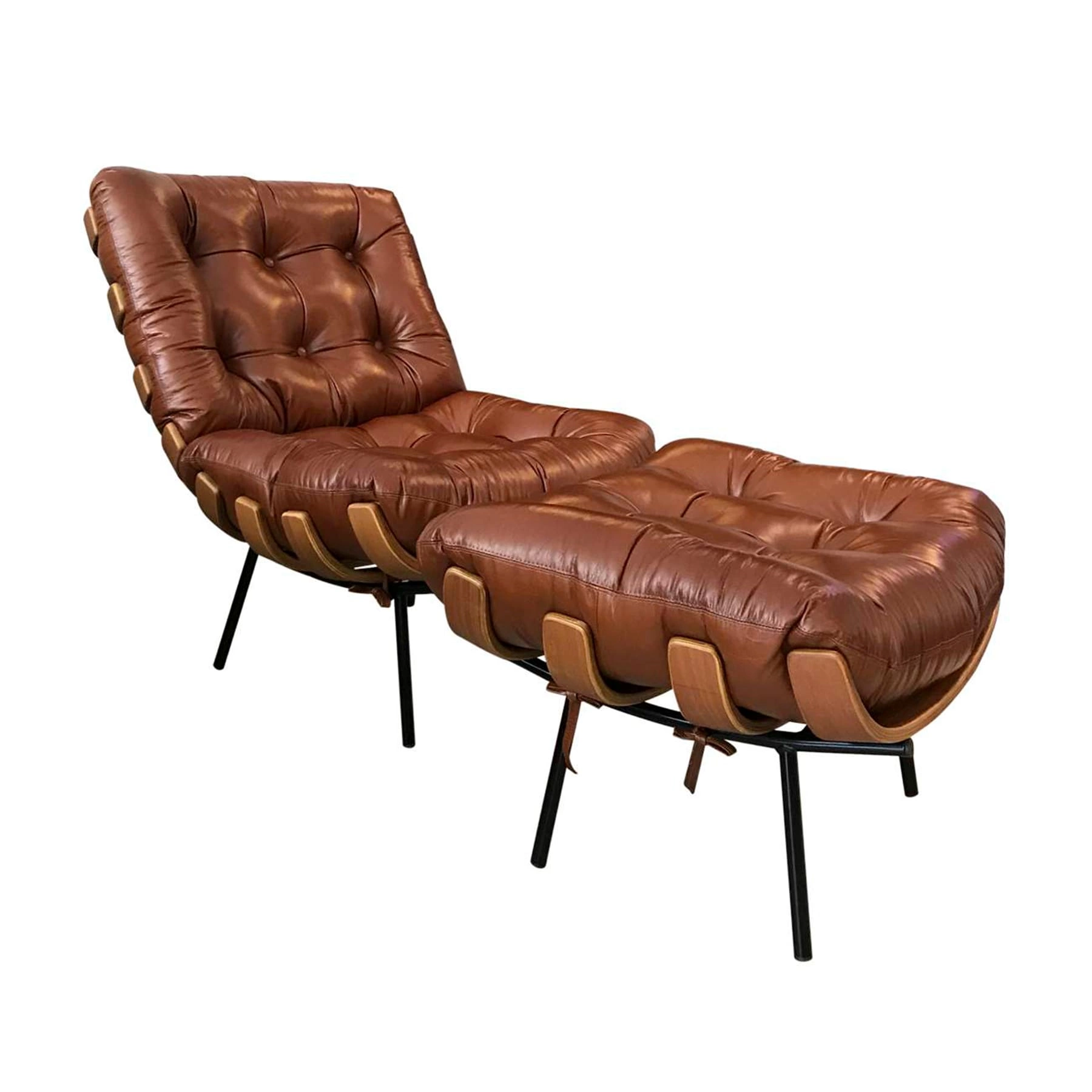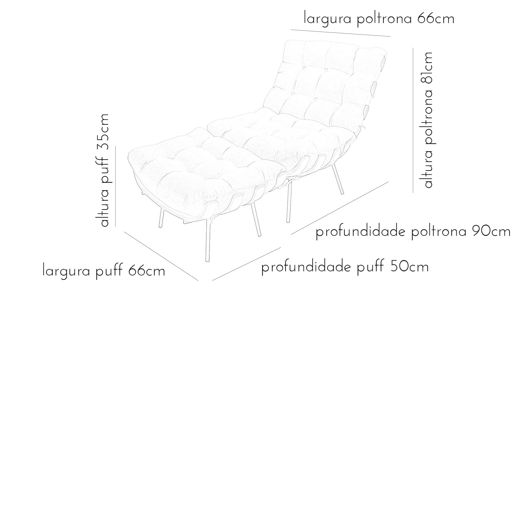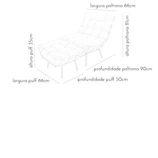 Estrutura em aço carbono com pintura epóxi e madeira multilaminada moldada. Almofadas em flocos de espuma D33 revestidas em 100% couro natural com acabamento em botonê com botões costurados.*Produto composto por duas peças: poltrona e puff.