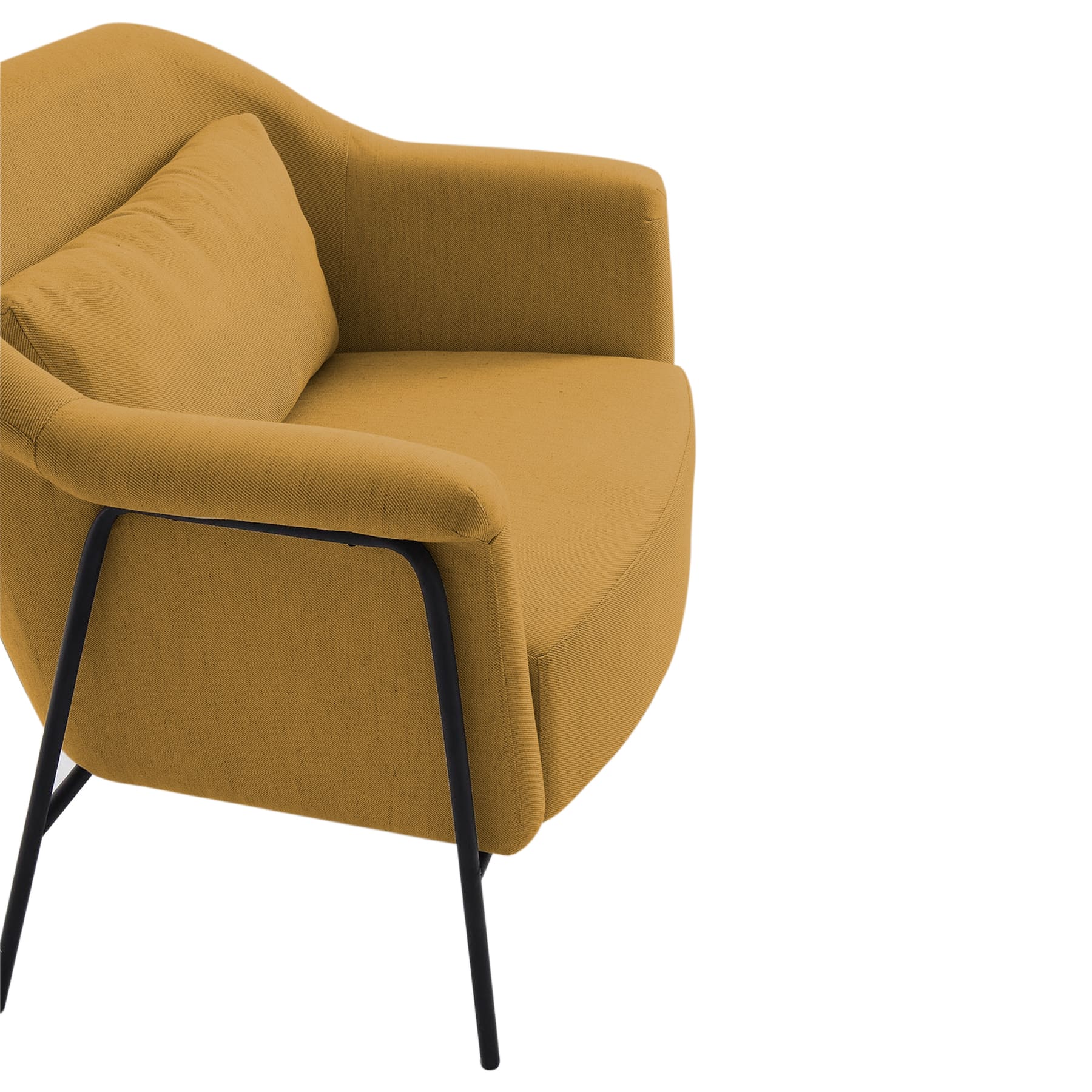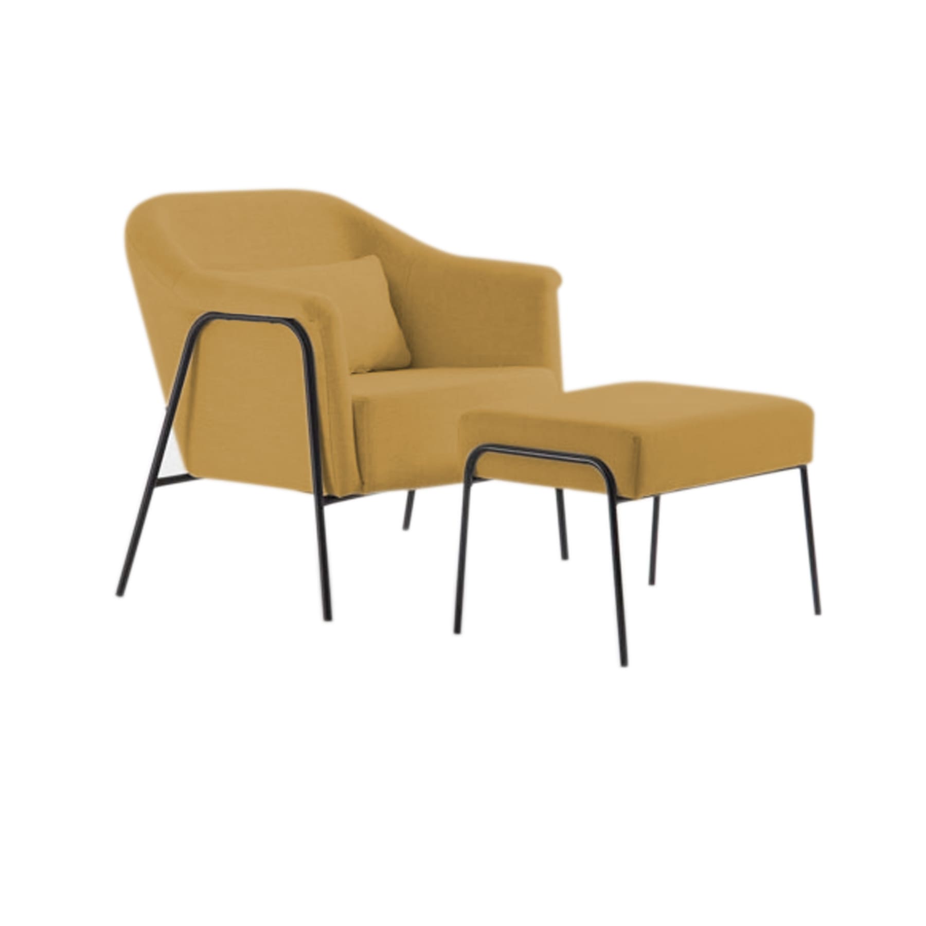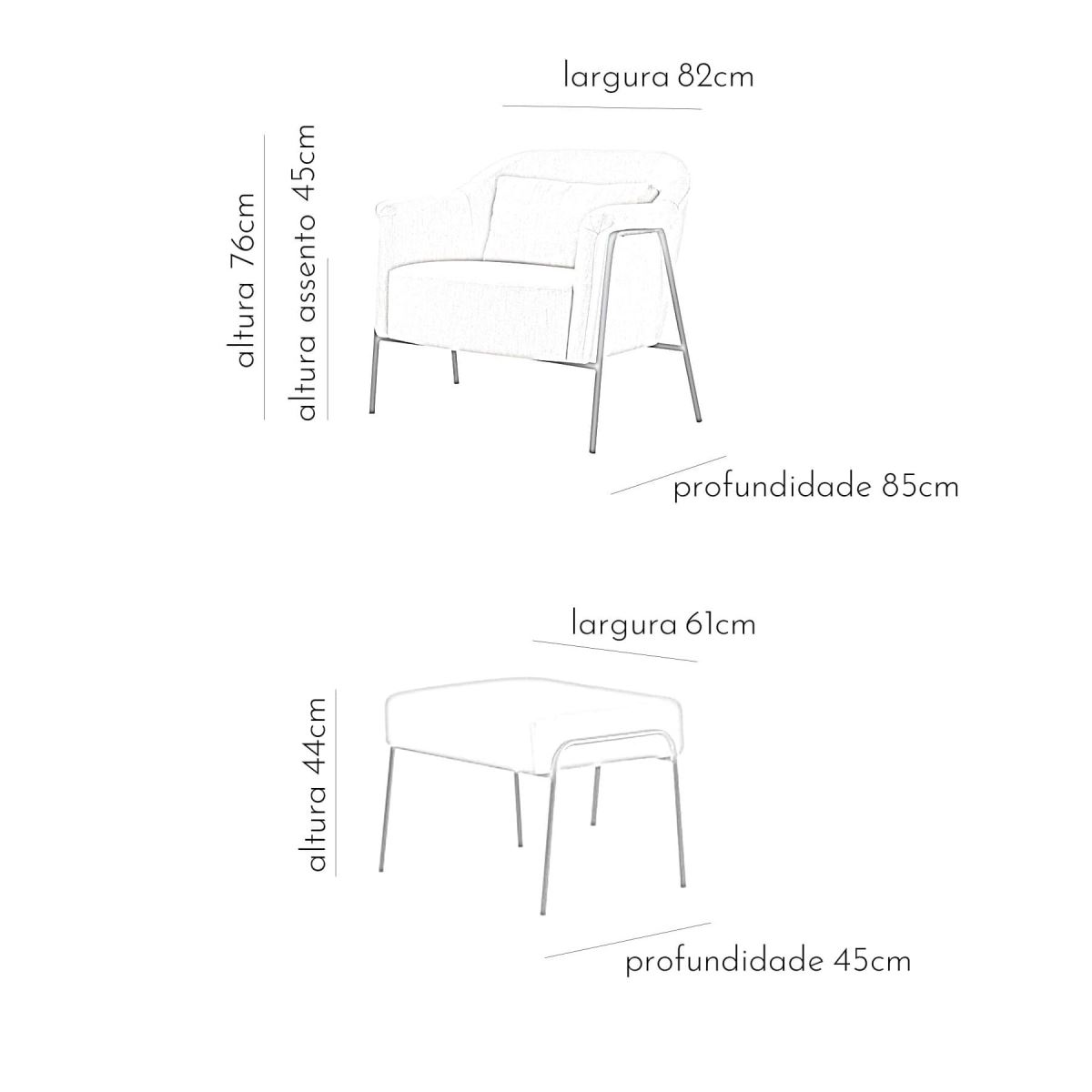 Base em aço carbono com pintura epóxi preta fosco. Concha e base do puff em madeira multilaminada curva, estofados com espuma D28 e tecido. Almofada da poltrona solta em fibra manta e tecido. *Produto entregue montado.