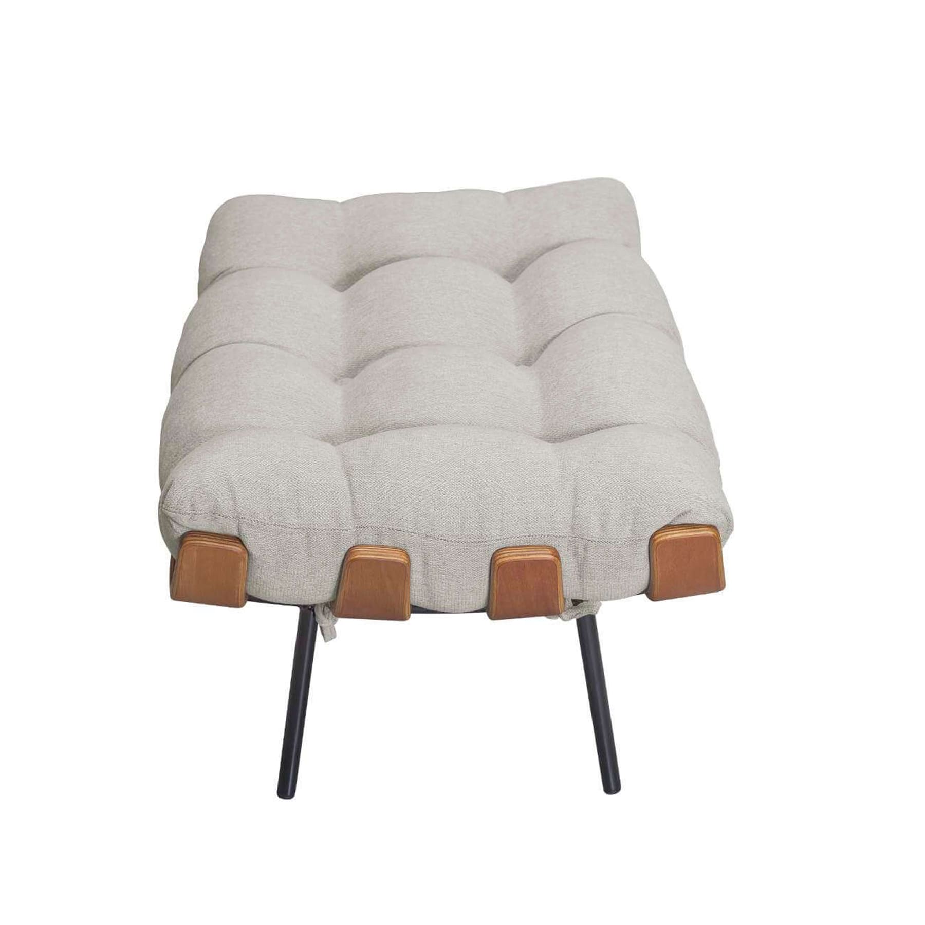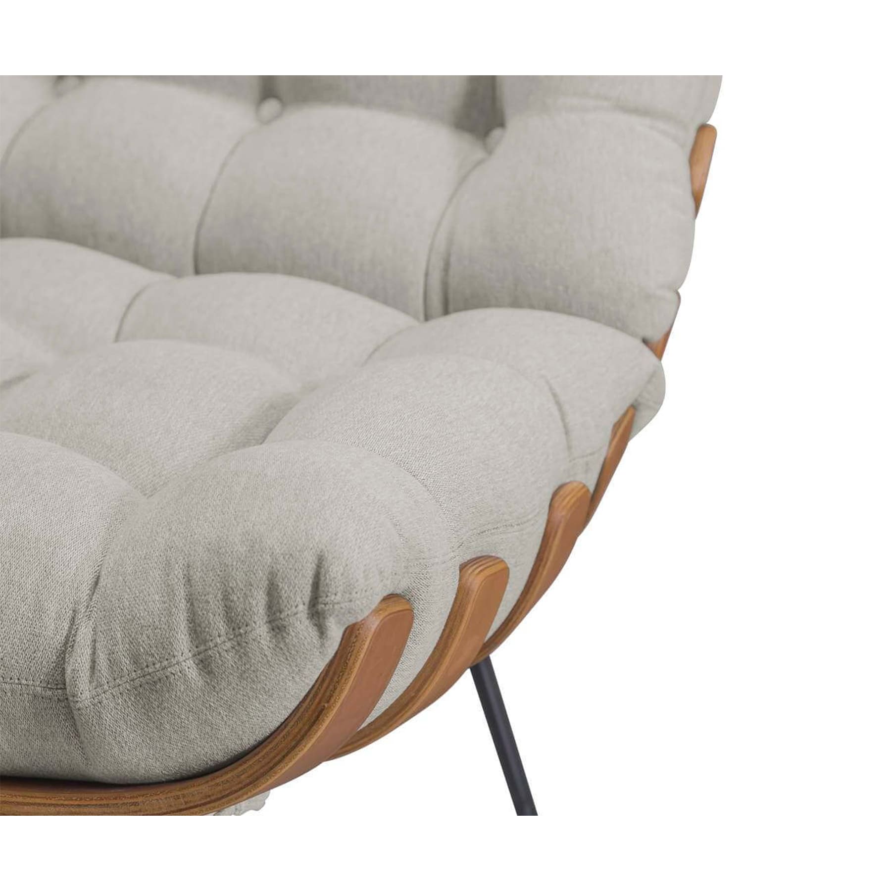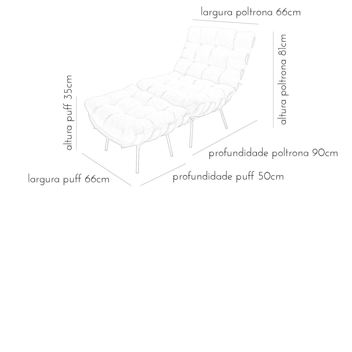 Estrutura em aço carbono com pintura epóxi e madeira multilaminada moldada. Almofadas em flocos de espuma D33 revestidas em tecido com acabamento em botonê com botões forrados e costurados.*Produto composto por duas peças: poltrona e puff.*Produto entregue montado.