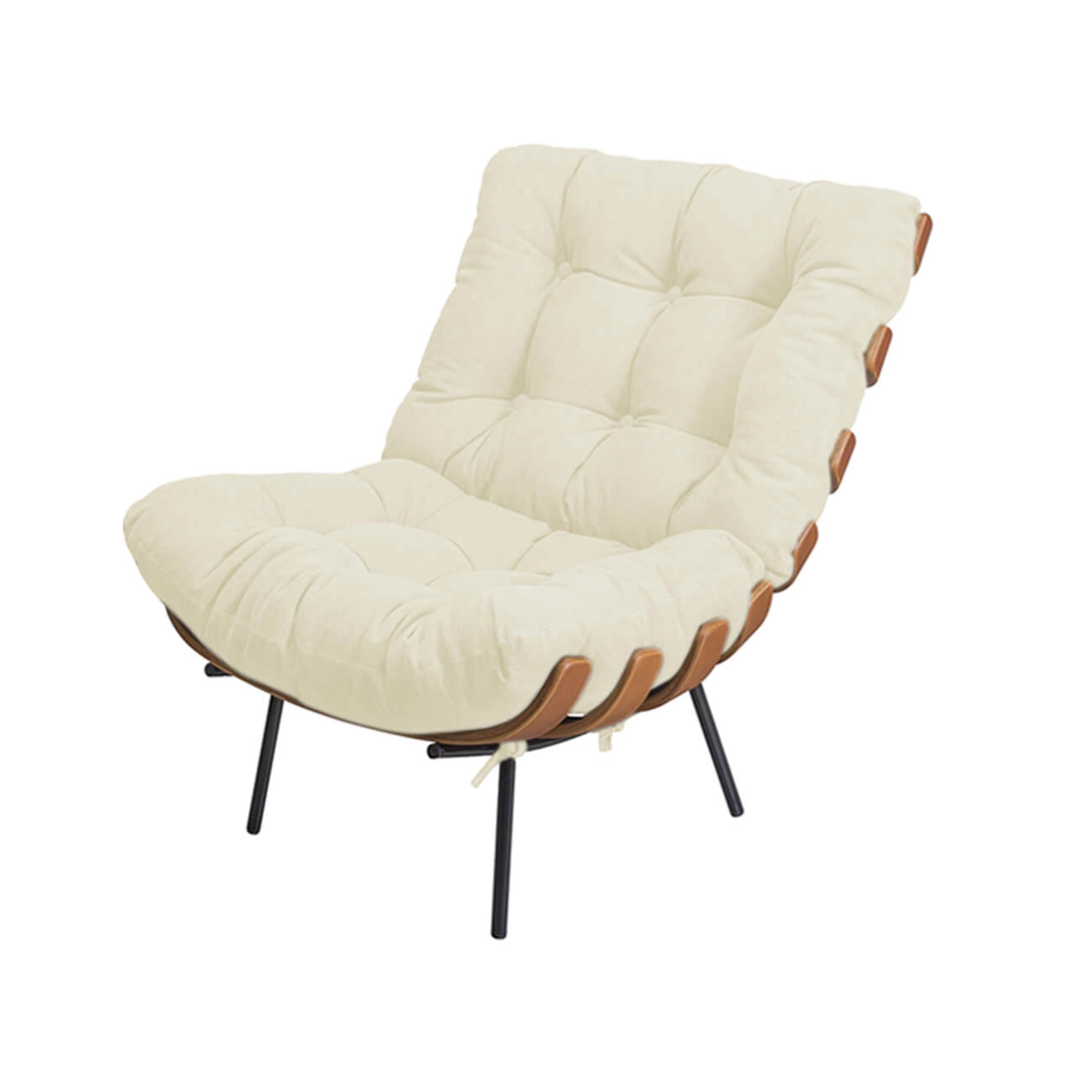 Estrutura em aço carbono com pintura epóxi e madeira multilaminada moldada. Almofadas em flocos de espuma D33 revestidas em lona 100% algodão com tratamento para estofaria, com acabamento em botonê com botões forrados e costurados.*Produto entregue montado.