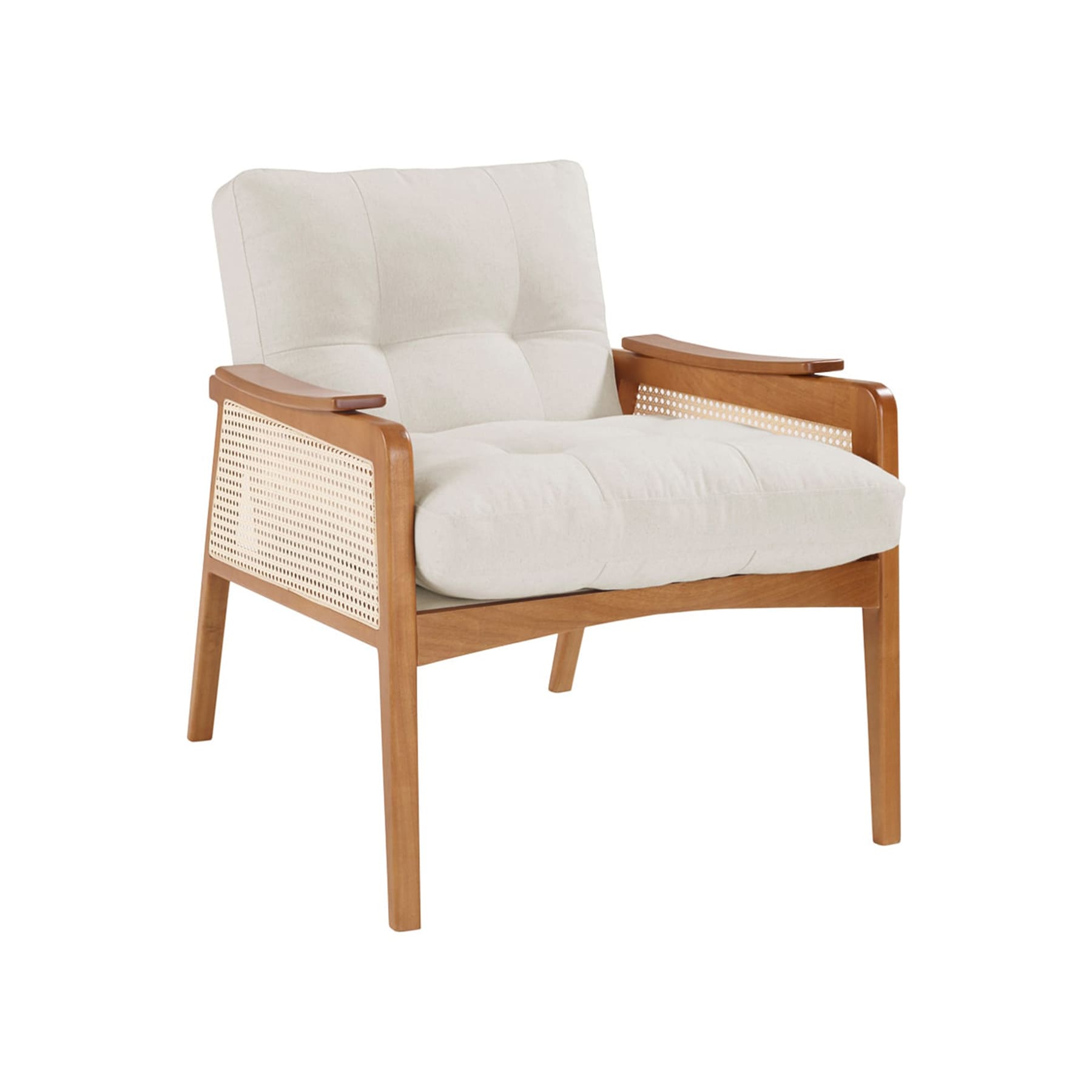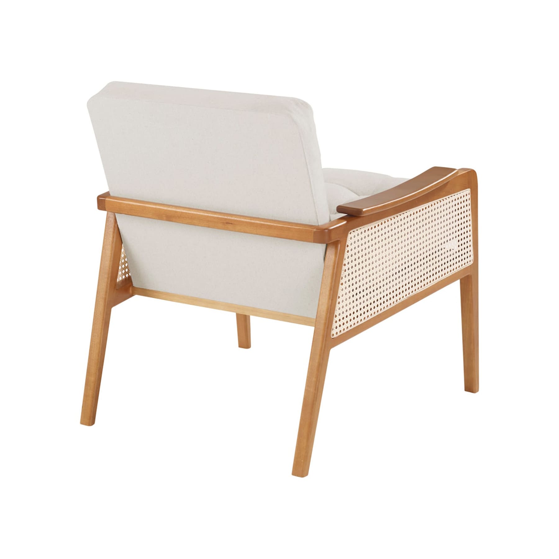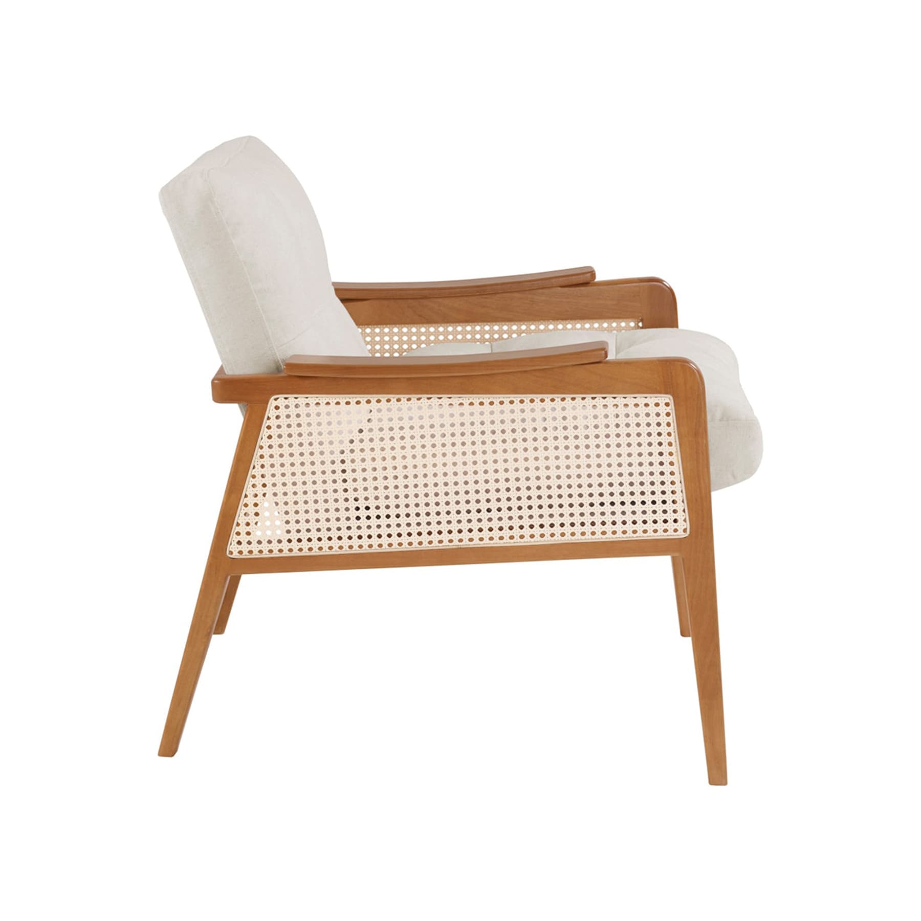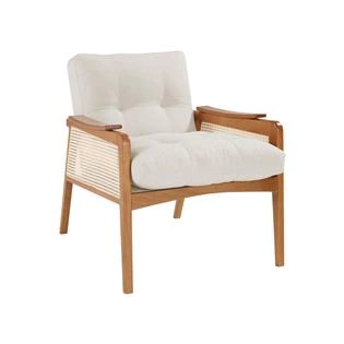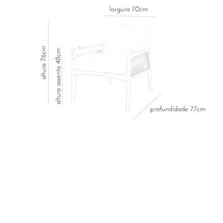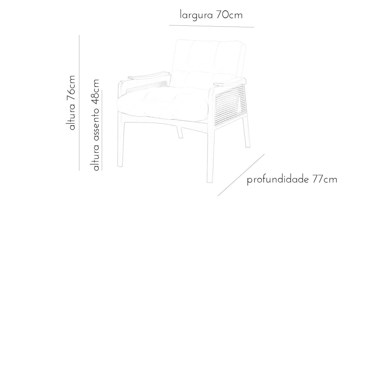 Estrutura em madeira maciça. Laterais dos braços com acabamento em palha de celulose. Encosto fixo com suporte em MDF estofado em espuma D26 e fibra acrílica. Assento com estrutura em MDF e almofada solta em espuma D28 e fibra manta acrílica. *Produto entregue montado.