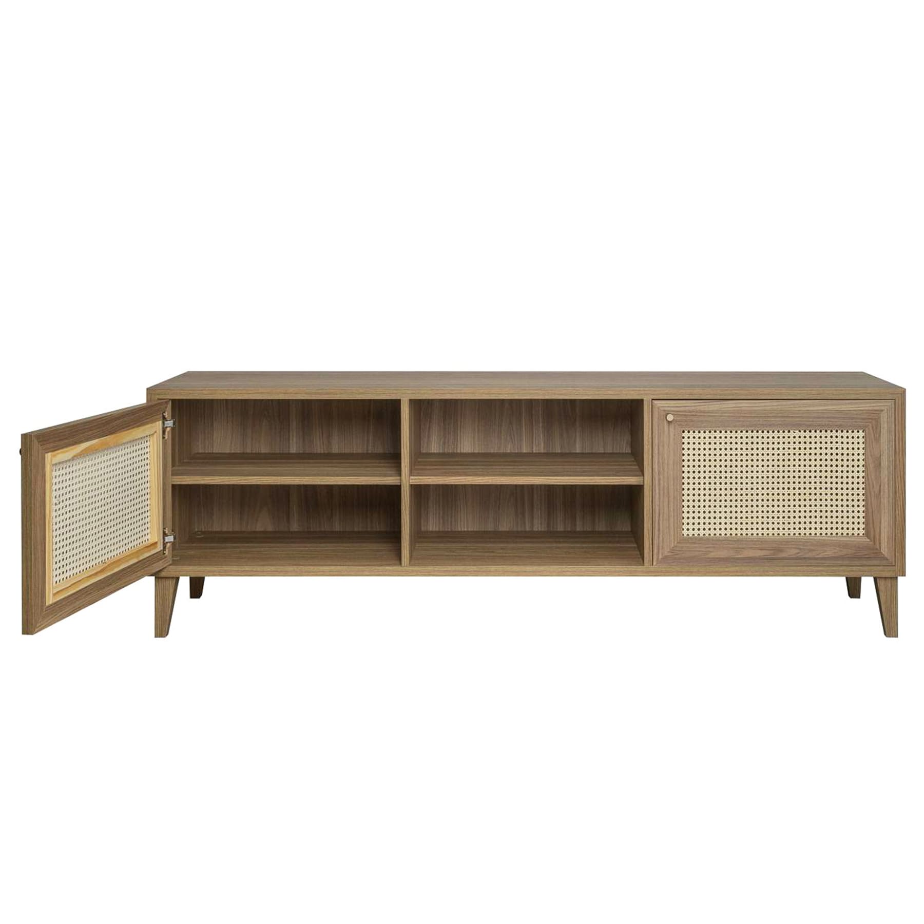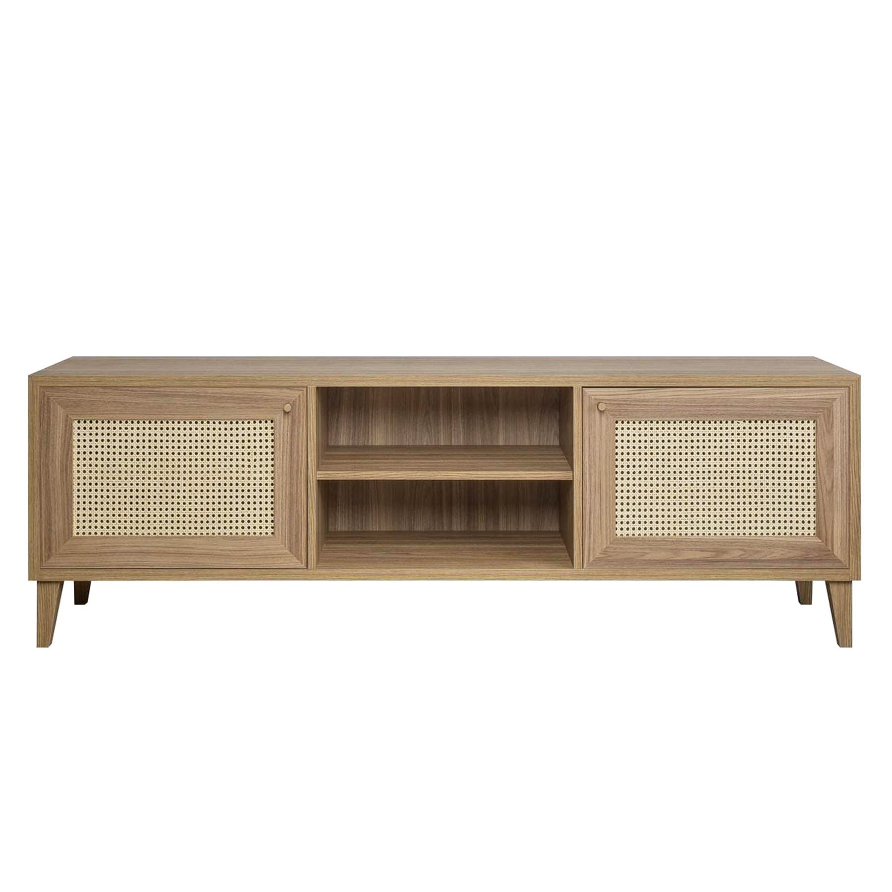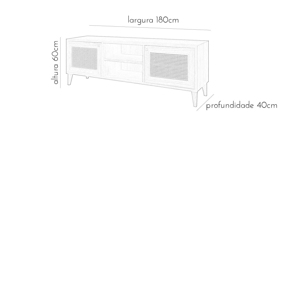 Corpo, pés e frente das portas produzidos em MDF de 25mm com acabamento em melamina BP padrão louro freijó. Puxadores em latão. Detalhes em palha de fibra natural de celulose. Prateleiras do meio com furação para passa-fios. *Produto entregue com puxadores desmontados. Montagem fácil. Não necessita montagem profissional.
