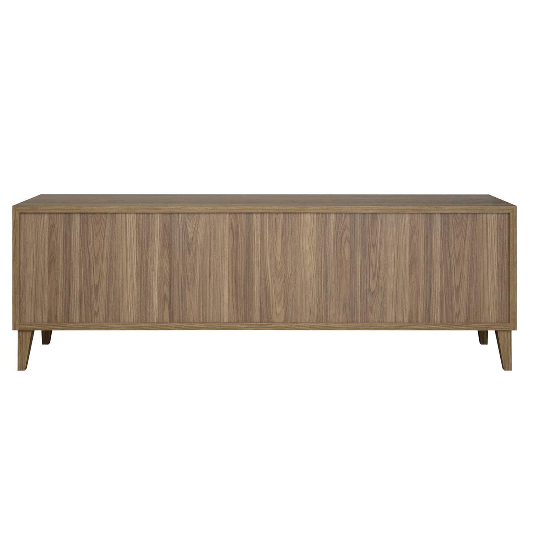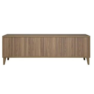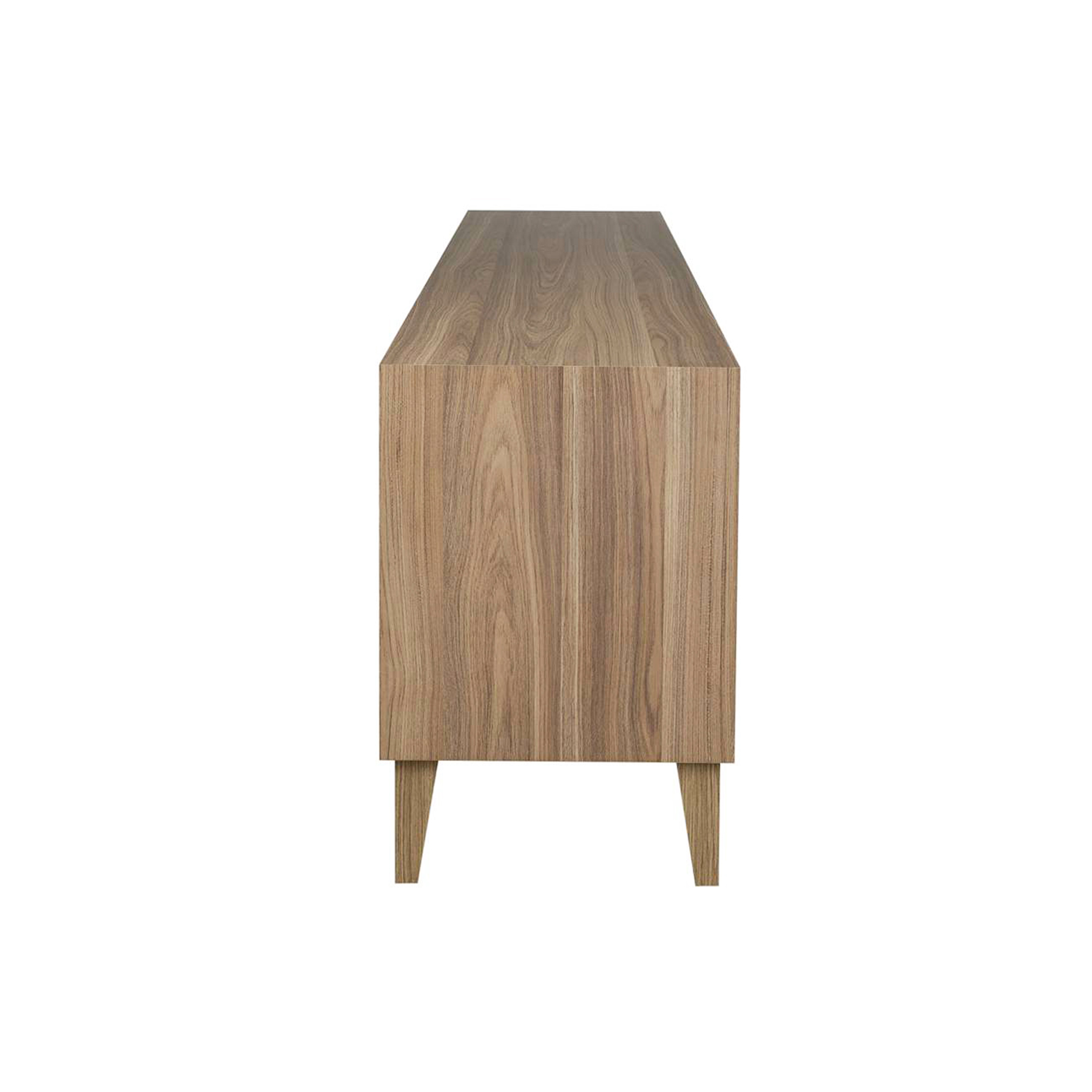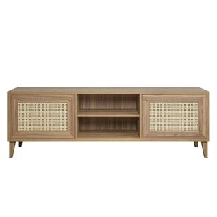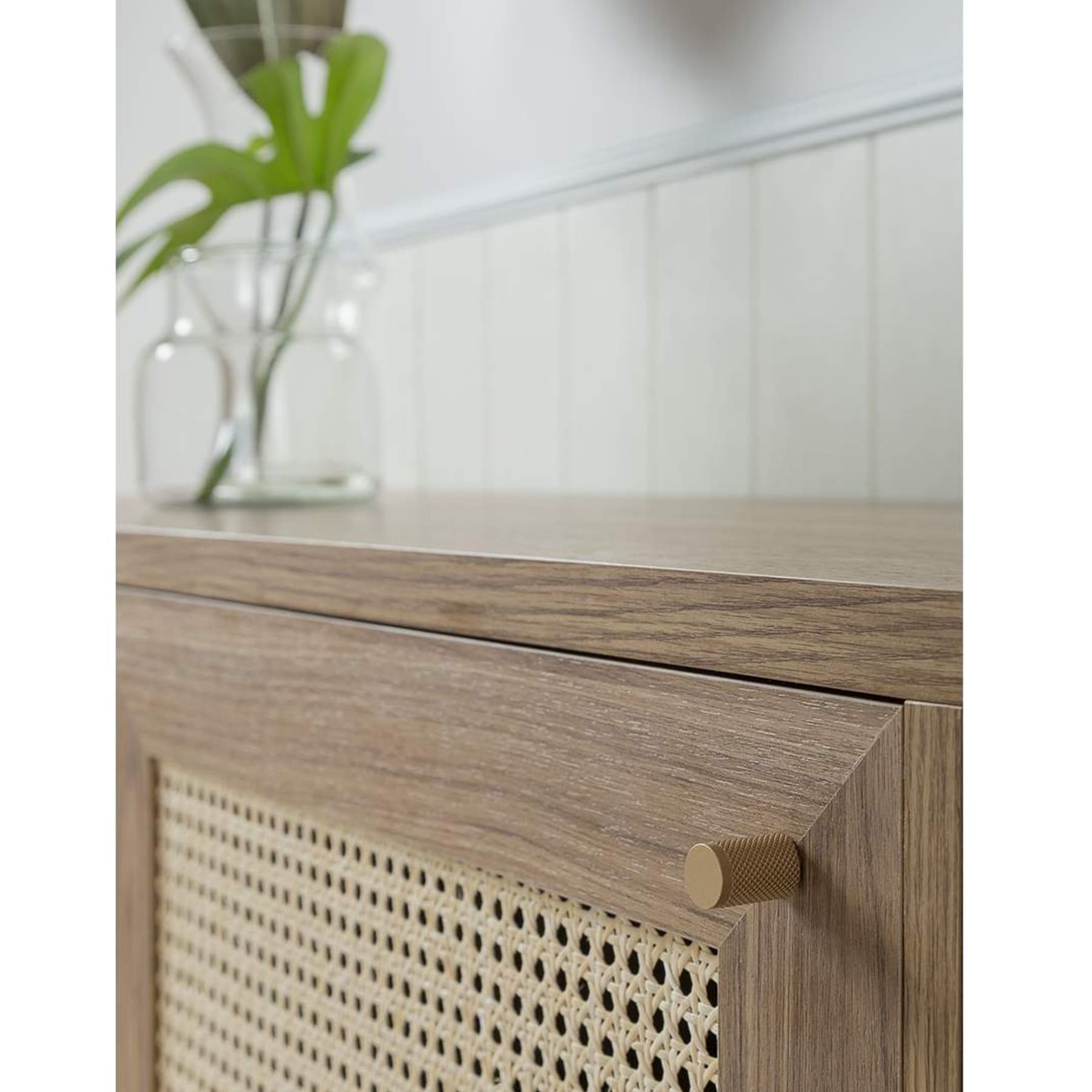 Corpo, pés e frente das portas produzidos em MDF de 25mm com acabamento em melamina BP padrão louro freijó. Puxadores em latão. Detalhes em palha de fibra natural de celulose. Prateleiras do meio com furação para passa-fios. *Produto entregue com puxadores desmontados. Montagem fácil. Não necessita montagem profissional.
