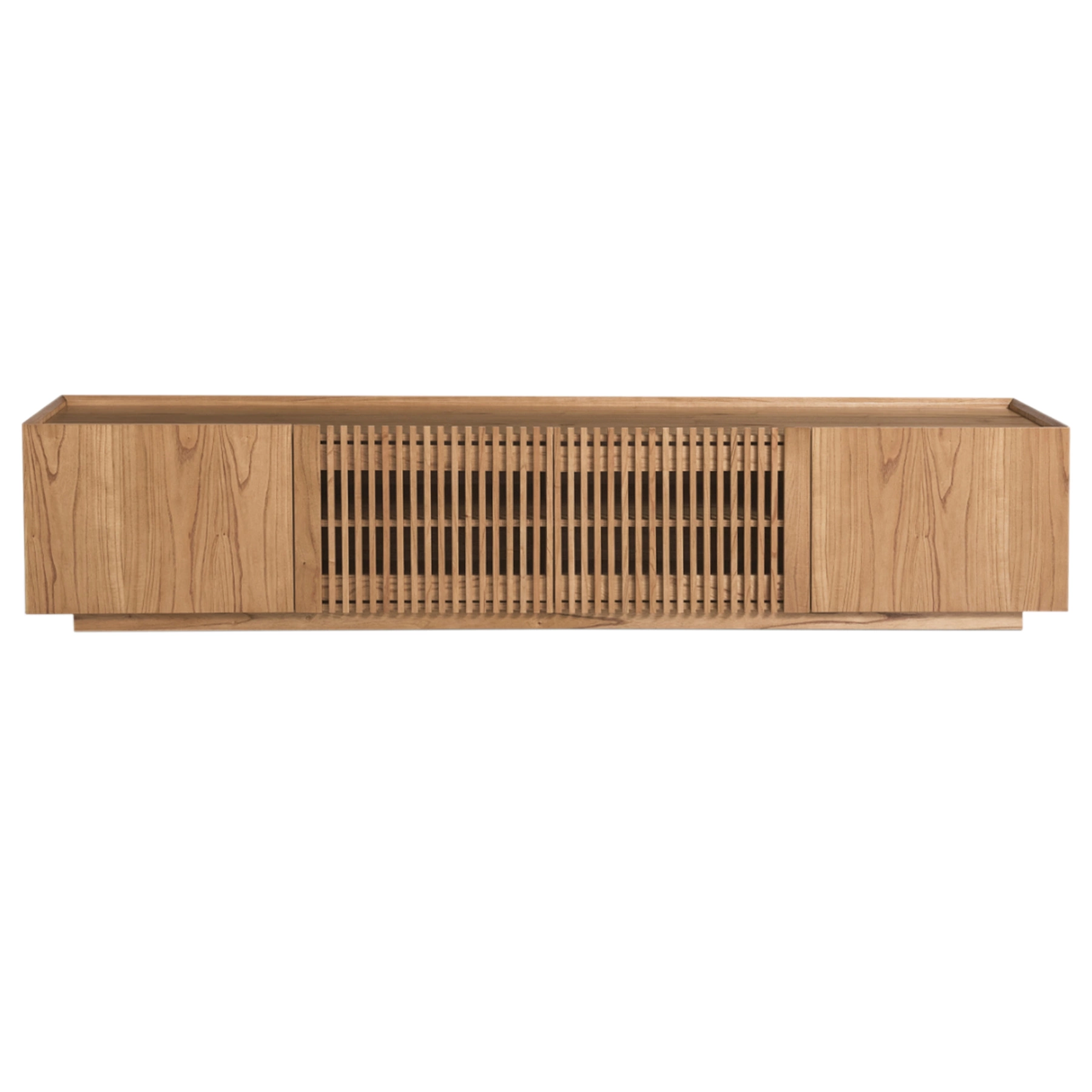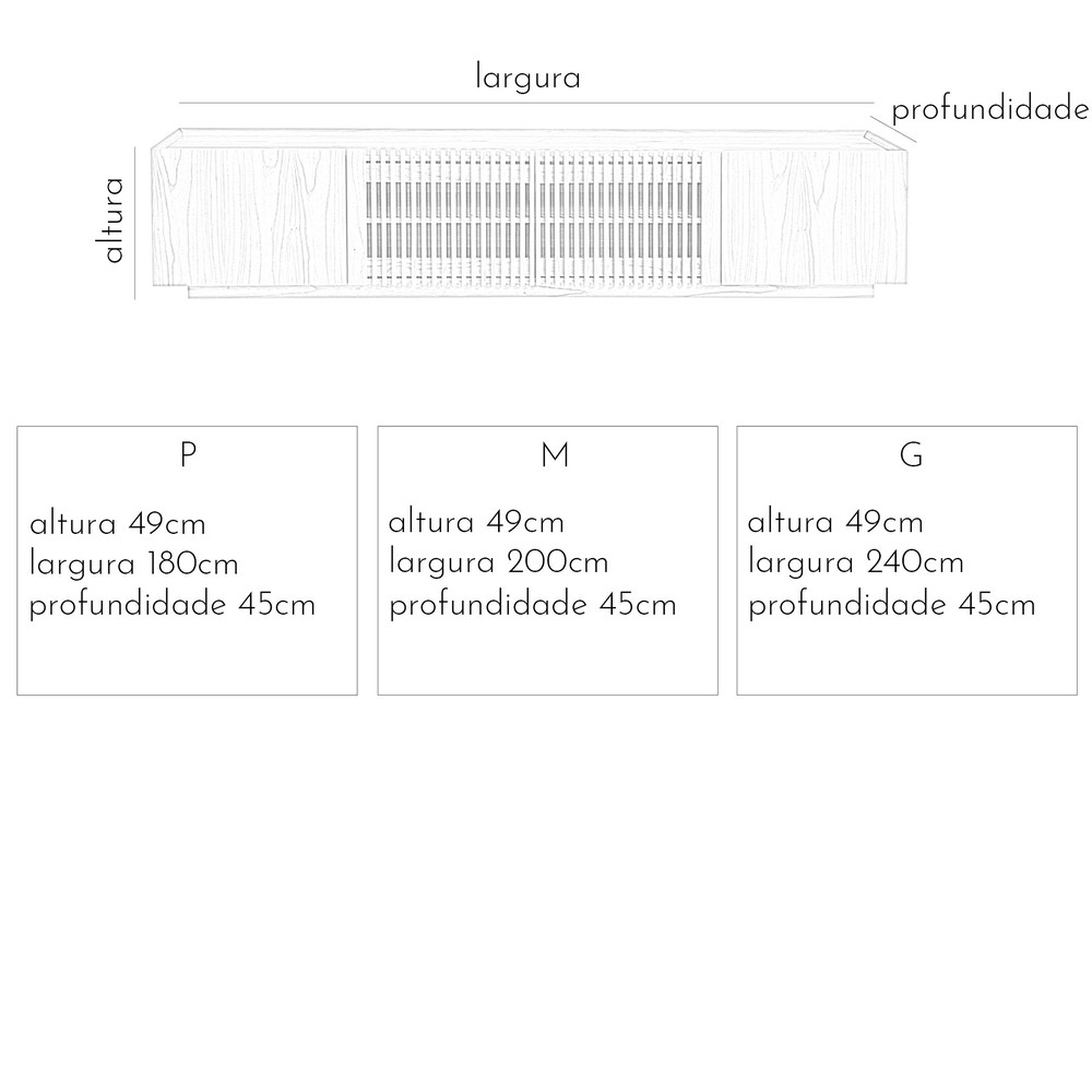 Caixa em MDF de 50mm revestido por lâmina de madeira natural cinamomo. Portas centrais ripadas com prateleira central. *Produto entregue semi-montado (pé desmontado). Nível de dificuldade de montagem: difícil. Recomendada montagem profissional. Nossa entrega não inclui içamento e/ou subida por escadas. Verifique as medidas de portas e elevadores para possibilitar a entrega.