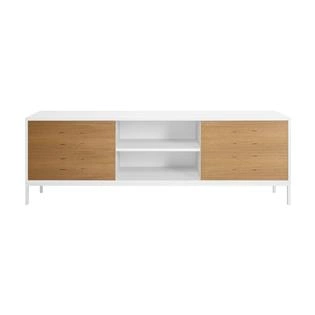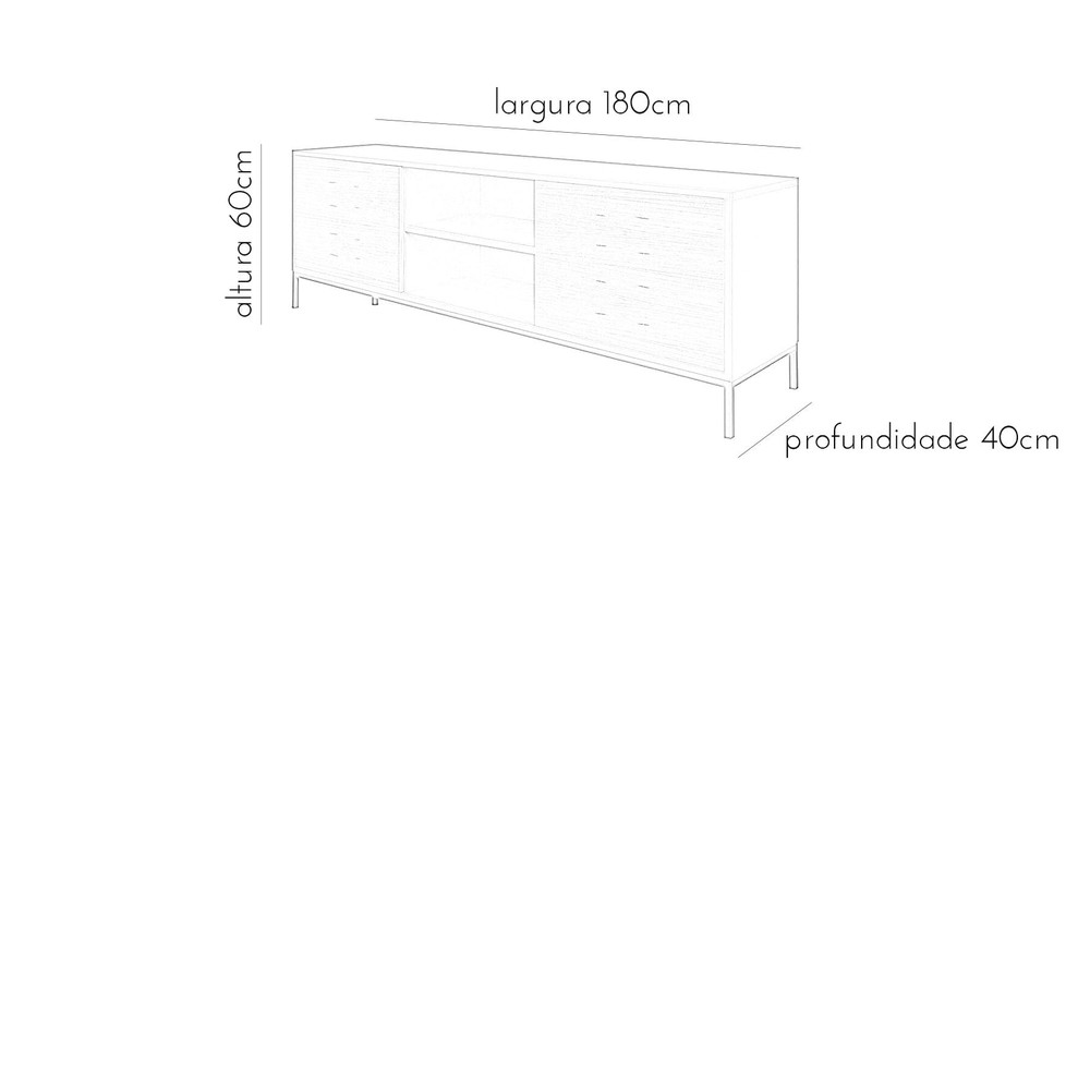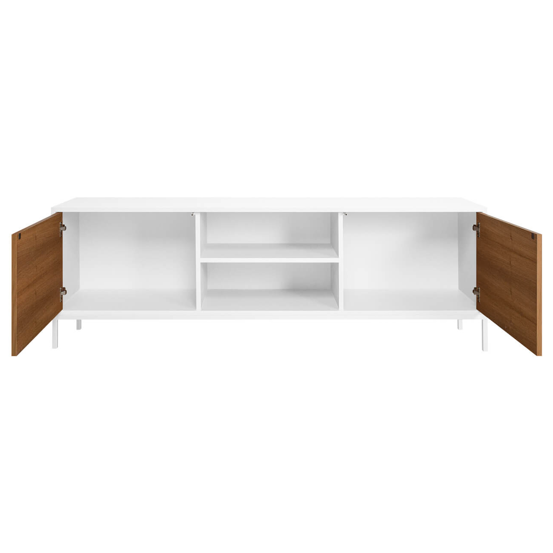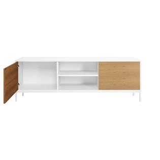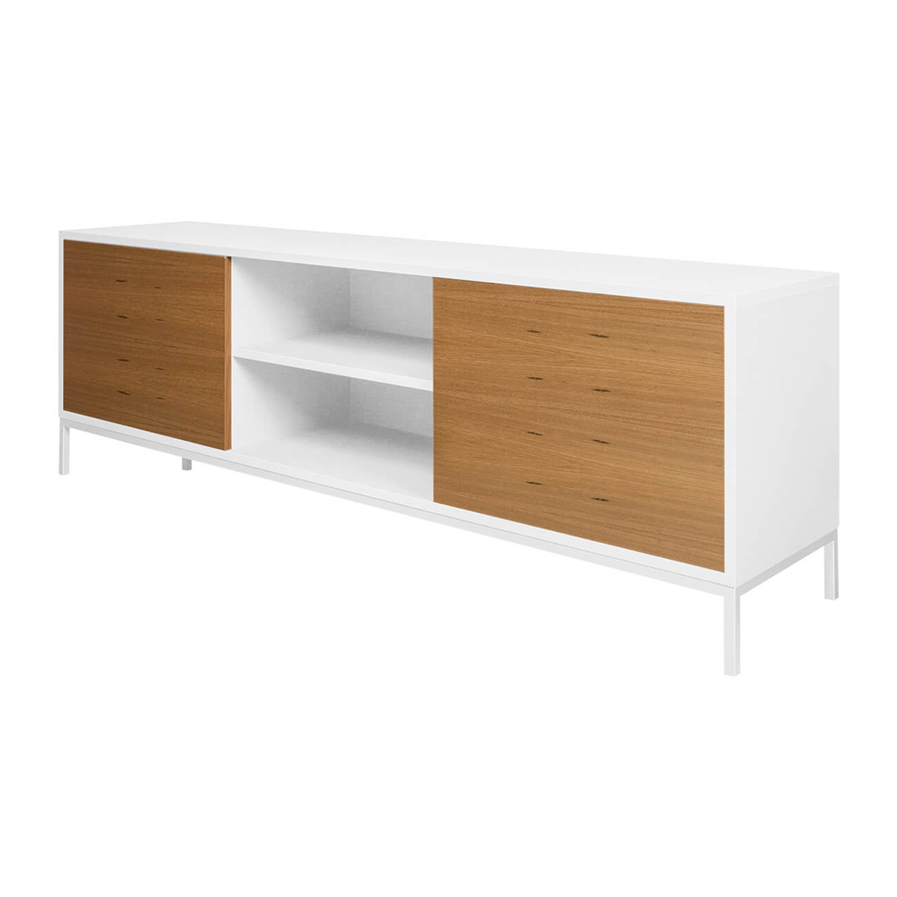Base de tubo de aço carbono de 20mm com acabamento em pintura automotiva fosca na cor selecionada. Corpo em MDF com acabamento melamina BP da marca Berneck mate padrão super white na opção branco, chumbo na opção cinza e ceramik para a cor terracota. Portas em MDF revestido com lâmina de madeira natural louro freijó com ferragens de toque. *Produto entregue semi montado. Base desmontada. Nível de dificuldade de montagem: Fácil. Não requer montagem profissional.