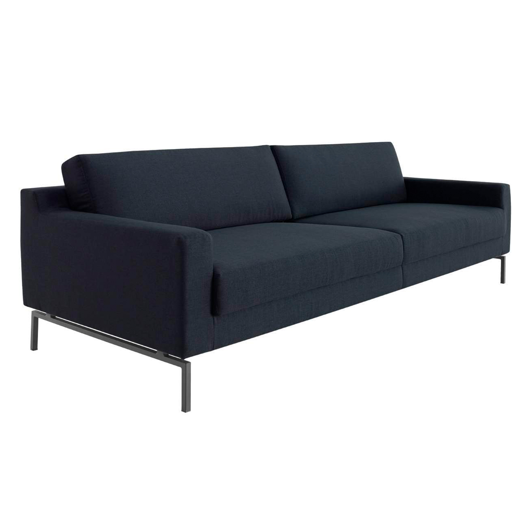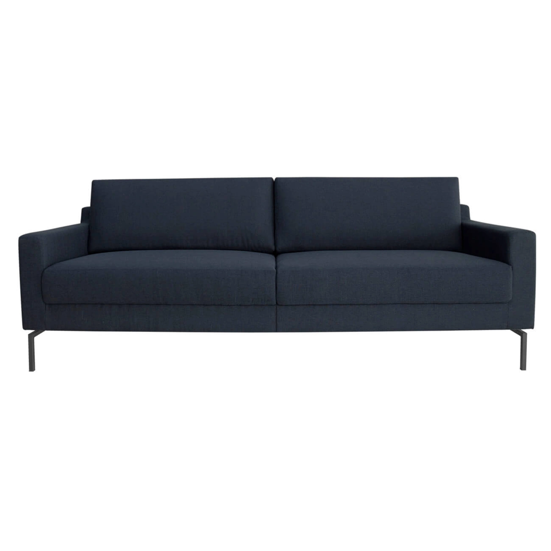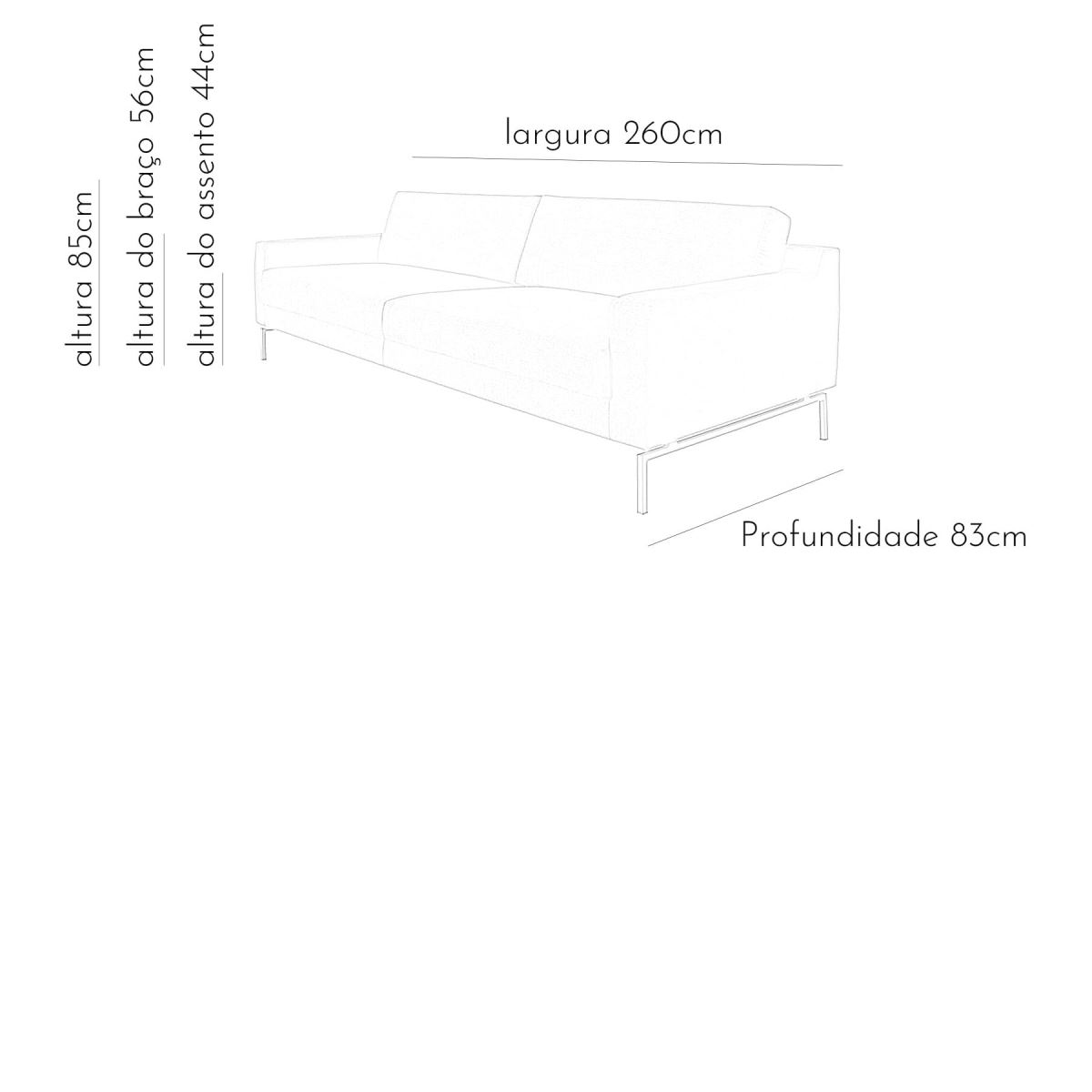 Estrutura em madeira especial para estofados. Assento em almofadas fixas, com estrutura interna em percintas italianas, estofado em espuma D30, manta acrílica hipersoft e tecido. Almofadas de encosto soltas, em espuma D26, manta acrílica hipersoft e tecido. Pés em metal com acabamento em pintura epóxi preta fosca. *Produto entregue bipartido e com pés desmontados. Nível de dificuldade de montagem: médio. Não necessita montagem profissional.
