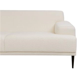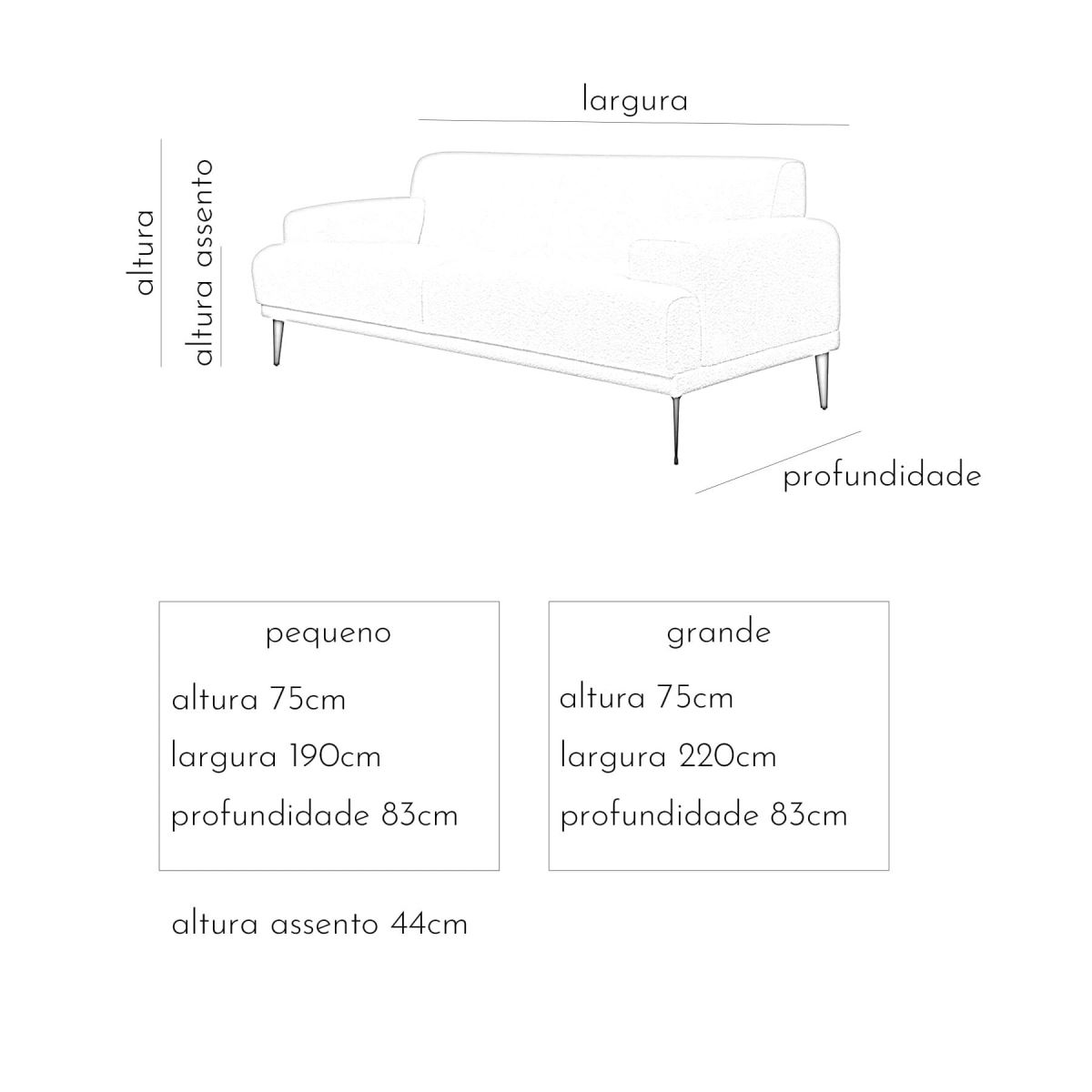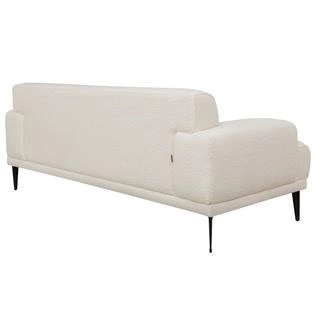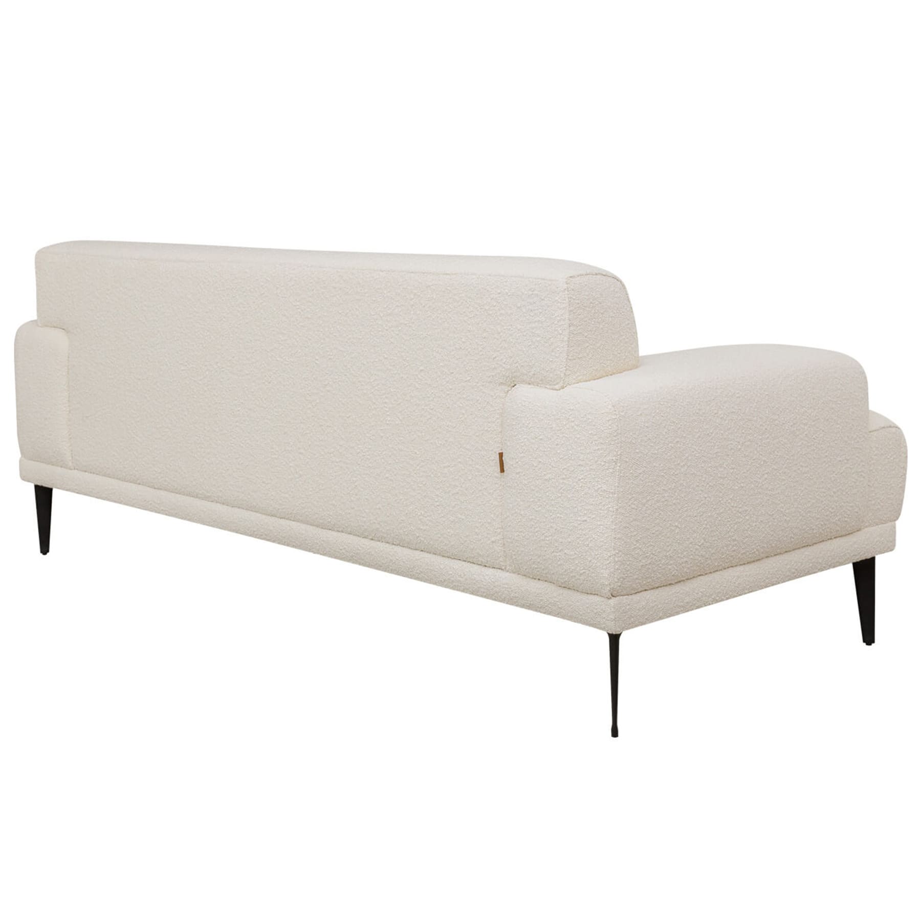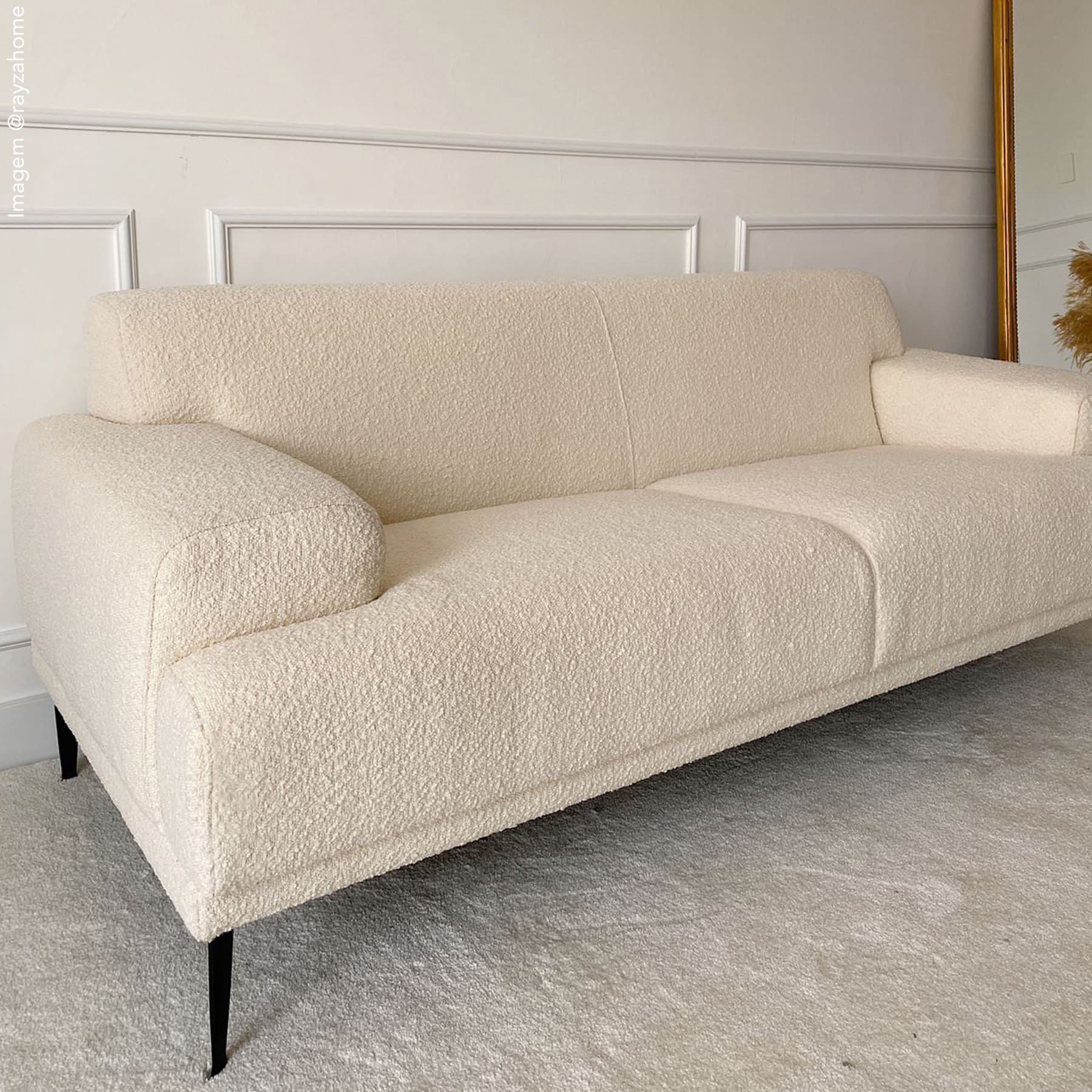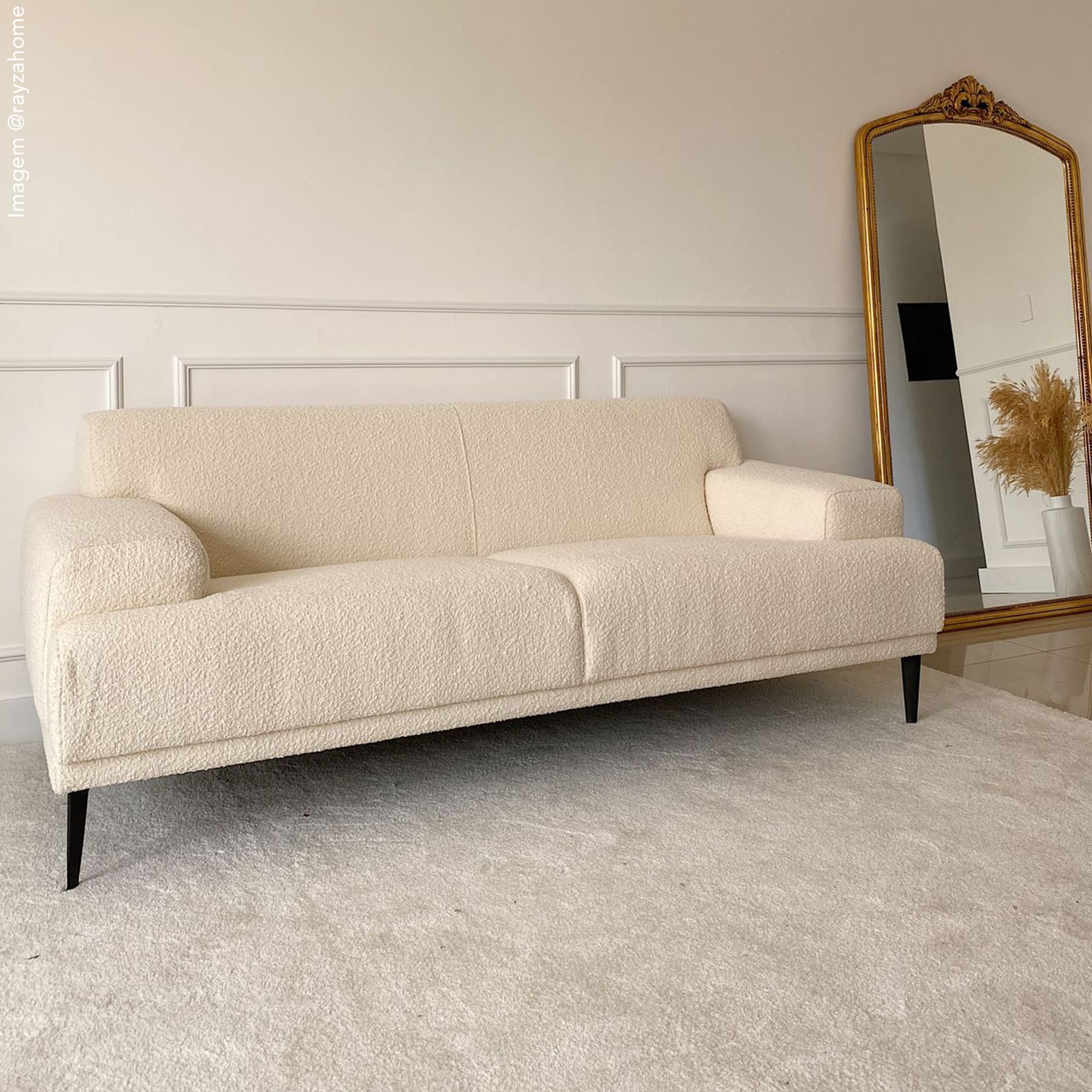 Estrutura produzida em madeira maciça tratada para estofaria. Assento fixo com estrutura em percintas italianas, estofado com espuma D33 hipersoft e tecido bouclê. Encosto fixo em espuma D26 soft com hipersoft. Pés em alumínio fundido com pintura epóxi preto. *ATENÇÃO: este produto é entregue semi montado (com os pés desmontados). Montagem fácil. Não necessita montagem profissional. Nossa entrega não inclui montagem, subidas por escadas a partir de dois andares ou içamento. Verifique se as medidas de elevadores e portas para entrega.