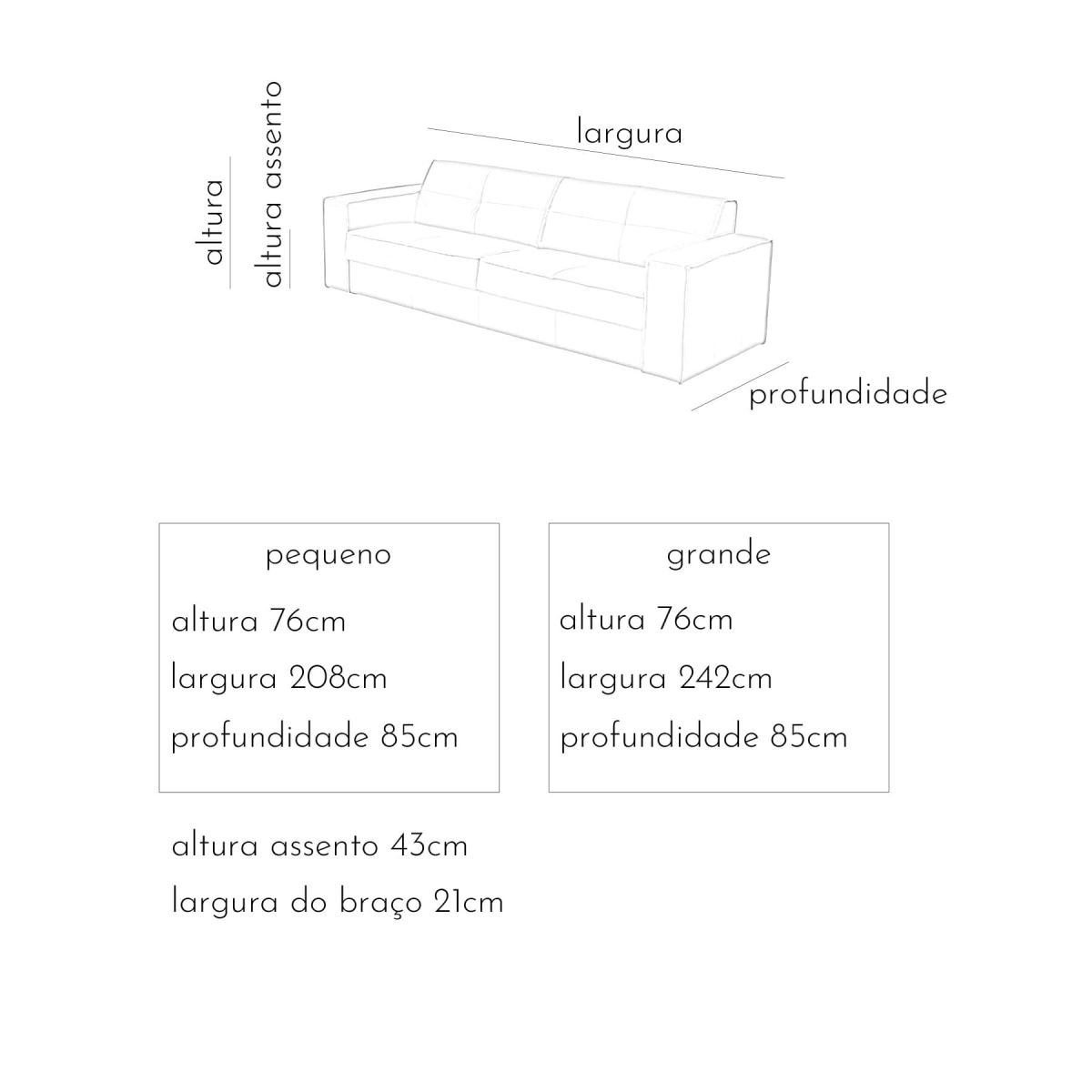 Estrutura em madeira maciça eucalipto de reflorestamento tratada para estofaria. Estrutura de assento com molas softspring (sistema de posicionamento especial que resulta em maior conforto e durabilidade). Almofadas de assento fixas em espuma D35 HCR e D30 HCR e manta siliconada. Almofadas de encosto fixas em espuma D28 e manta siliconada, com estrutura em percintas. Pés em madeira. Estofado em 100% couro natural com acabamento fosco. *ATENÇÃO: Este produto é entregue montado e não pode ser bipartido, somente ter os braços desmontados. Verifique as medidas de portas e elevadores para entrega. Nossa entrega não inclui montagem, subida por escadas a partir de dois andares ou içamento.