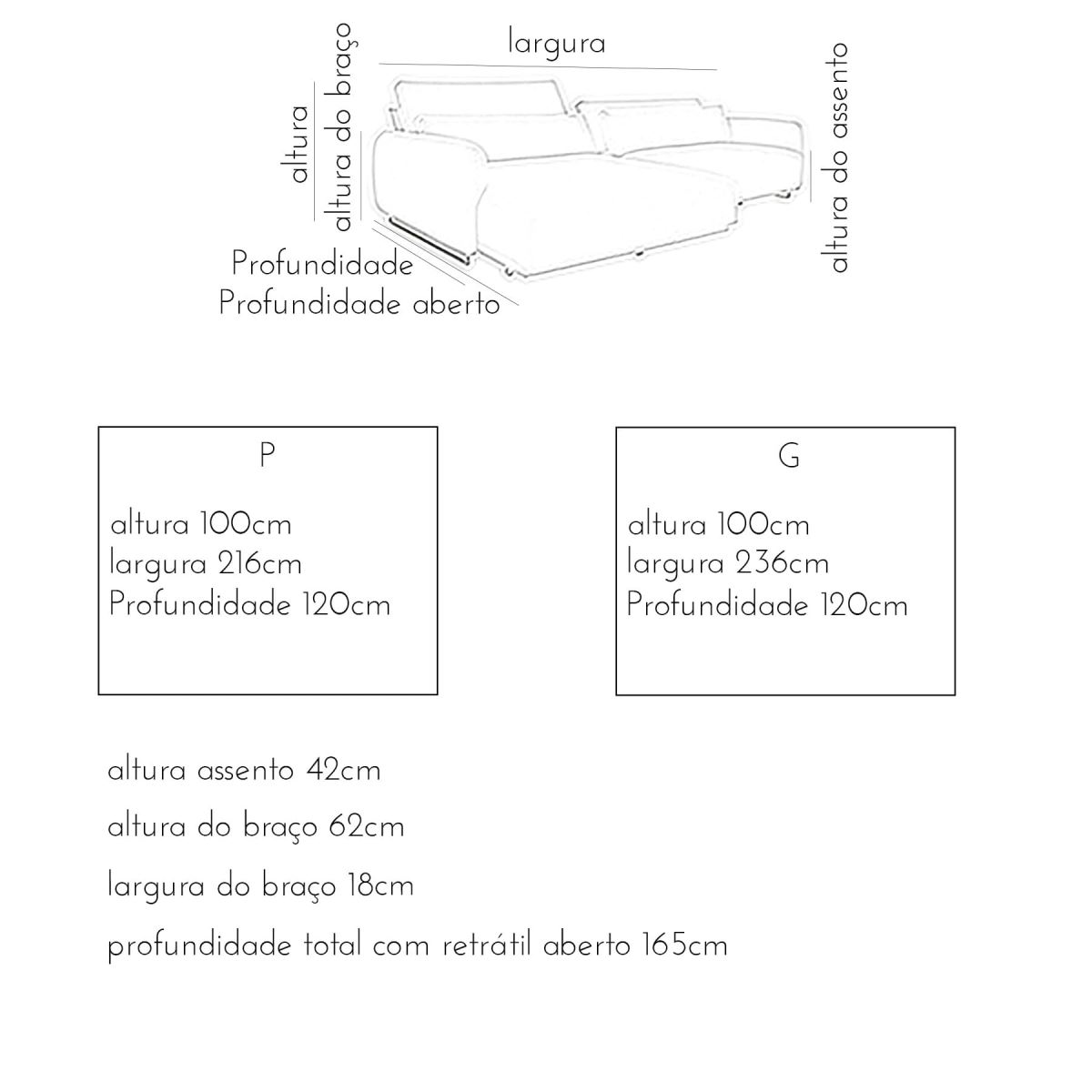 Estrutura em madeira especial para estofaria. Assento retrátil em percintas italianas e molas bonnel, estofado com espuma D33 hipersoft e tecido. Encosto com almofadas soltas em espuma D26 hipersoft e mecanismo manual rebatível em madeira estofado. Almofadas lombares em fibra siliconada. Pés em aço carbono com pintura epóxi preta. *Produto entregue semi montado. Bipartido. Nível dificuldade montagem: média. Não necessita montagem profissional. **ATENÇÃO: nossa entrega não inclui montagem, subida por escadas e/ou içamento. Verifique as medidas do produto, elevador e portas.