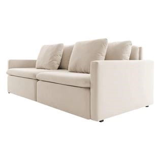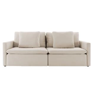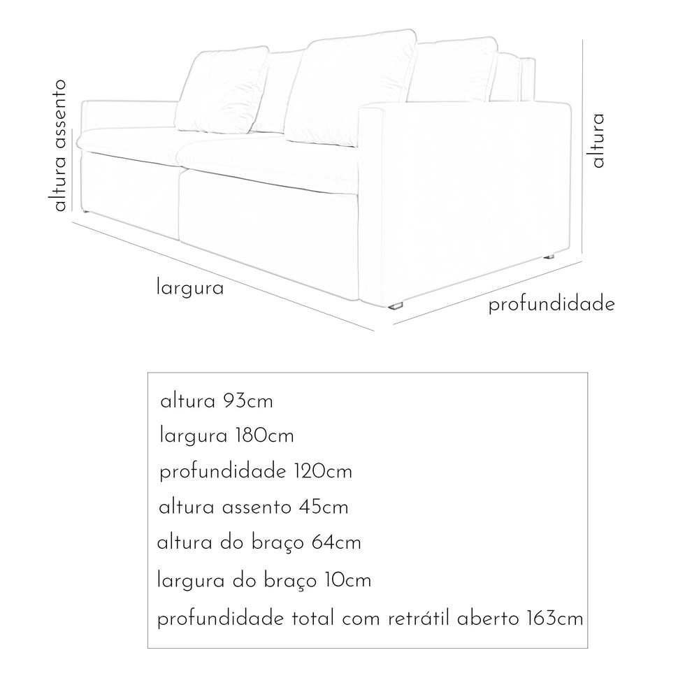 Estrutura em madeira eucalipto de reflorestamento tratada para estofaria. Estrutura do assento com percintas italiana e almofadas soltas em espuma D28 mastersoft e fibra manta de 150gr. Encosto em almofadas soltas em espuma D26. Almofadas decorativas em fibra siliconada. Pés em madeira maciça. *Produto entregue bipartido. Nível de dificuldade de montagem fácil. Não é necessária montagem profissional.