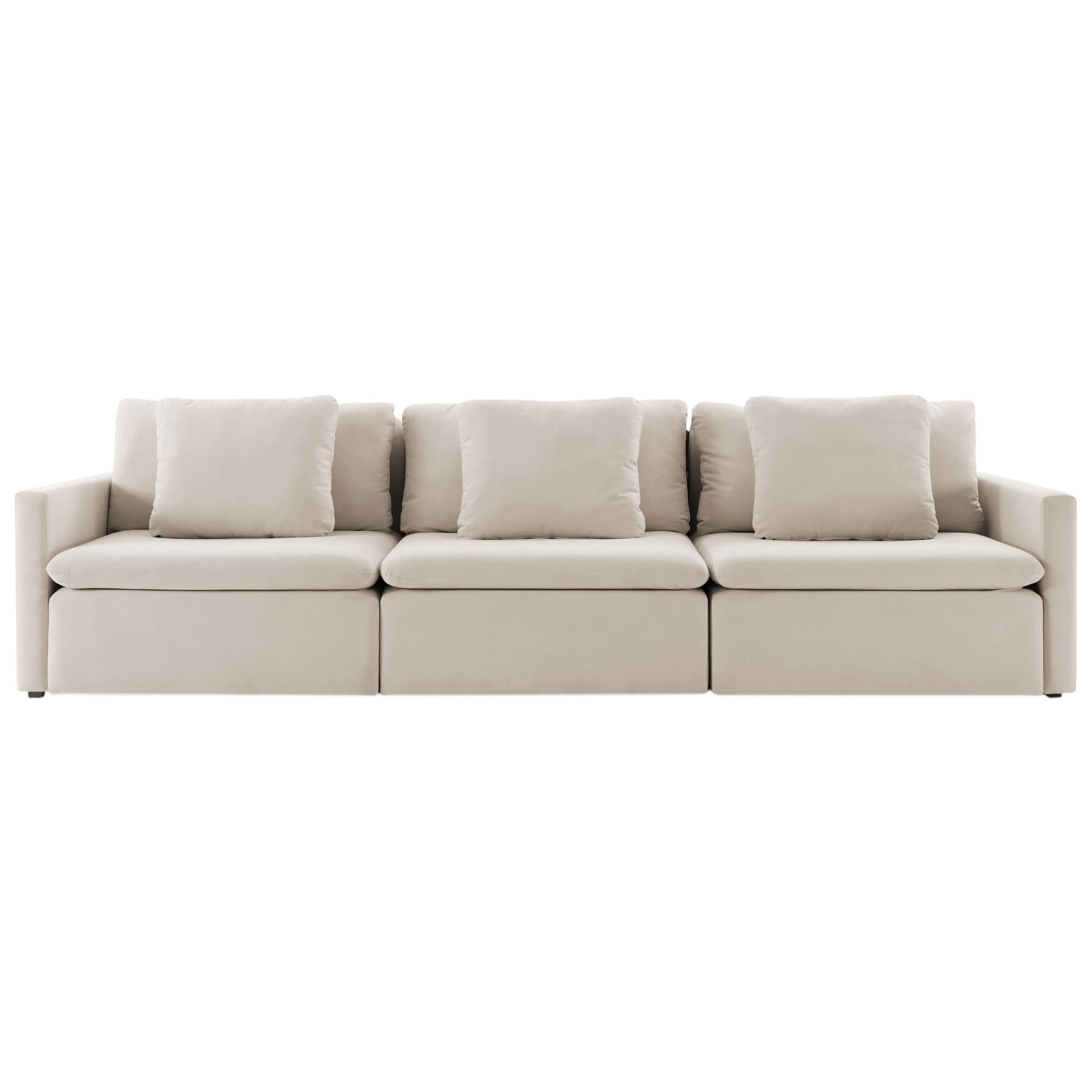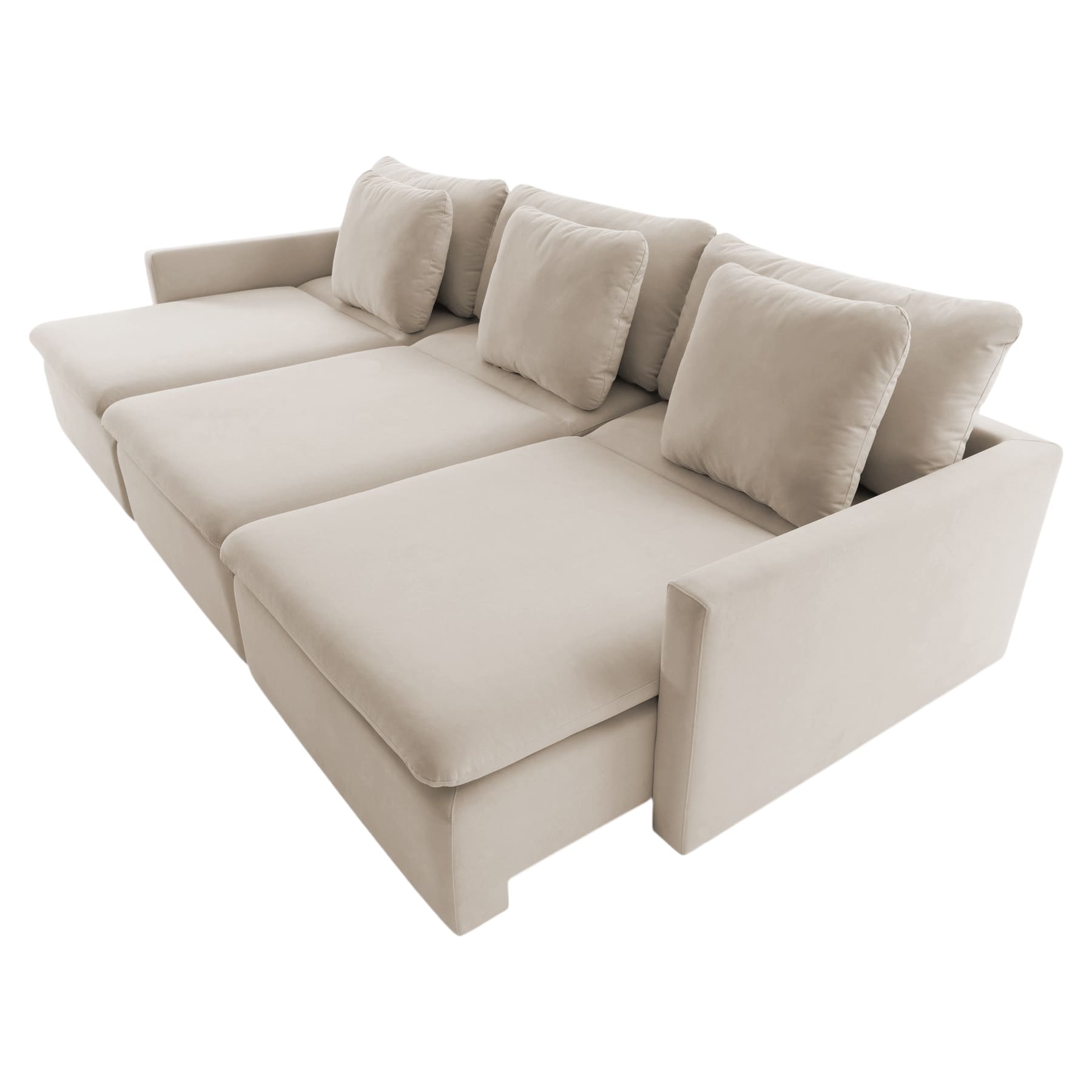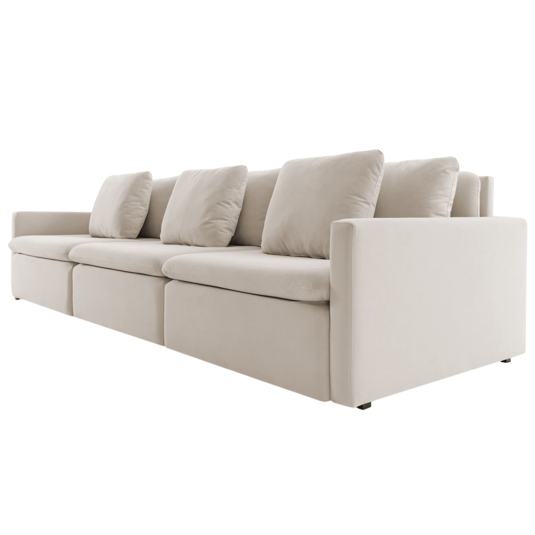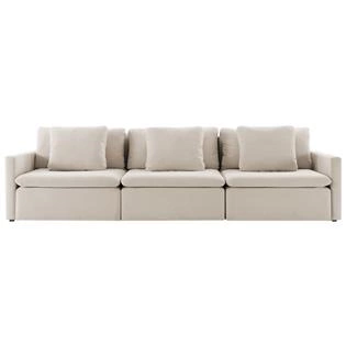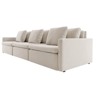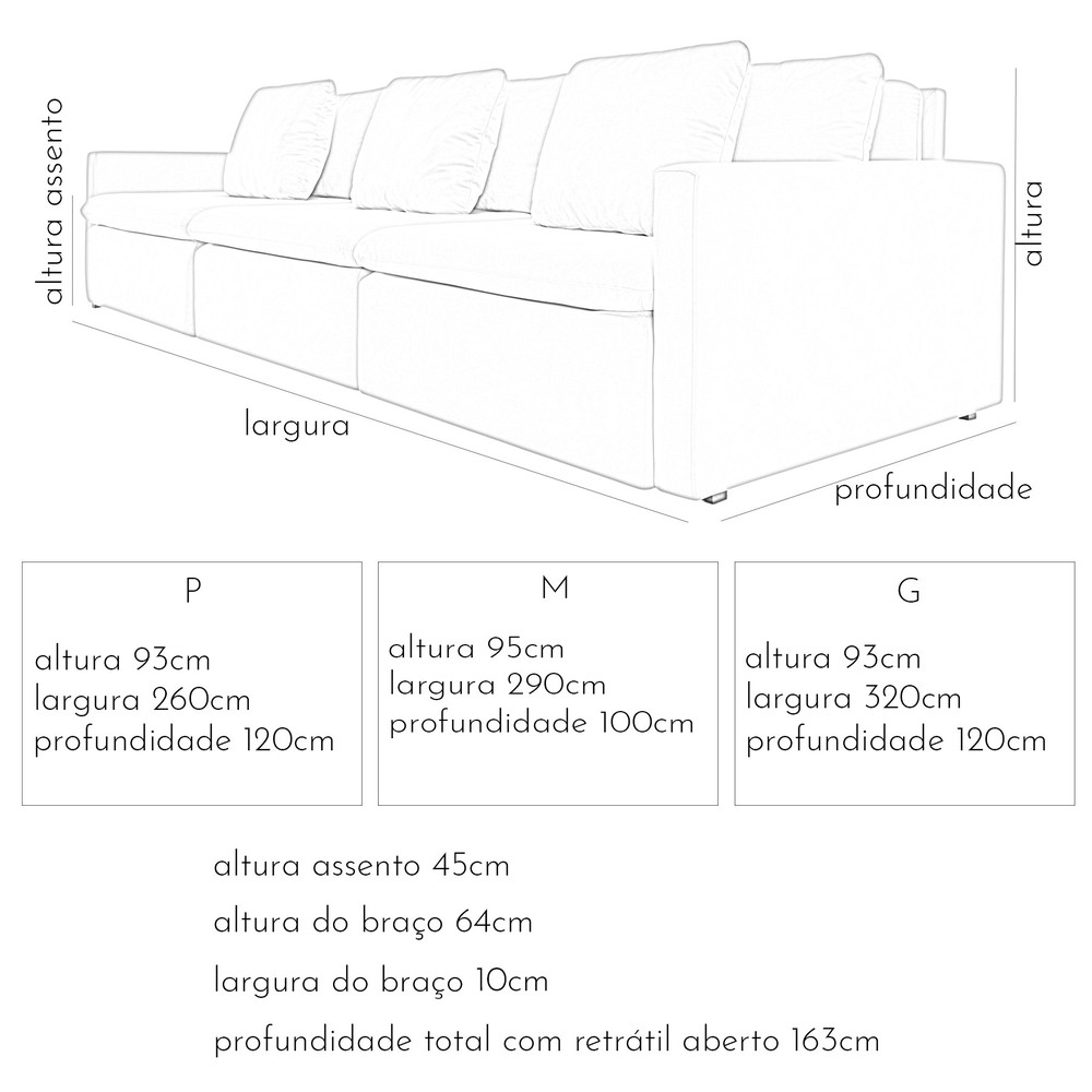 Estrutura em madeira eucalipto de reflorestamento tratata para estofaria. Estrutura do assento com persintas italiana e almofadas soltas em espuma D28 mastersoft e fibra manta de 150gr. Encosto em almofadas soltas em espuma D26. Almofadas decorativas em fibra siliconada. Pés em madeira maciça. *Produto entregue bipartido. Nível de dificuldade de montagem fácil. Não é necessária montagem profissional.